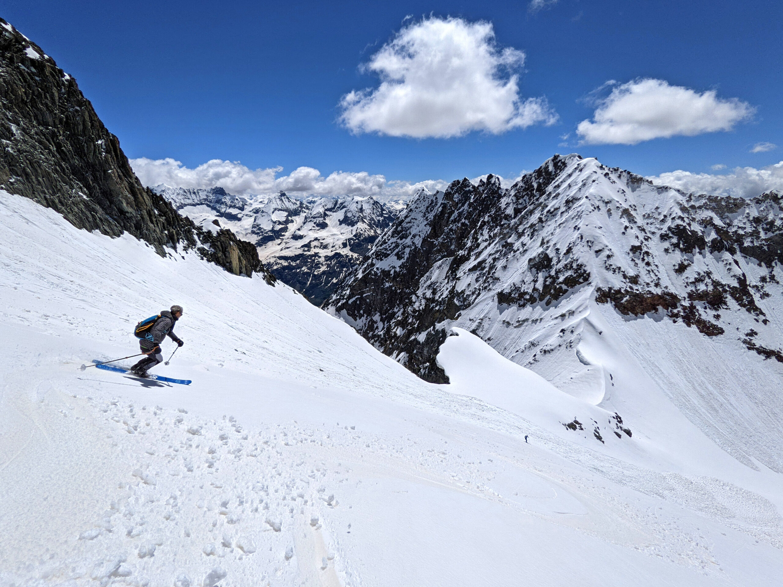 Si spalla sulla strada e poi sul sentiero fin verso i 2300m dove la valle gira verso Est. Da lì neve subito continua e ben trasformata, dai 2700m circa liscia come un biliardo. Pendio finale in parte svalangato ma molto bello da sciare. Tracciato la cresta sul versante Otemma, servono picca e ramponi non leggeri, eventualmente corda.