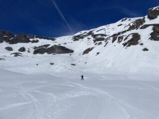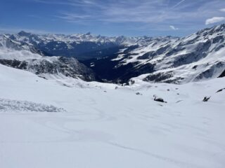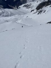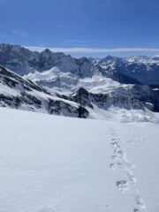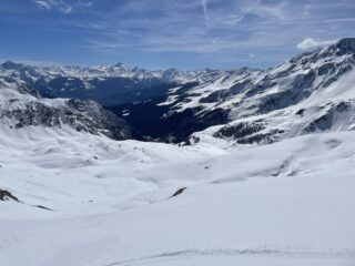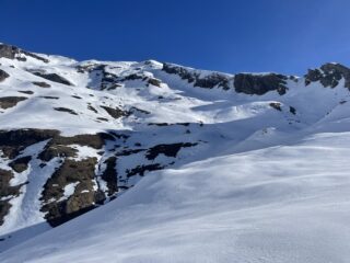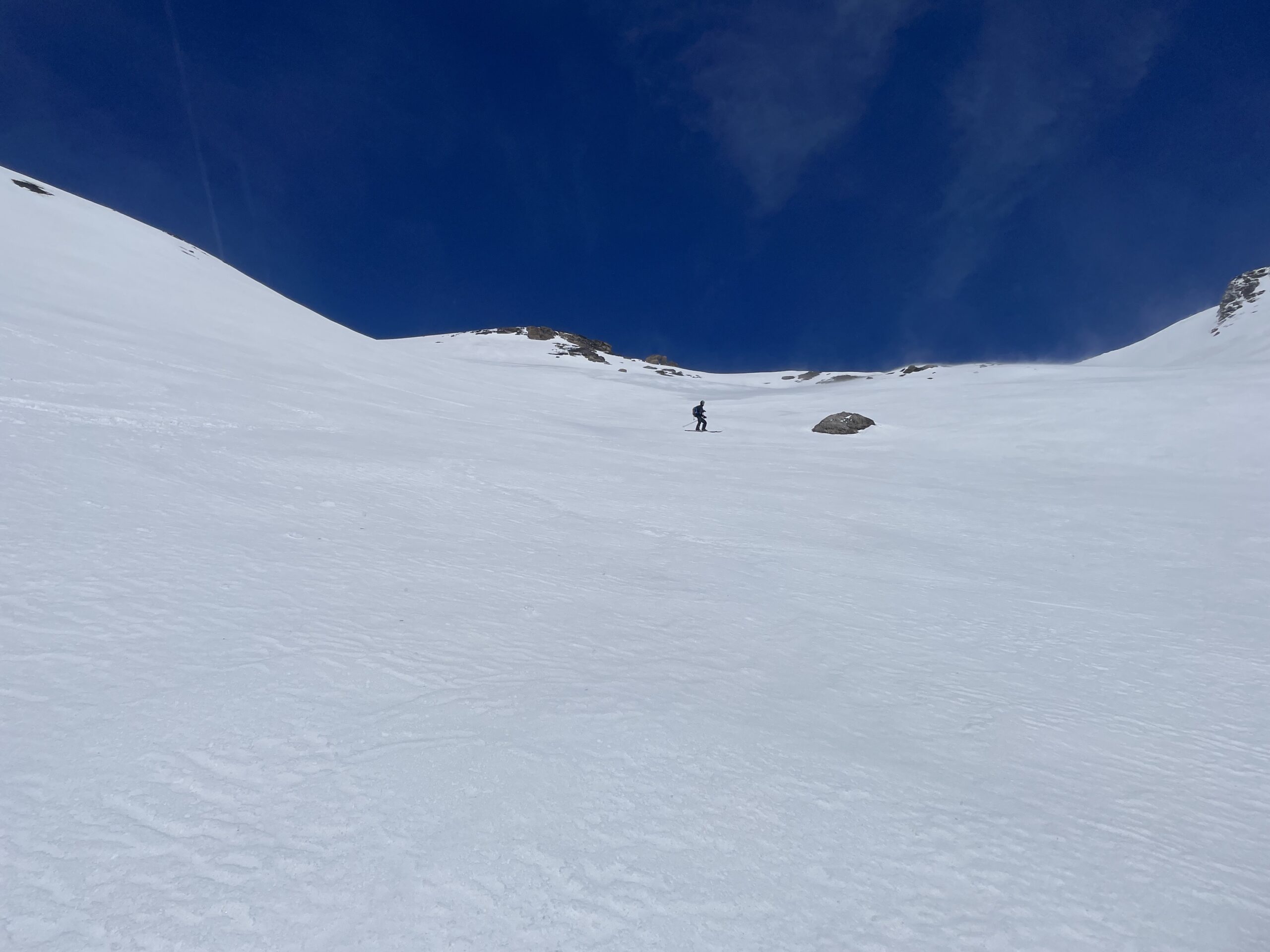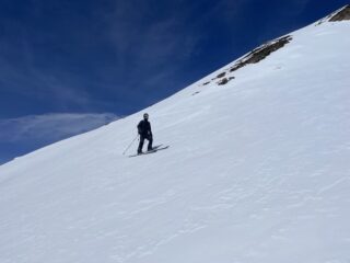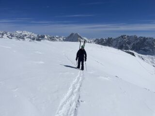 Come d’abitudine si spalla per 400mt fino al lago. Rigelo notevole fino in cima. Per cui rampant per buona parte della salita e sci in spalla nel canale ripido e nel tratto finale prima della cima. Vento fastidioso solo in cima e in aumento durante la discesa che è stata semplicemente strepitosa. Ancora un po’ duretta i primi 300 metri poi una cremina perfetta su neve dura. Vista incredibile dalla cima. Solo noi e tre altri scialp che ci precedevano di un oretta in tutto il vallone. Bella gita su pendii ripidi io giusto per grandi sciate. Con Gabri.