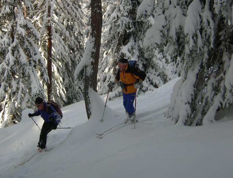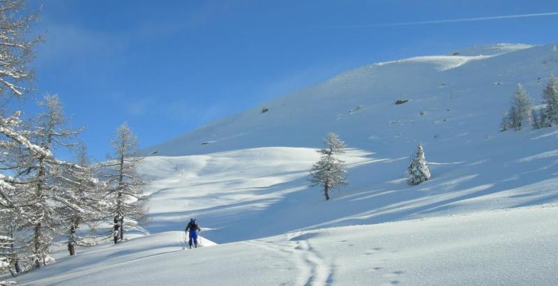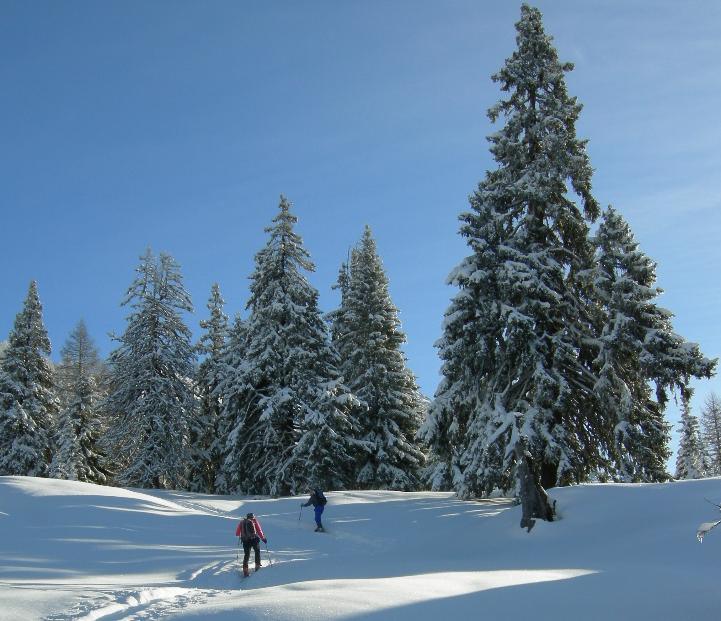 Da qui risalire nel bosco seguendo il tracciato del sentiero estivo fino a Niwhitte, Q 1896 m, caratterizzata da un’enorme antenna, salire ancora in terreno più aperto in direzione E fino a Randstafel, Q 1983 m, proseguire per il versante N finoa raggiungere Maellige, Q 2204 m, salire ancora e passare a S della punta di Holiecht, quotata 2355 m, risalire quindi in direzione SE il canale fino al colletto a quota 2650 m circa.