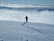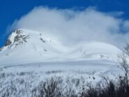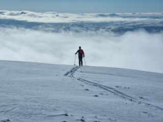 Proseguire per 100 m circa sulla strada sci ai piedi e sulla sinistra si trova il classico cartellone di partenza scialpinistico con il controllo ARVA. Dopo un breve passaggio nel bosco verso la dorsale sulla destra, si intercetta la linea taglia-fuoco, che va seguita fino ai pendii alti aperti. Facendo un largo semicerchio verso sinistra, puntare al vallone mediano e salirlo fino al colle. Voltare poi a sinistra e in breve si è in punta.