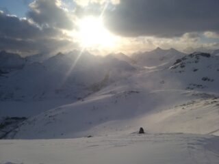 Neve ventata ma non crostosa lungo tutto il percorso. Più che altro davano un po’ fastidio le tracce vecchie sotto la neve riportata dal vento.