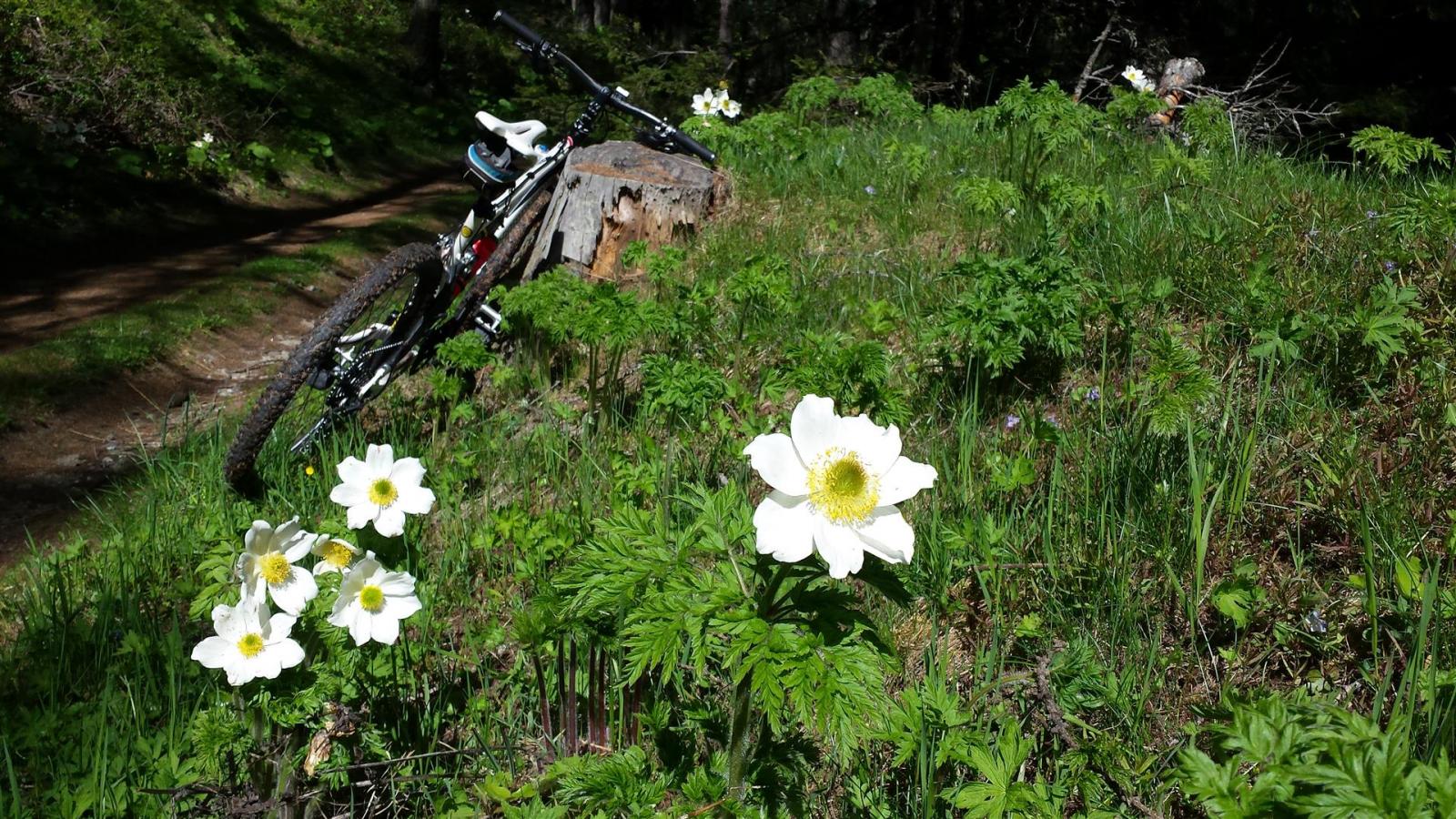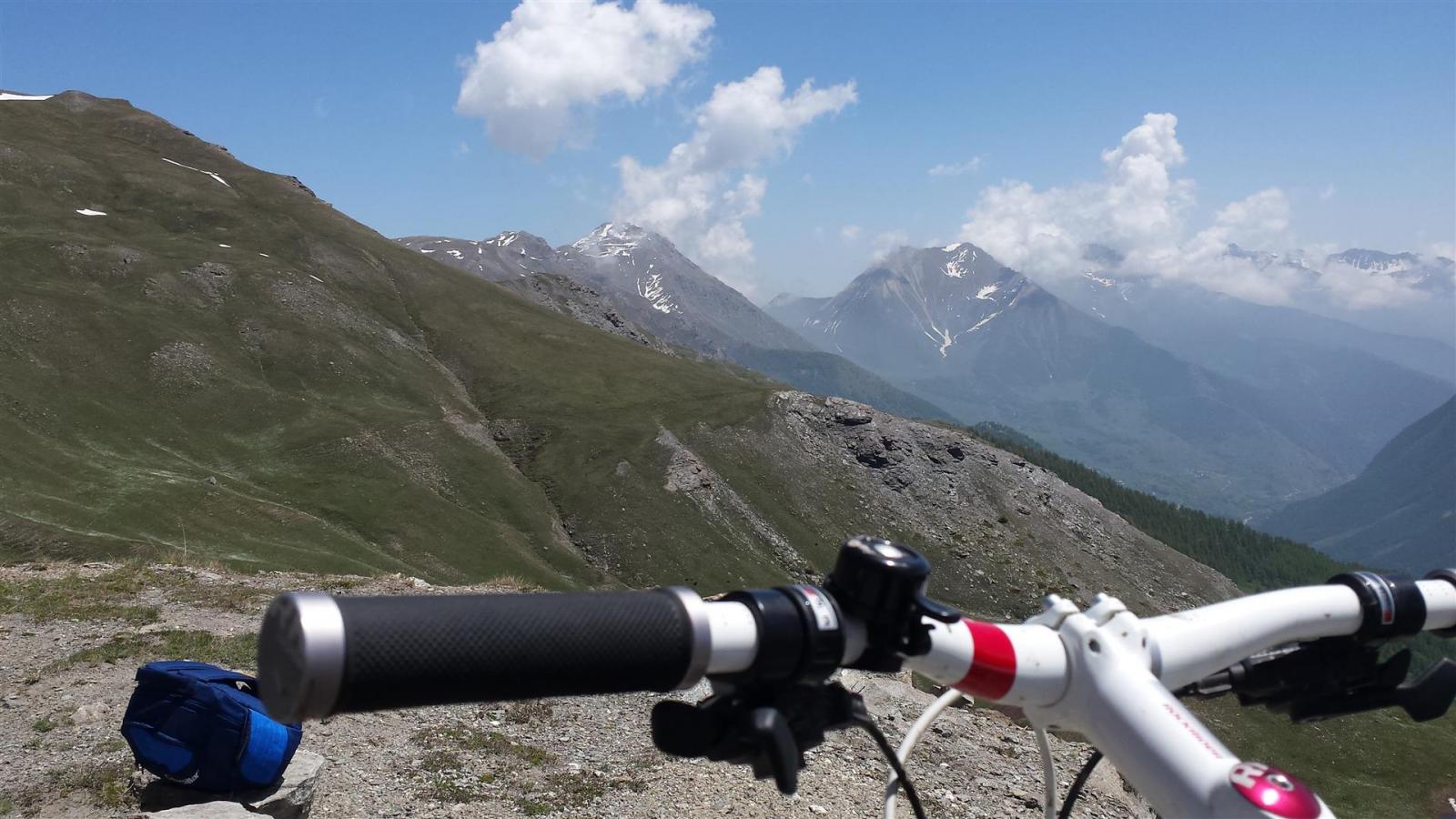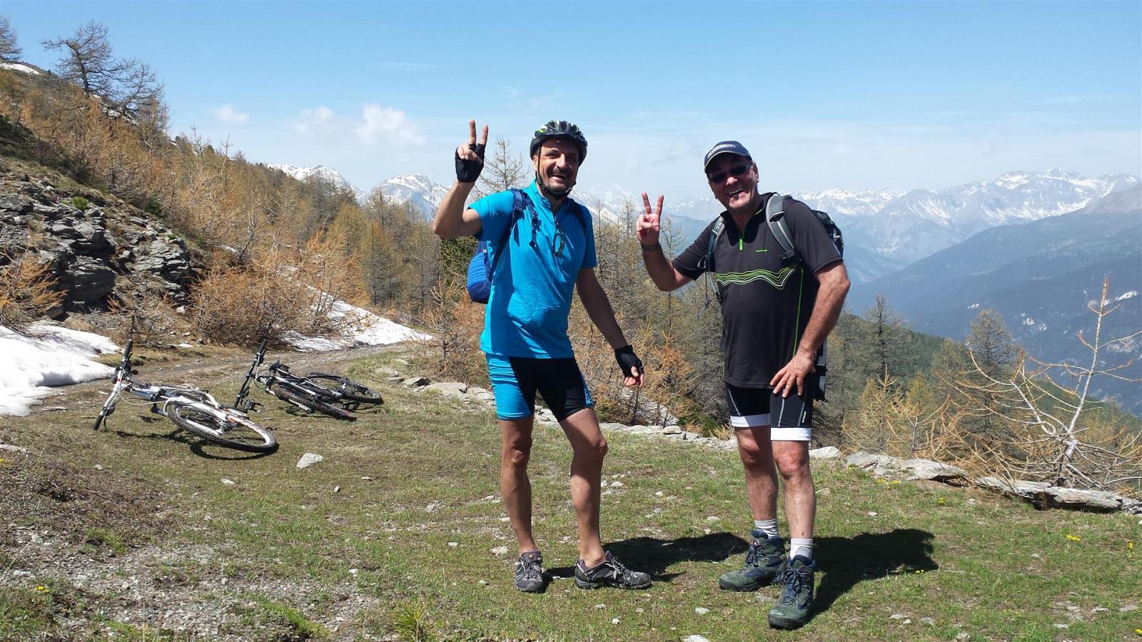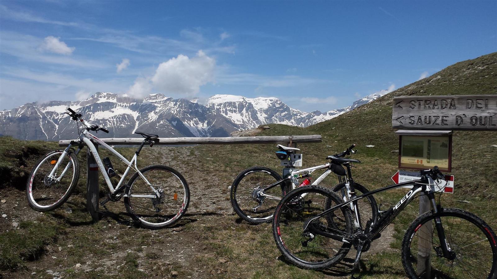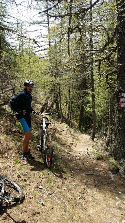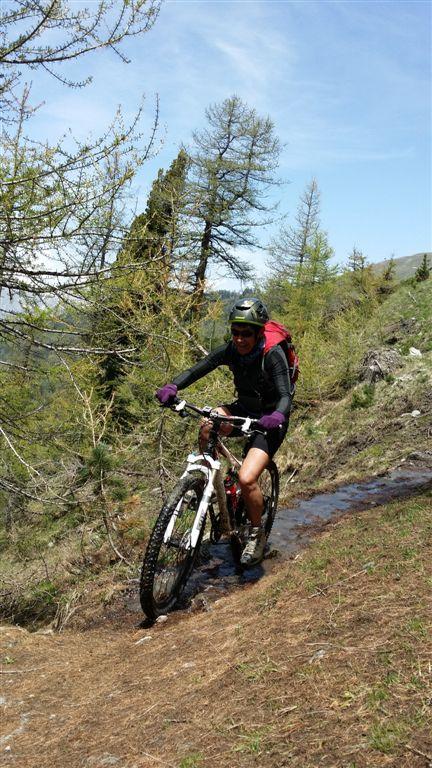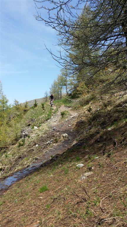 Primi 100 mt dsl discontinui per presenza di neve ma poi, per i restanti 1400 mt dsl, discesa spettacolare su bel sentiero con fondo compatto e presenza di alcune radici, pietre e ruscelletti per disgelo che non compromettono assolutamente la ciclabilità . Il sentiero dei Cannoni va poi ad immettersi con la sterrata percorsa in salita. La si percorre per un breve tratto ed in prossimità del parcheggio Serre Blanche l’abbiamo abbandonata e proseguito su sterrata a dx, sempre in perfette condizioni, che con innumerevoli tornanti arriva a Salbertand. Lì, al mattino, avevamo lasciato una vettura utile per il recupero della seconda a Jouvenceaux.