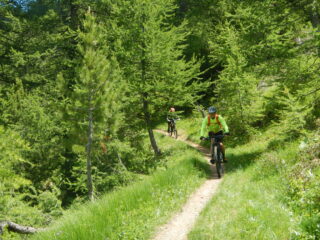 Lo sterrato che prosegue verso il Colle Blegier risulta più più impegnativo con diversi strappi più sostenuti…in ogni caso la salita nel Gran Bosco è sempre piacevole.