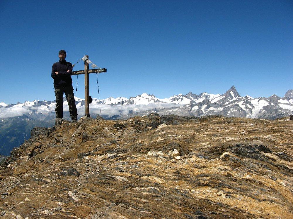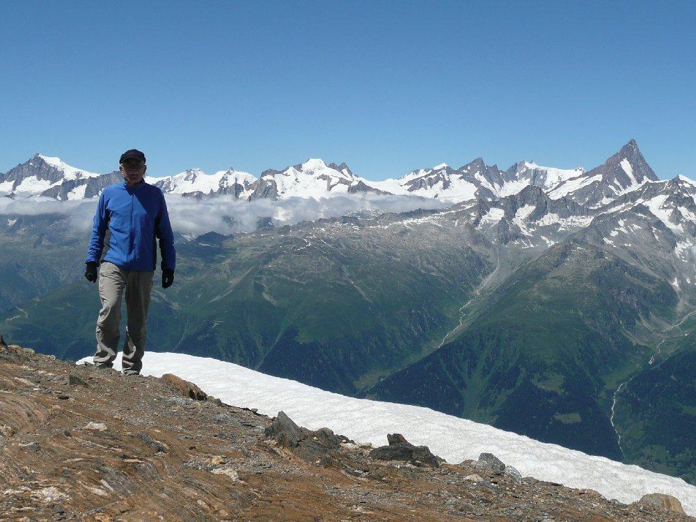 Finalmente una salita spettacolare con meteo perfetto. Saliti in giornata passando dal rifugio Mores e poi attraversando la diga siamo giunti al Claudio Bruno in cui abbiamo fatto una breve pausa. Restano solo poche lingue di neve sopra i 3000 metri, nessun problema. Solo l’ultimo tratto del pendio finale si presenta un po’ delicato a causa di sfasciumi e pietrisco ma la parte esposta è molto breve, se è asciutto non ci sono problemi, solo in discesa ci siamo aiutati con le mani per cui direi F come difficoltà. Il panorama dalla cima è super, molto belli i ghiacciai intorno alla cima e al Lago del Sabbione, spettacolare il colpo d’occhio dalle vicinissime alpi Svizzere, al Rosa, fino al Bianco. Gita abbastanza impegnativa per lo sviluppo. Bei posti, peccato siano un po’ lontani e scomodi. Anche l’ascensione alla vicina Arbola attraverso il ghiacciaio omonimo sembra essere una metà molto attraente anche se il Blinnenhorn dovrebbe superarla di molto come punto panoramico per la sua posizione e la sua altezza. Ben frequentate entrambe le cime da vari gruppi partiti dai vari rifugi della zona. I ghiacciai della zona sembrano tranquilli, molti salivano slegati, ottimi per allenarsi sul ghiaccio, niente a che vedere con quelli visti due giorni prima in zona M. Bianco. Al mattino era presente la corsa tra i rifugi, una gara cui hanno partecipato un centinaio di atleti. In prossimità di alcune pietraie le persone che assistevano la corsa ci hanno scherzosamente chiesto se noi avevano perso la pettorina col numero, segno che proprio piano non andavamo, abbiamo impiegato circa 4 ore per l’intera salita. Per la discesa siamo passati lungo il rio del Sabbione sotto la diga, i cartelli indicano di passare con cautela per il pericolo di onde improvvise nel caso aprano la diga.