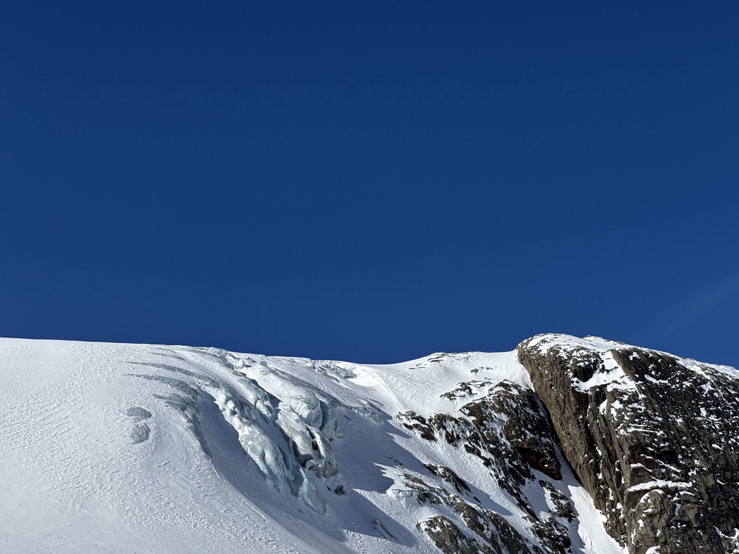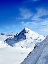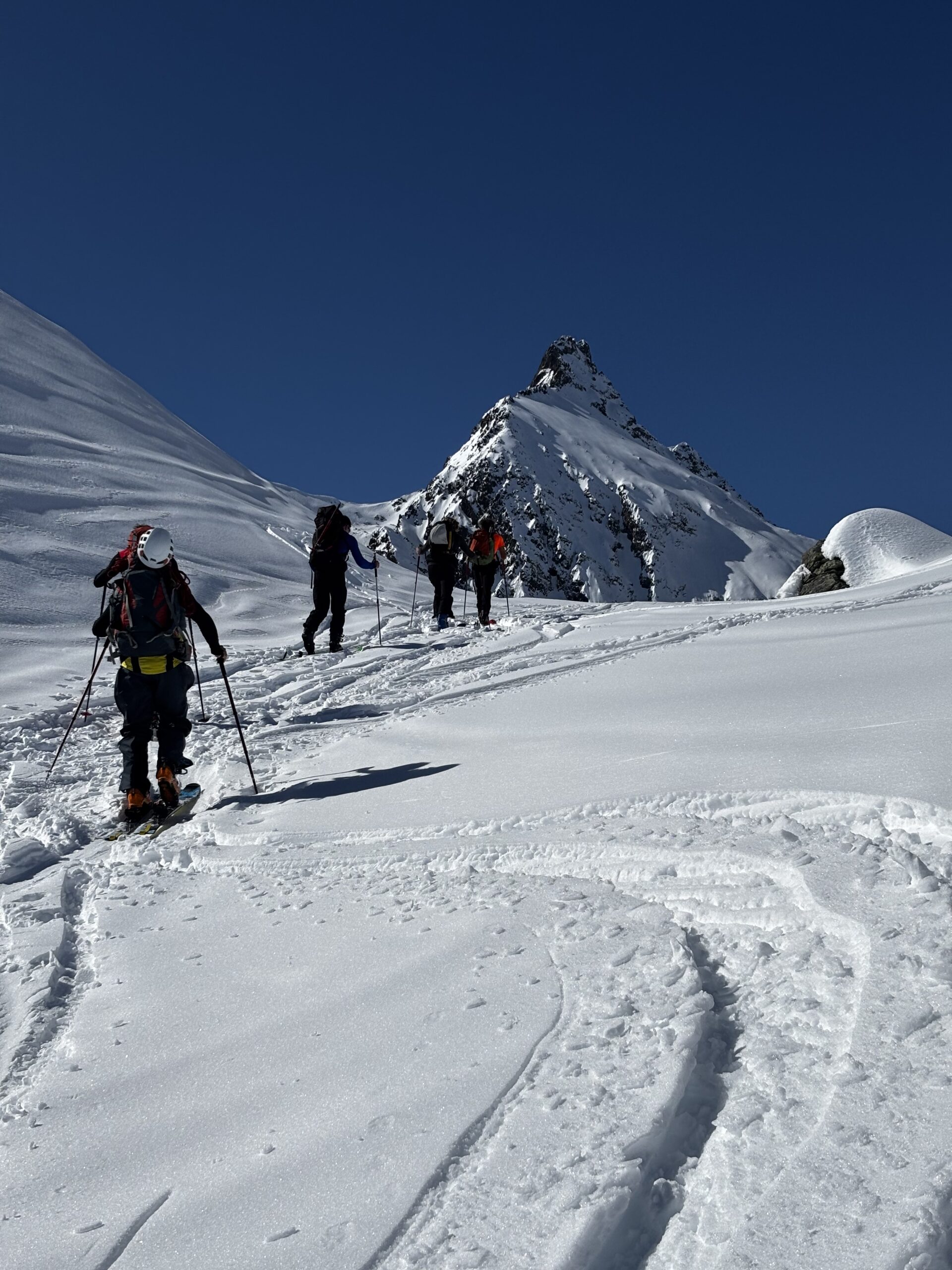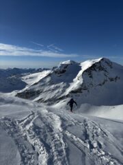 Partenza dal rif verso NO per pendii ampi ed irregolari fino al passo di Gries da qui ci si immette nell’ omonimo ghiacciaio e con altri 300m di salita siamo in vetta al Blinnenhorn. Discesa per il ghiacciaio fino al lago Gries e poi brevissima ripellata fino al passo di Gries e discesa su pendii ampi esposti ad O verso il lago di Morasco e per stradina di servizio/pista di fondo si torna a Riale