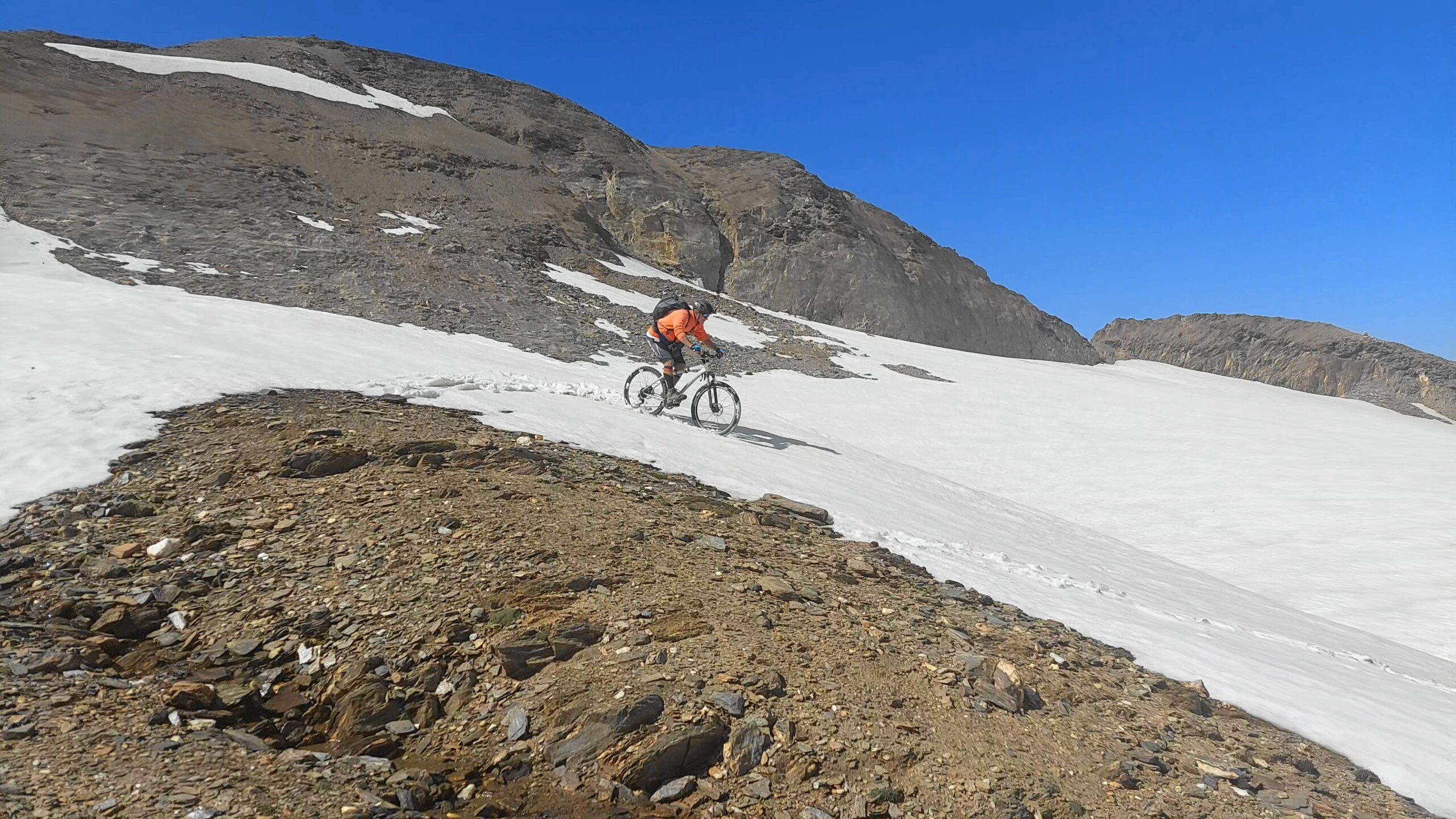 poi di nuovo in sella sulla piana in direzione W , perdita di 50m e di nuovo su oltre i 2500mt del ex Rifugio Mores, discesa sulla diga e poi 50% di pedalata all’inizio esposta fino ai 2700mt del Rif. Claudio e Bruno, poi ancora pedali fino a 2750mt. Da qui spinta ed a tratti spalla fino in vetta salvo qualche pedalata 20% circa.