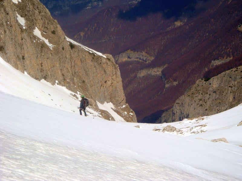3° Discesa (V. Santo Spirito): si scende ora verso Nord e poi si entra direttamente nel ripido ed inizialmente stretto vallone di Santo Spirito orientato in pieno Nord (Attenzione: pericolo valanghe). Il vallone poi si allarga e raggiunge un bivio a quota 1489m, dove solitamente si interrompe la discesa.