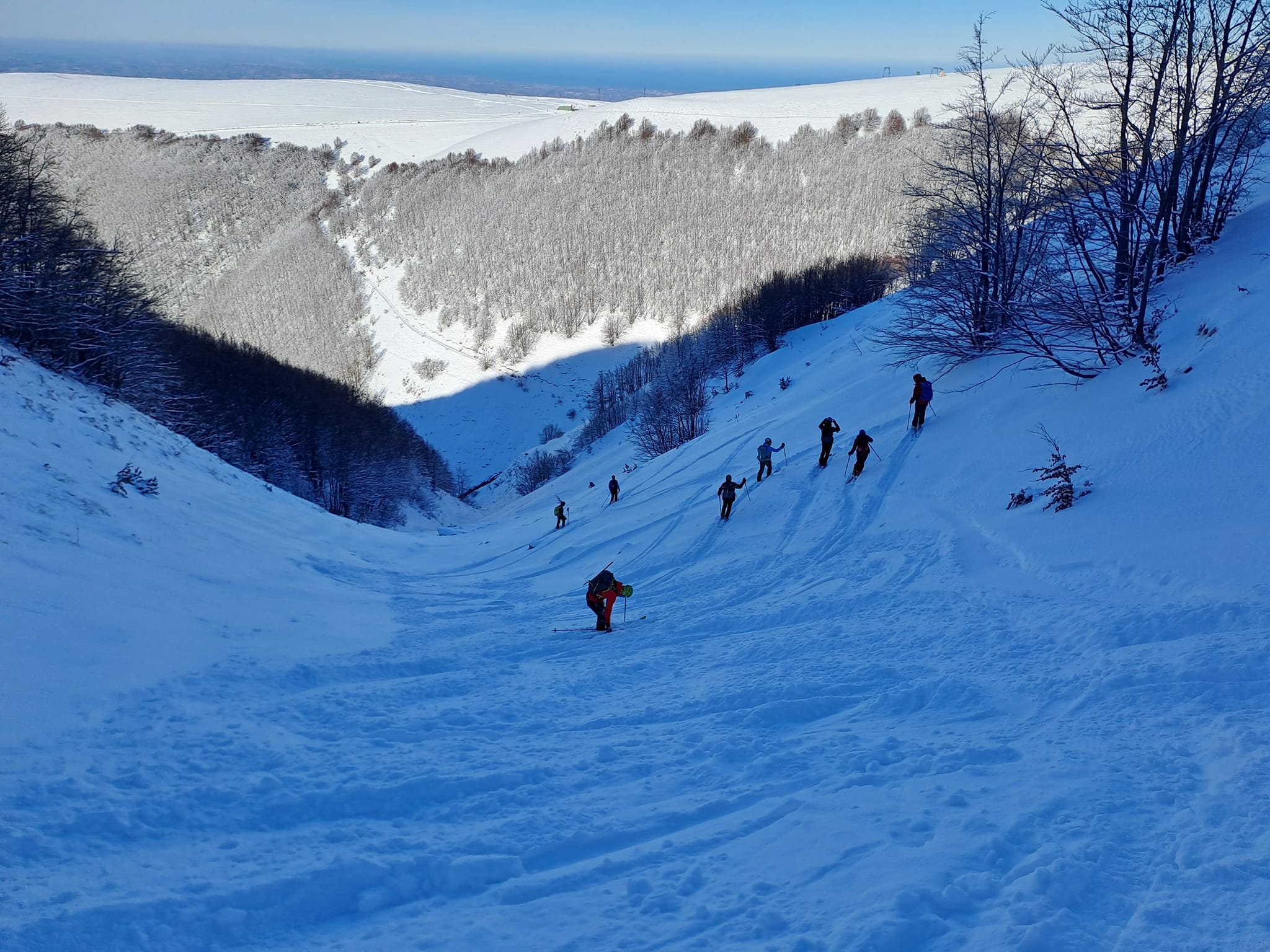 1° Discesa (V. Letto): si scende lungo la massima pendenza in direzione Nord attraversando il Prato della Majelletta su pendii aperti ideali per lo sci. Si entra nella Valle Letto che si percorre fino a quota 1500 od oltre a seconda della qualità e quantità di neve. Si ripella e si rimonta la valle sulla sua dx orografica fino a raggiungere la balconata sovrastante a quota 1700-1800 m.)