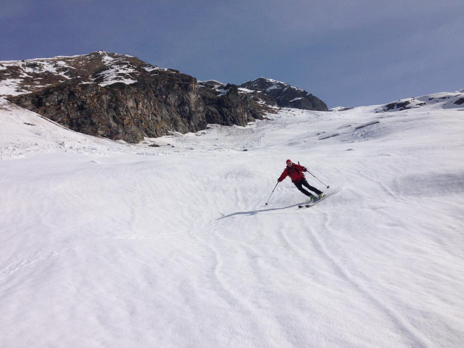 Quando in fondo al vallone si entra in versante sud, la neve è marcia e sfondosa…ma per essere ad aprile non ci si lamenta.