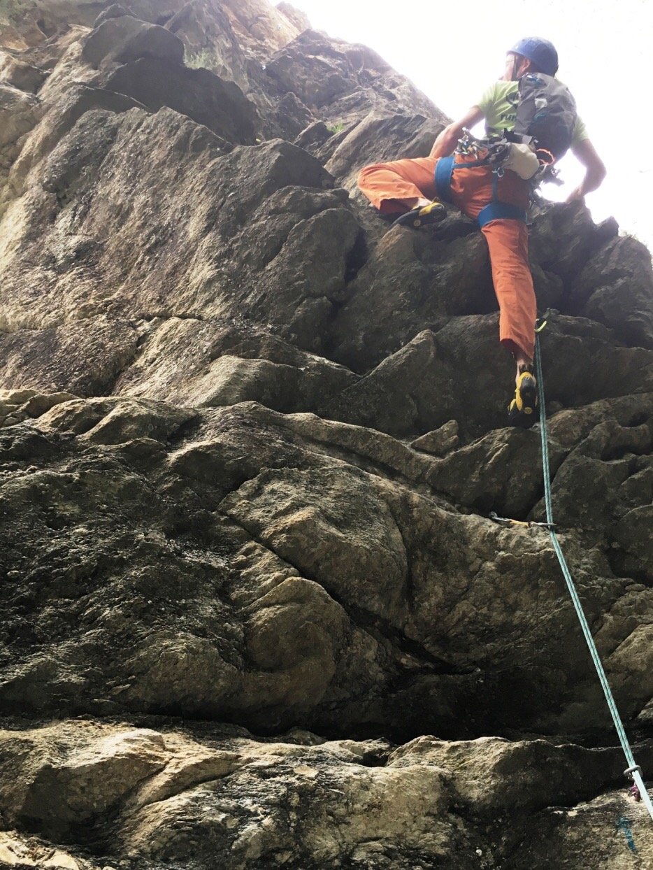 Abbiamo dapprima fatto la via delle placche, una bella roccia compatta adatta a chi vuole cominciare a scalare su vie lunghe. Sia mo poi passati alla via normale a tiri alterni, direi una via di media difficoltà con appigli per le mani su fessure o rovesci, mentre per i piedi avvallamenti o tacche nette. In ultima la via dello spigolo una via bellissima con buonissimi appigli sul primo tiro, necessari per uscire dagli strapiombi, il secondo tiro si presenta un po’ meno difficile ma lo giudico uno dei più belli della Val Pellice. Il settore è stato richiodato di recente e per tutte le vie basta una mezza corda da 60 metri doppiata