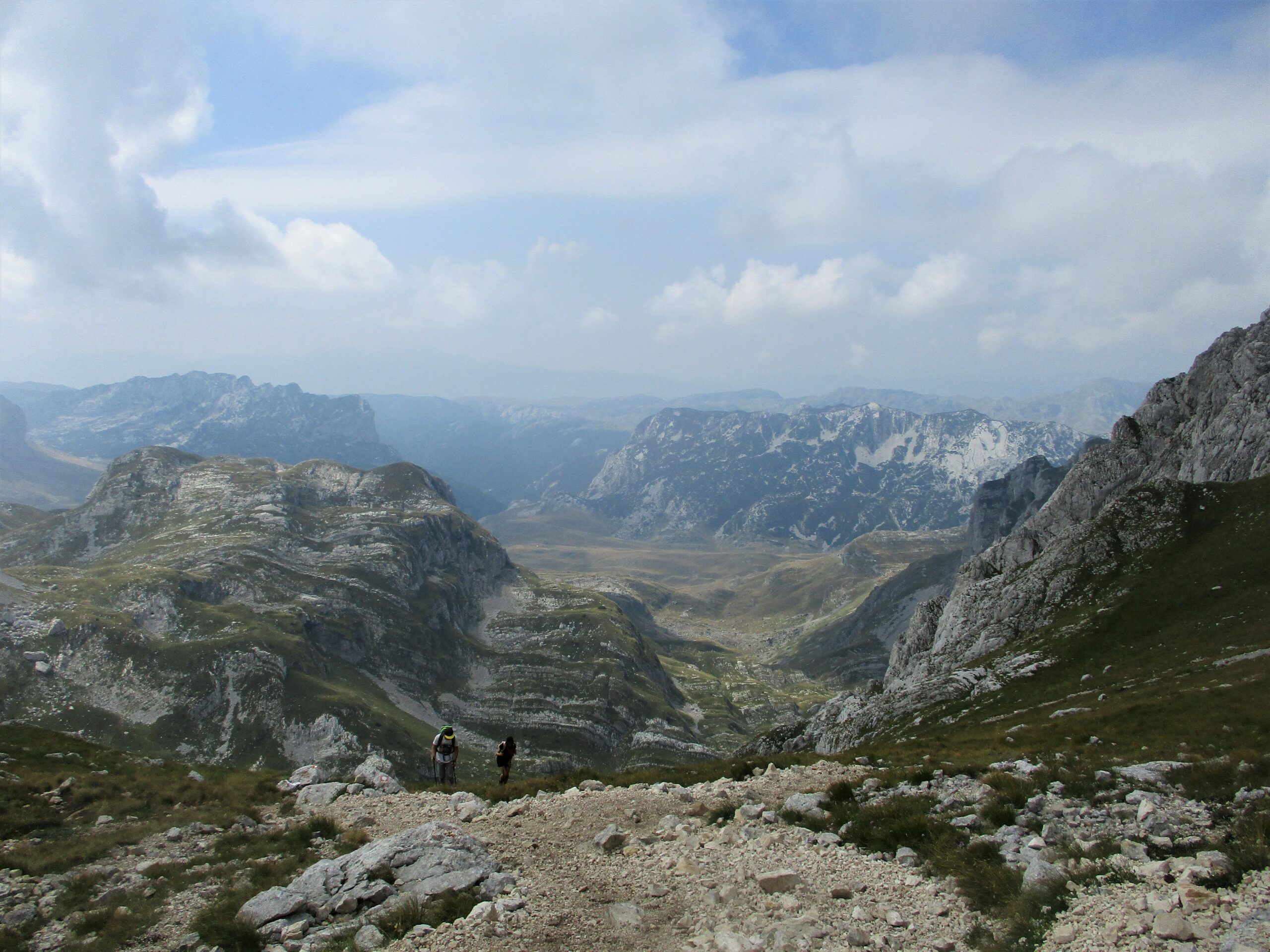 Breve finestra di bel tempo mattutina che ha consentito buona visibilità, sentiero tutto ben marcato con bollini bianco rossi. Attenzione solo quando si imbocca il canale di sfasciumi, comunque evidente, alla grossa scritta Bobotok su una placca di roccia. Il sentiero principale continua dritto. Partenza da Sedlo Pass e dopo le prime ripide rampe in parte attrezzate è tutto un saliscendi su ampie doline fino agli ultimi ripidi 500 metri finali. I tratti esposti sono attrezzati con corde fisse, il tratto finale è divertente e si arrampica a tratti su ottima roccia. Gran panorama dalla cima, la più alta in zona. Al rientro percorsa la strada panoramica verso Pluzinjie che attreversa verdi pascoli alternati a zone rocciose fino a dominare dall’alto le splendide gole della Nava. Alloggiato a Zabljac in uno dei tanti e comodi Katun, sorta di comodi bivacchi con cucina al piano terra e comodi letti al piano superiore. Consigliata visita al lago del Diavolo, Vrazje, per la doppia tonalità di verde, ed al più frequentato lago Nero.