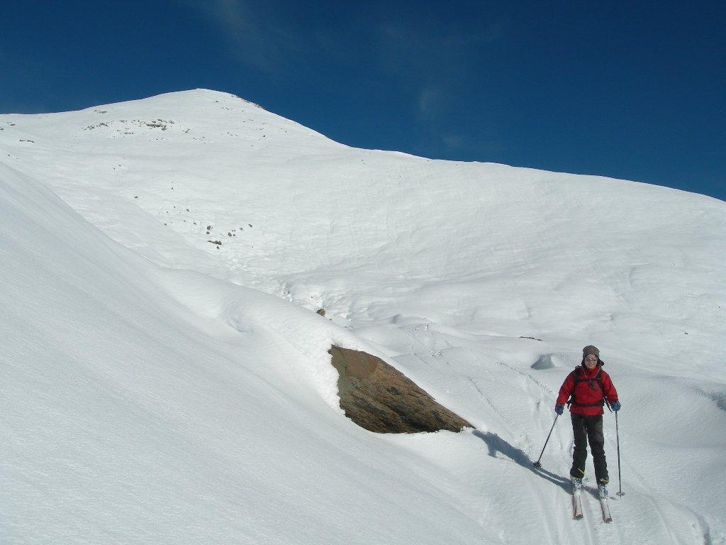 saliti dal sentiero del Raty, 100 metri con gli sci a spalle sul tratto ripido per mancanza di neve. parte alta crosta portante discretamente sciabile, dai 2300 alla baita sopra a Dondena crostaccia insciabile, la strda abbastanza scorrevole.