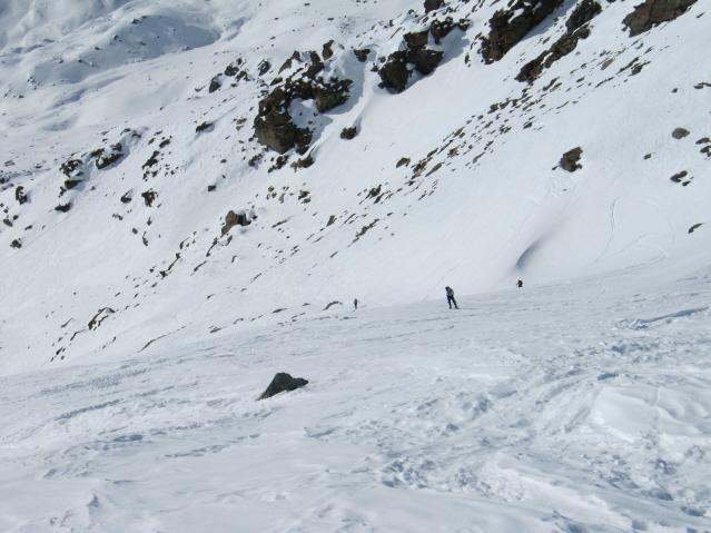 Gli ultimi 150m: trappole mortali. La crosta si sfondava all’improvviso e lo sci sprofondava di oltre mezzo metro in una graniglia inconsistente e la forza d’inerzia portava ad incastrare le ginocchia contro la crosta pressata. Un solo modo per uscirne: contare sui compagni e spalare per poter estrarre gli sci.