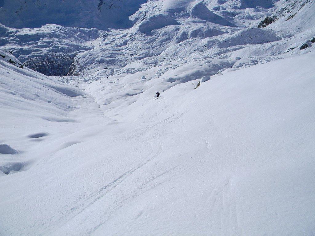 Partiti un pò prima di Dondena e saliti subito per prati. Zona bassa neve crostosa e scarsa, in alto portante anche se un pò delicata, bella giornata calda di sole