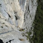 - L7: giunti alla base della placca bianca occorre portarsi verso sinistra e seguire l’ultimo tiro della via, ben chiodata (V). Da qui in poi per breve cresta fino al canale attrezzato dal quale si scende a valle.