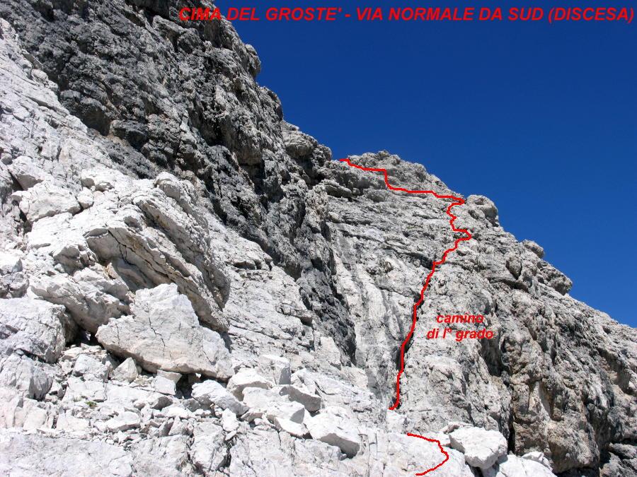 Ridiscesi alla base della cima rocciosa, si percorre la cresta che si collega al Dos d’Abramo (attenzione a possibili cornici!!). Un canalino attrezzato e un ripido ma breve pendio permette di raggiungere la piatta e panoramica vetta.