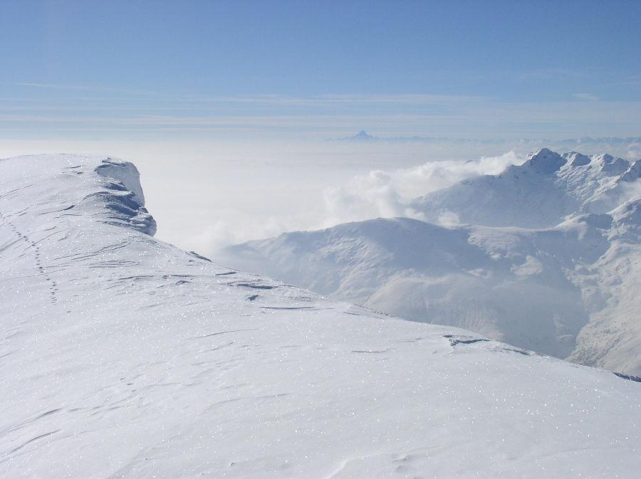 partiti dal tornante a quota 1000 dove il gta attraversa il torrente. Saliti su neve buona e arata dai numerosi passaggi. Abbondante farina con qualche tratto di crosta. Solo noi con le racchette e un paio di scialpinisti. Scendendo, giunti al bivio sopra l’alpe Gugliasco, siamo ancora saliti di 350 metri di disl. al Cavalcurt, decisamente più affollata. Tempo splendido con mare di nuvole.