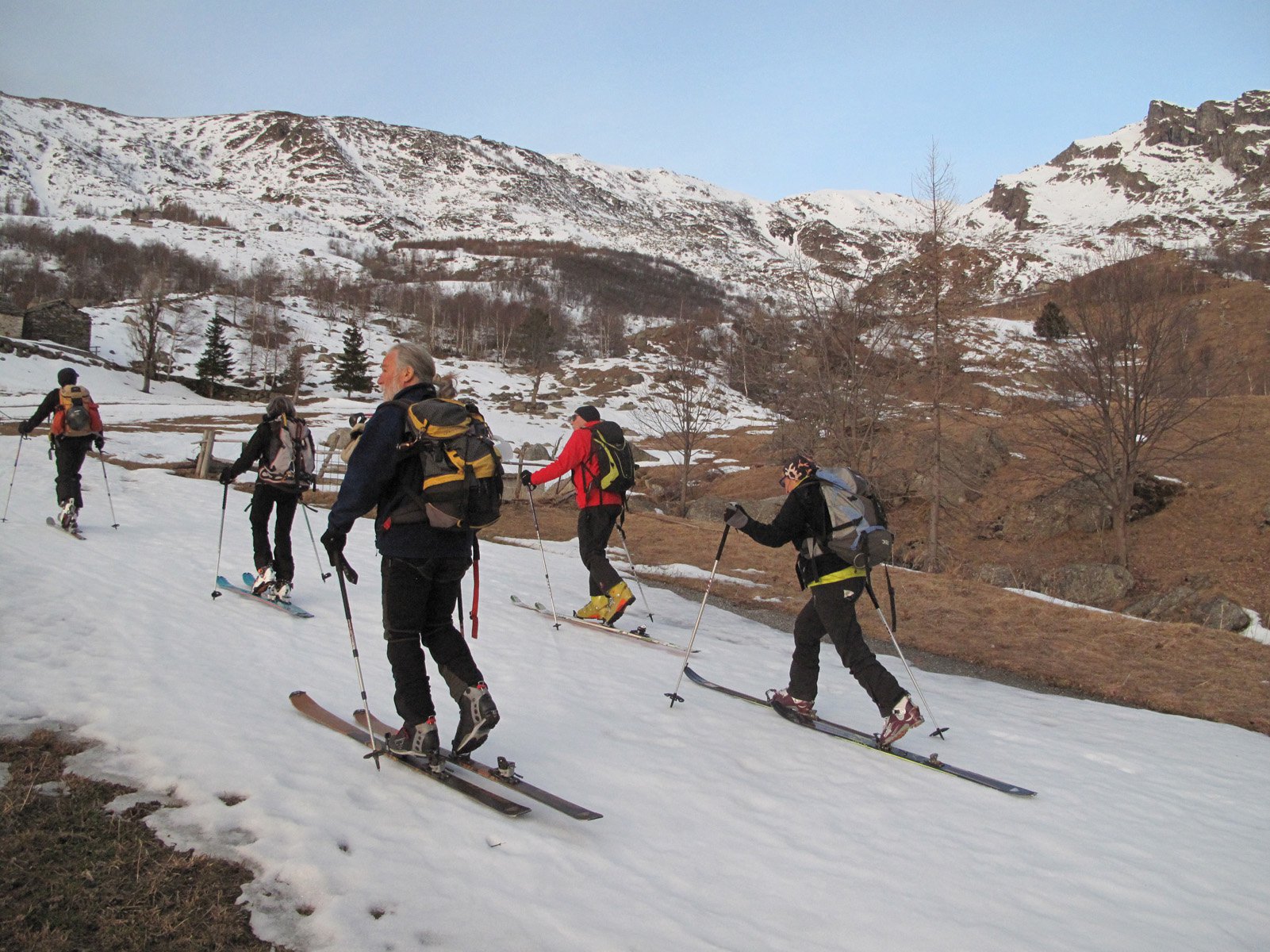 Grazie alle auto 4×4 siamo riusciti ad arrivare all’agriturismo Capanne 1400m. Neve da subito stando sulla dx idrografica del torrente fino al ponte sul rio Battaglia. Da lì salita diretta toccando le varie borgate. Canale in condizioni strepitose e non troppo lavorato. Traverso grazie alla lieve velatura in condizioni sicure, arrivo in Cima su neve dura. Spettacolo su tutto: dal Monviso al Cervino. Discesa su neve dura in alto (partenza alle 11), perfetta fino all’alpe Gugliasco, un pò sfondosa sotto fino all’attraversamento del torrente, poi buona (pendio Nord-Ovest) fino alle auto.