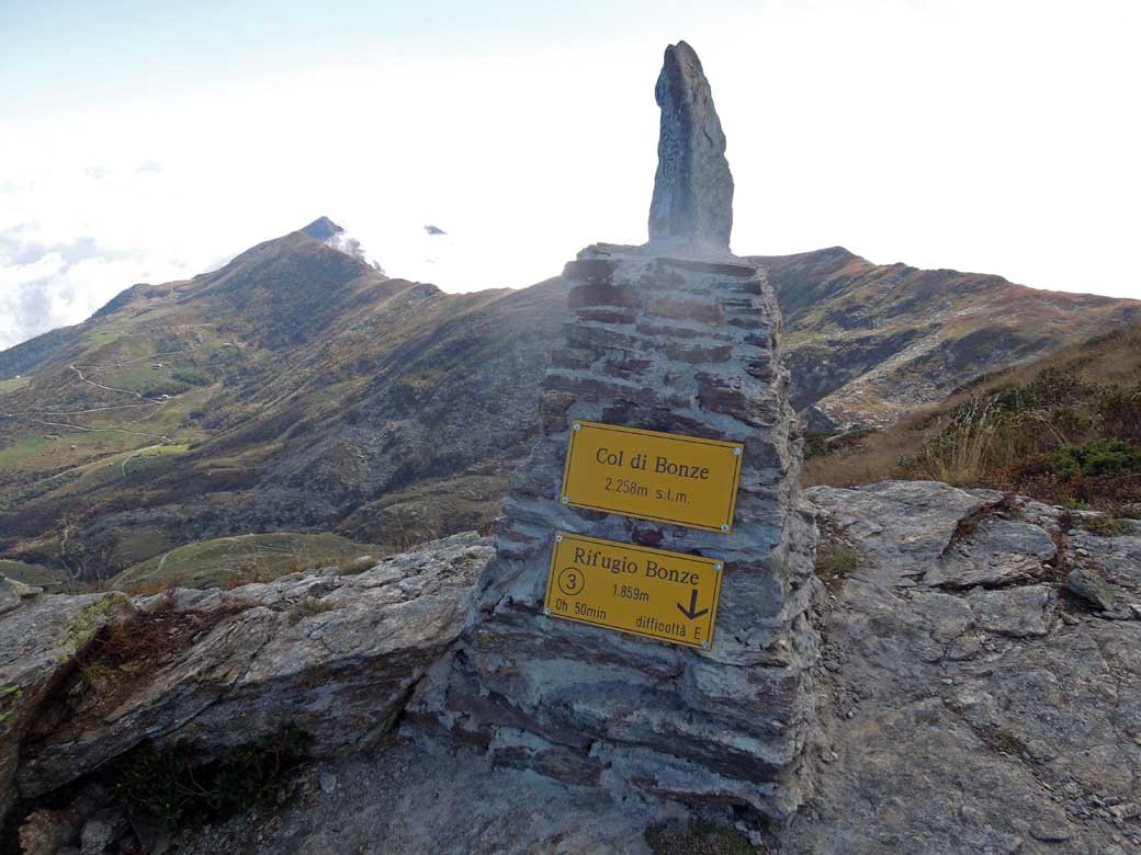 Partiti da Vieyes siamo saliti oltre il rifugio, ancora aperto, al Colle di Bonze sul nuovo sentiero proprio oggi segnato con il numero 3 ed integrato da numerosi ometti; evidente ma un po’ monotono il lungo traverso fin sotto il rifugio, mentre da questo al colle il nuovo e ben fatto sentiero attraversa la grande conca di rocce e bassa vegetazione in un bellissimo ambiente solitario e selvaggio dove abbiamo avvistato alcuni camosci ed un paio di grossi rapaci.