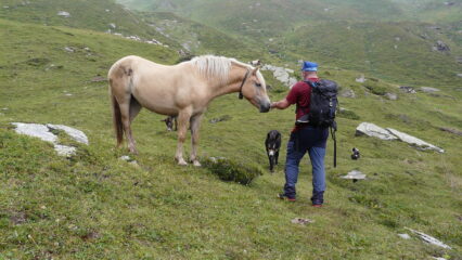 Saliti sotto copertura nuvolosa ed in alto un po’ di nebbia che ci hanno protetti dagli strali del sole; un passo indietro nel tempo il suggestivo incontro con gli ormai rari animali da soma che servono gli alpeggi; complimenti alla famiglia che gestisce i numerosi animali incontrati sui pascoli;