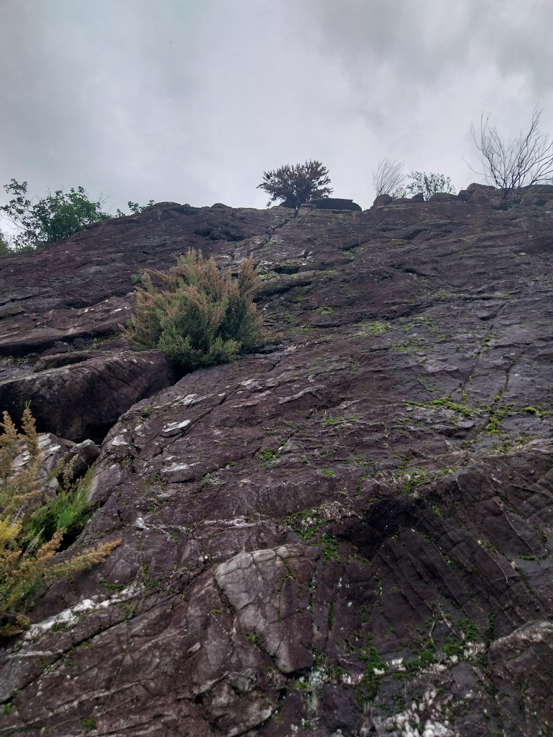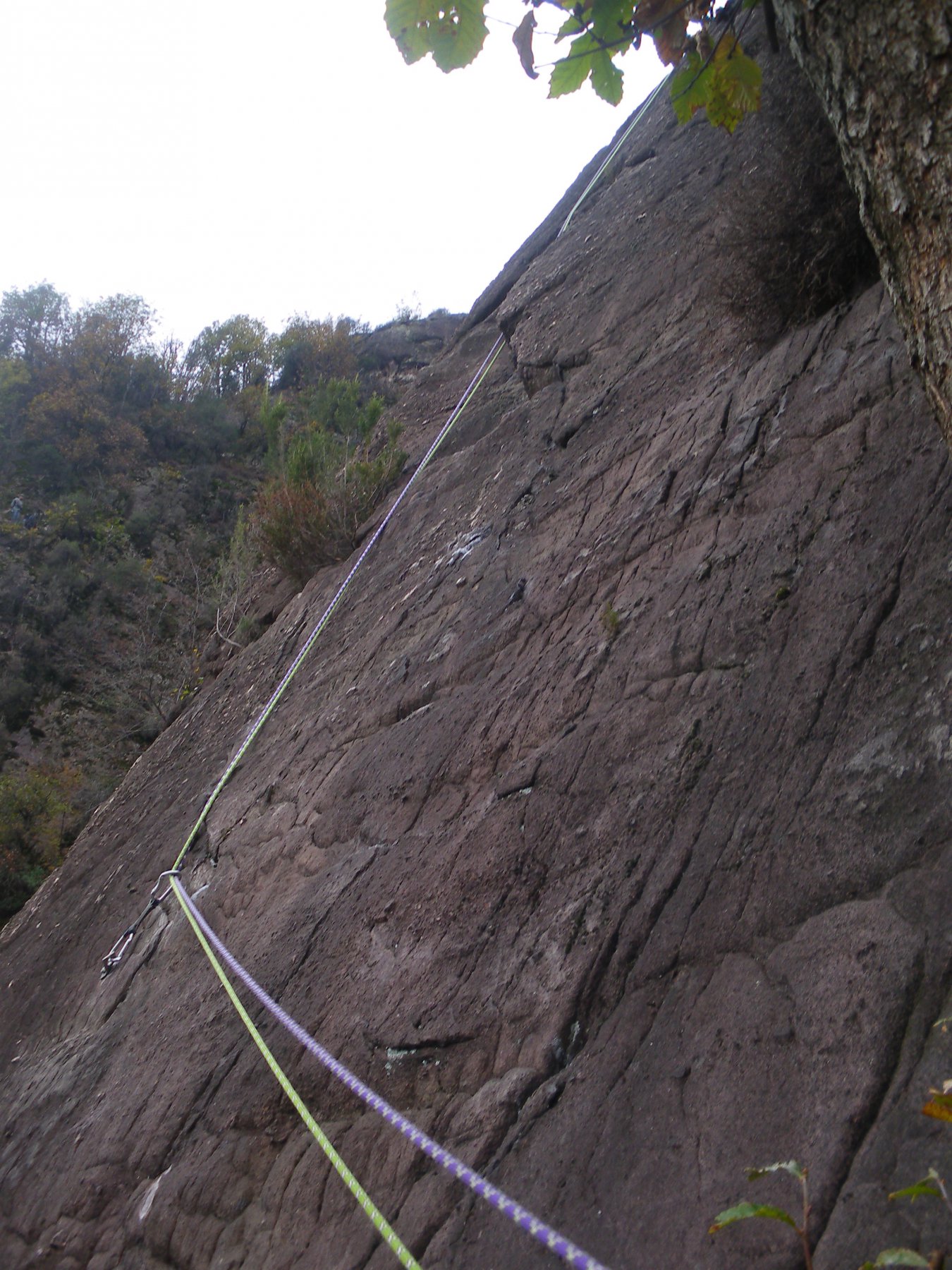 - L3: spigolo molto aereo, poi tracce di sentiero sino in sosta su albero con cordone alla base della bella placca fessurata del quarto tiro. Difficoltà: IV.