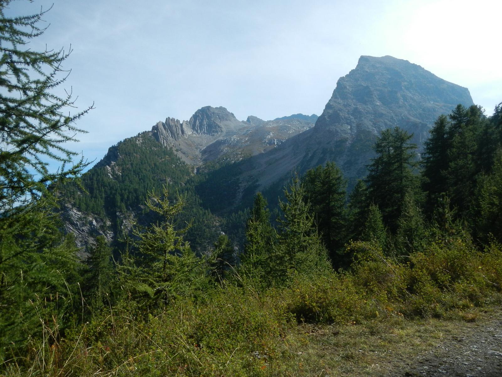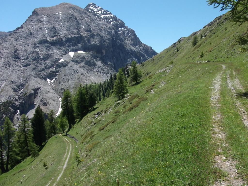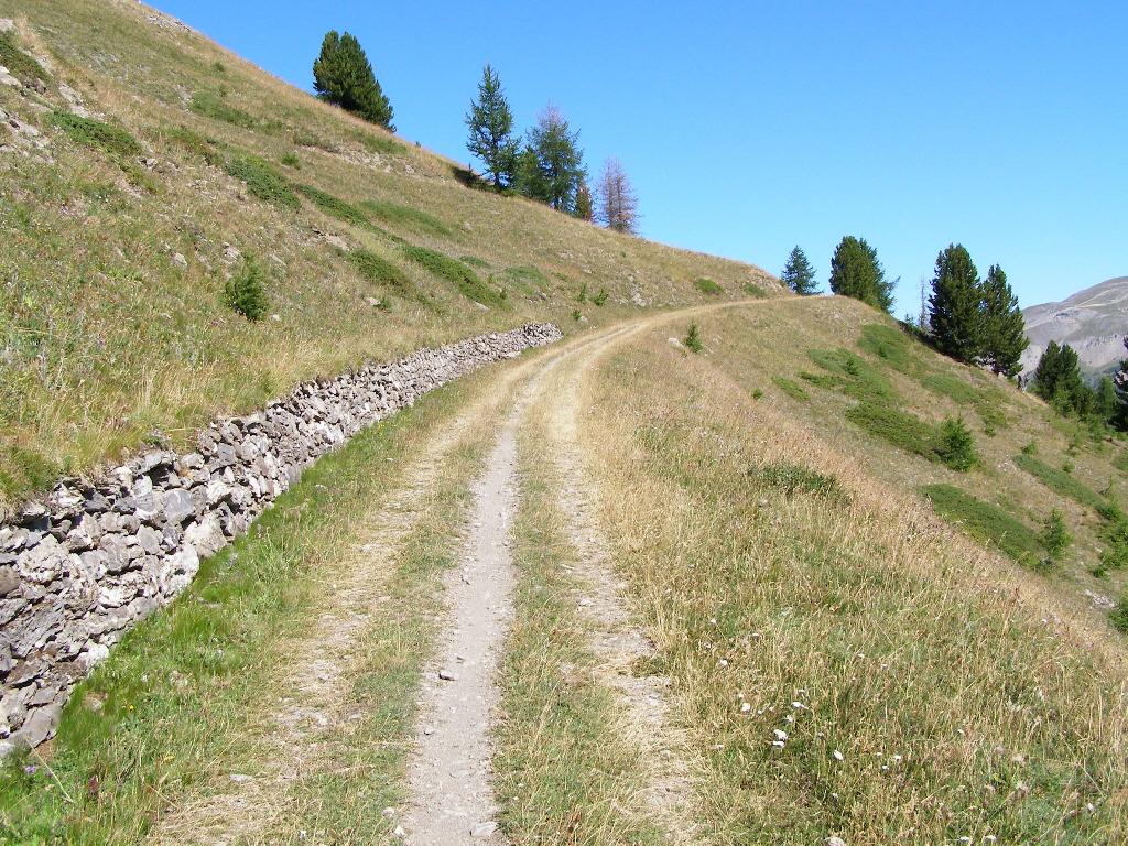 Dall’alpeggio di Chabaud si prende poi a destra la strada che dopo un primo tratto in salita poi procede praticamente in piano fino alle indicazioni del pilone Manna, subito prima del bivio per il colle Begino.