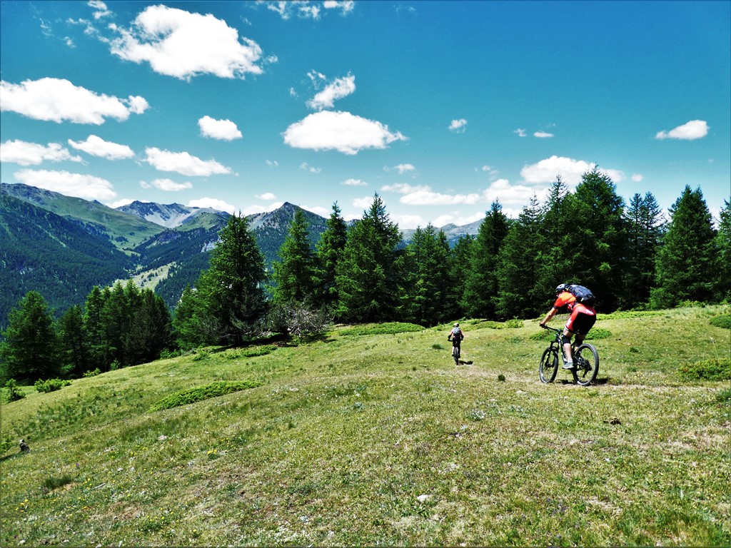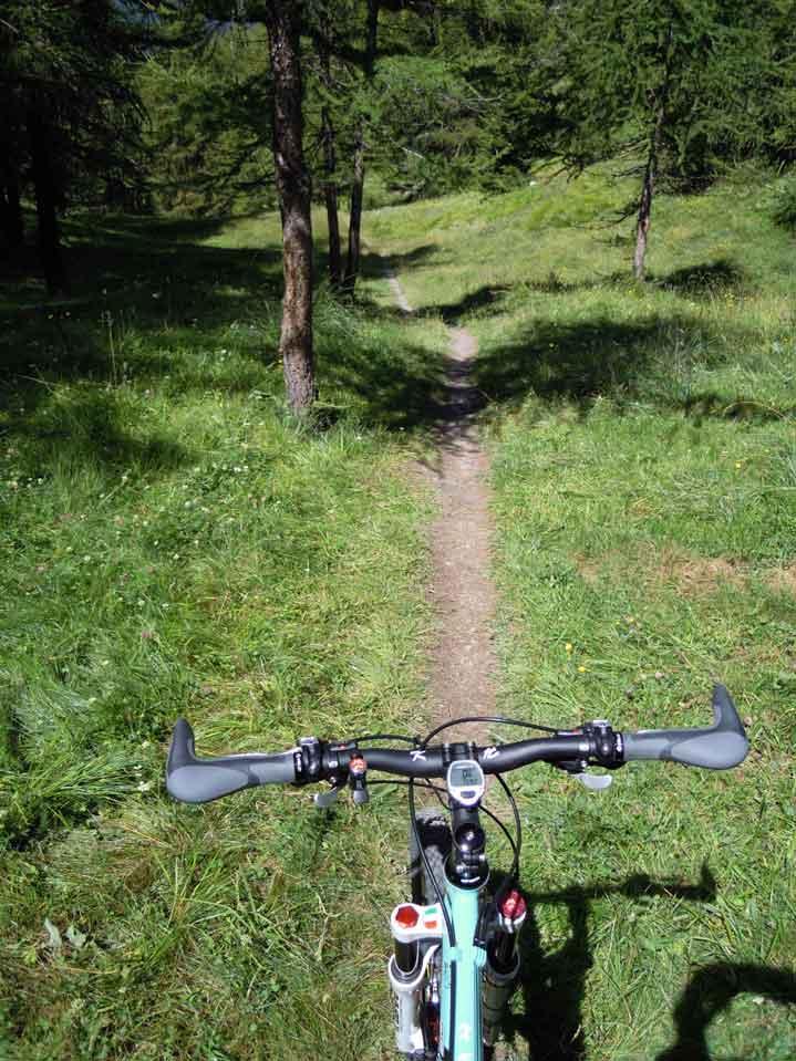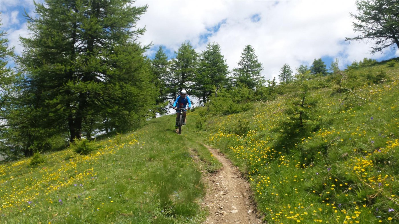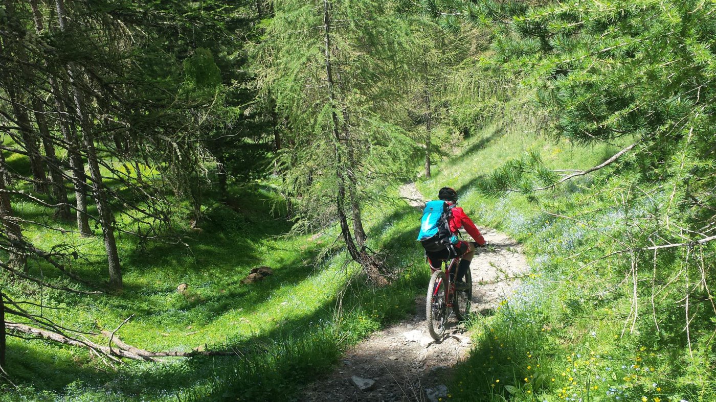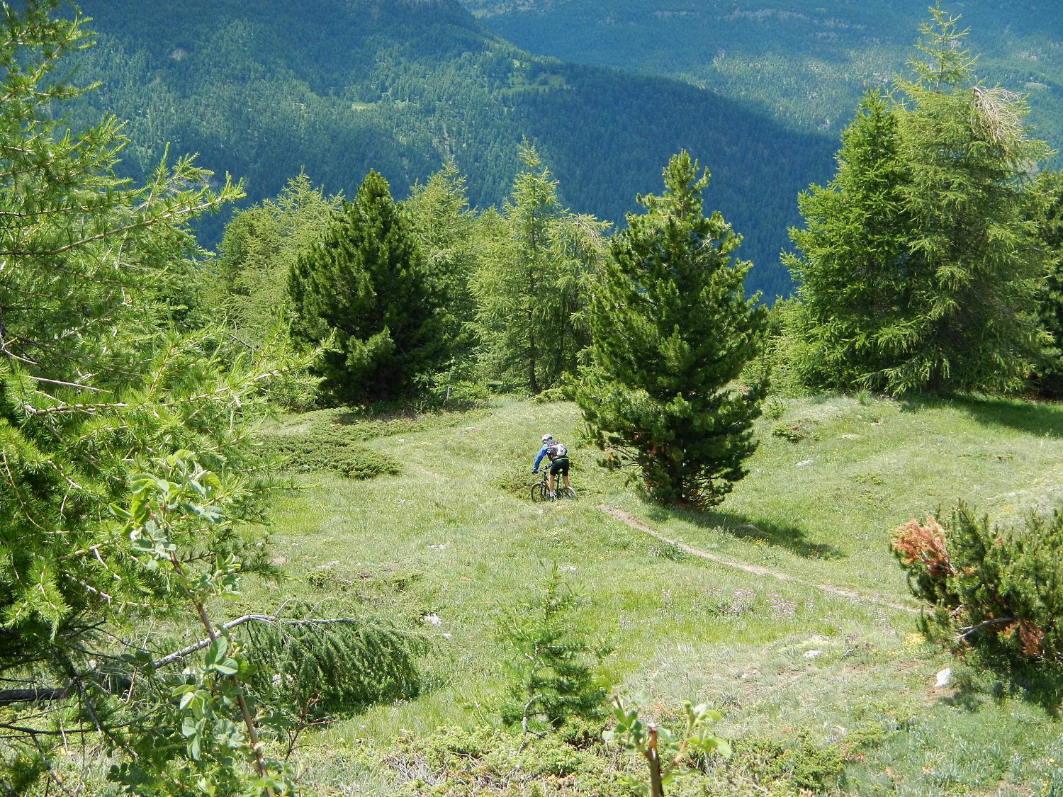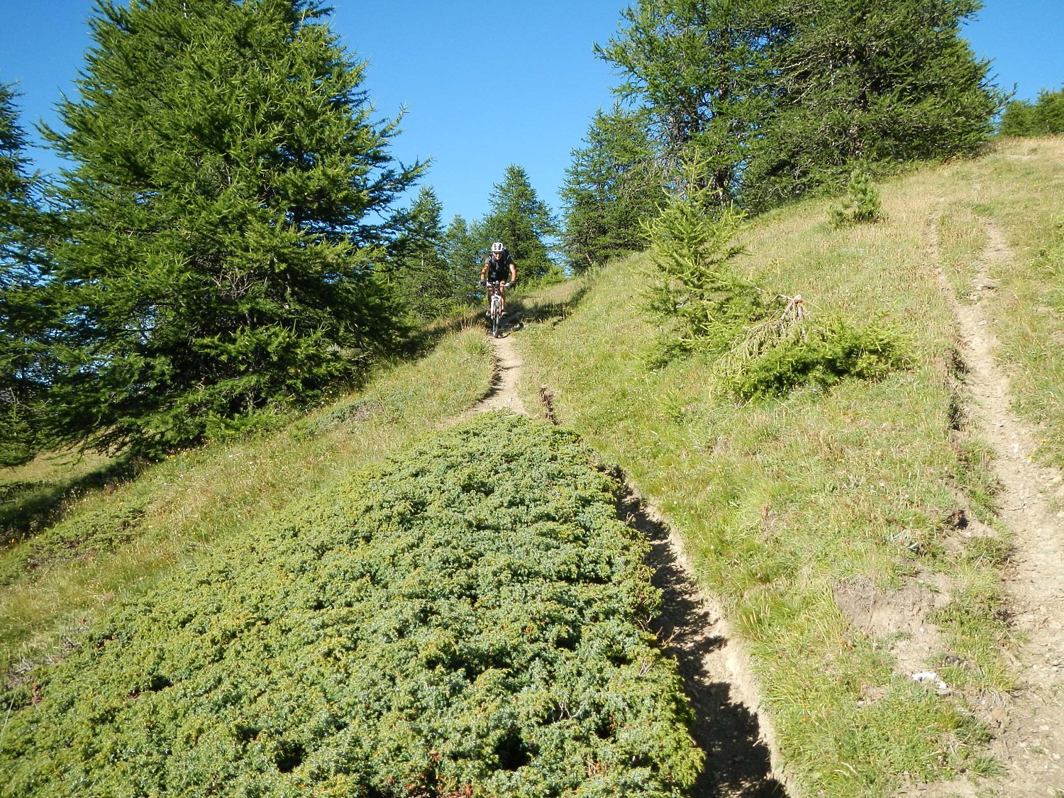 In discesa, una volti giunti a Thures, si scende su asfalto verso Bousson per qualche centinaio di metri, prestando attenzione ad un bivio a destra (indicazioni), dove stacca il sentiero ‘Deveis’; questo nel primo tratto non è ciclabile e obbliga a spingere la bici per qalche minuto, poi spiana e diventa veramente bello e facile, fondo compatto, pendenza quasi nulla inframezzata solo da un’altra risalita con un paio di tornanti, non sempre ciclabili; dopo un altro lungo e piacevole mezzacosta nel bosco il sentiero incrocia una sterrata che si segue a sinistra per breve tratto, sino ad incontrare un bivio a sinistra (è il tratturo dell’inizio della salita); si imbocca questo, e con qualche svolta e percorso facile e veloce (S0/MC) si ritorna al ponte di Rollieres.