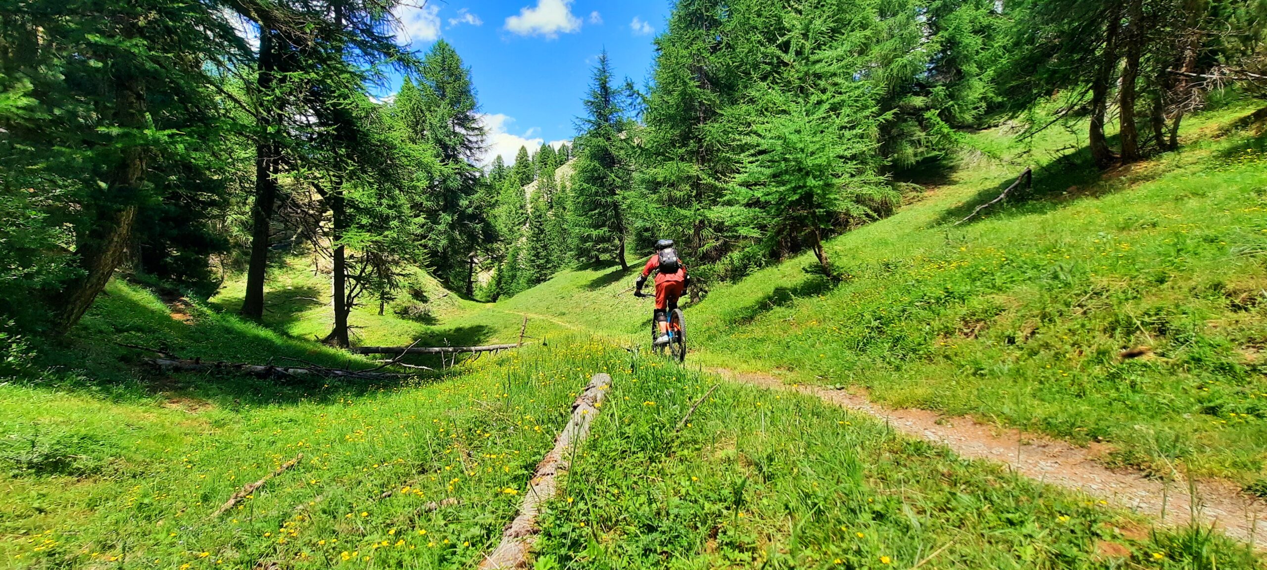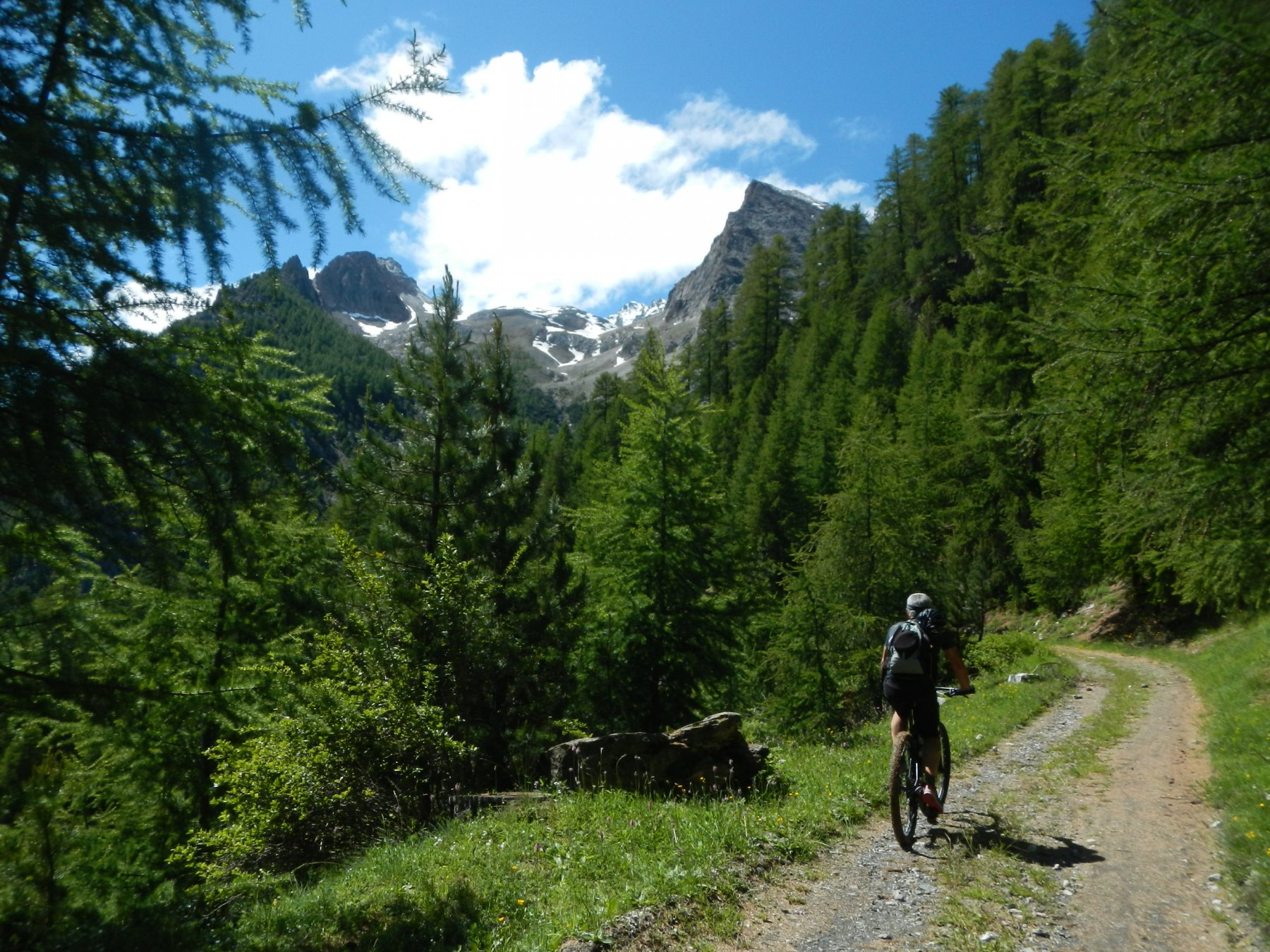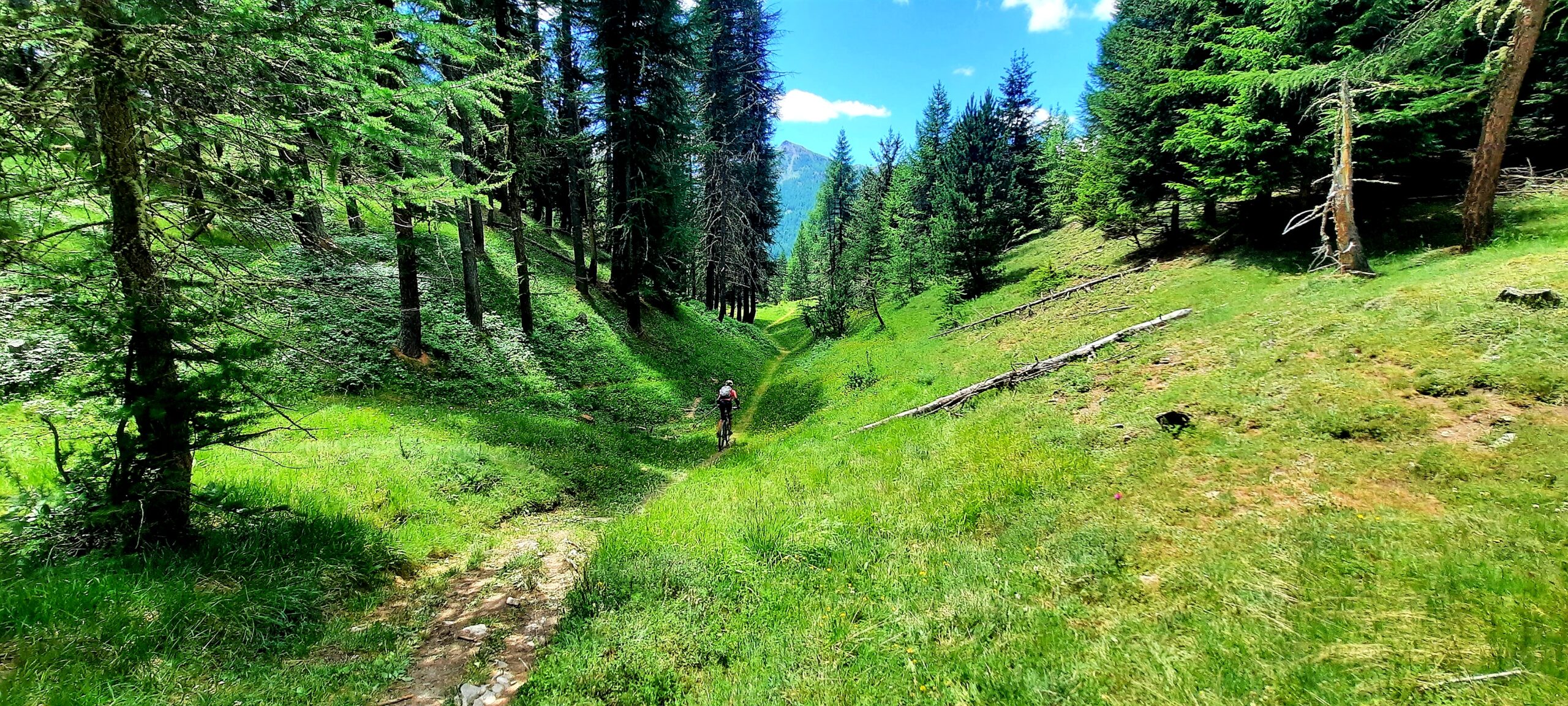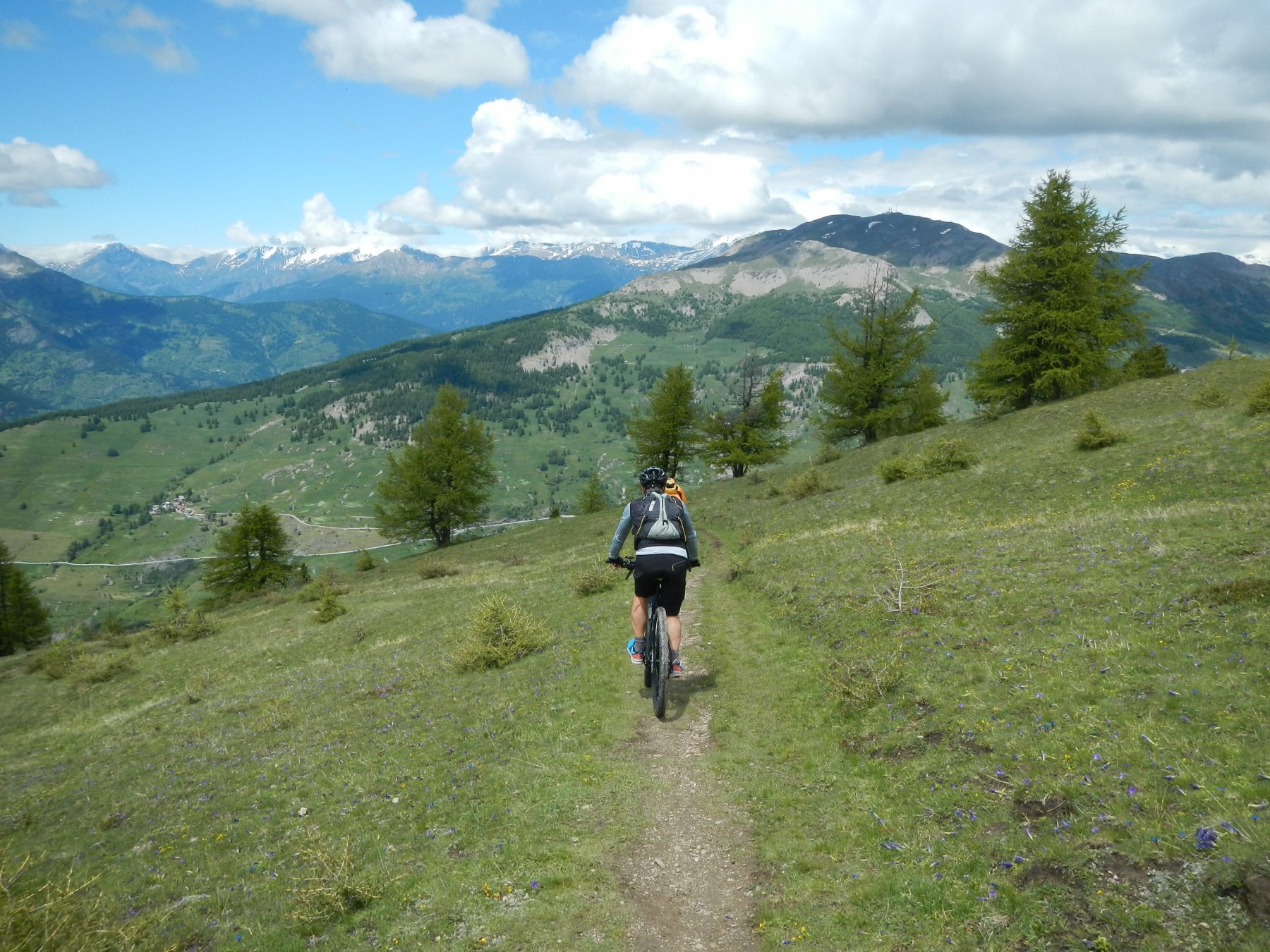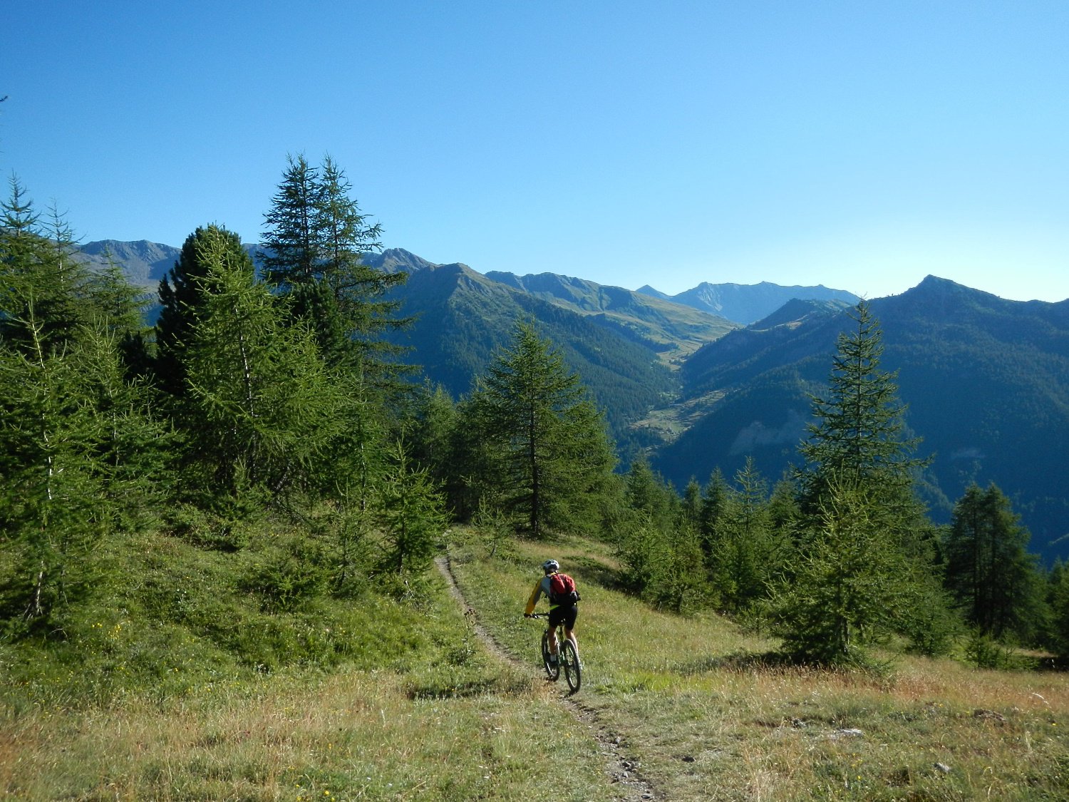 In discesa, una volti giunti a Thures, si scende su asfalto verso Bousson per qualche centinaio di metri, prestando attenzione ad un bivio a destra (indicazioni), dove stacca il sentiero ‘Deveis’; questo nel primo tratto non è ciclabile e obbliga a spingere la bici per qalche minuto, poi spiana e diventa veramente bello e facile, fondo compatto, pendenza quasi nulla inframezzata solo da un’altra risalita con un paio di tornanti, non sempre ciclabili; dopo un altro lungo e piacevole mezzacosta nel bosco il sentiero incrocia una sterrata che si segue a sinistra per breve tratto, sino ad incontrare un bivio a sinistra (è il tratturo dell’inizio della salita); si imbocca questo, e con qualche svolta e percorso facile e veloce (S0/MC) si ritorna al ponte di Rollieres.