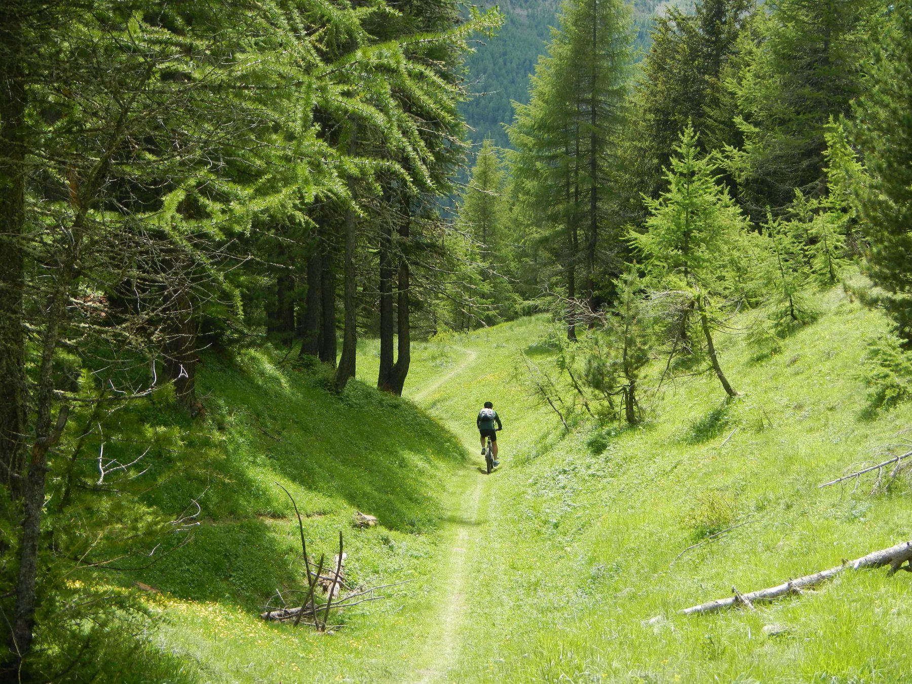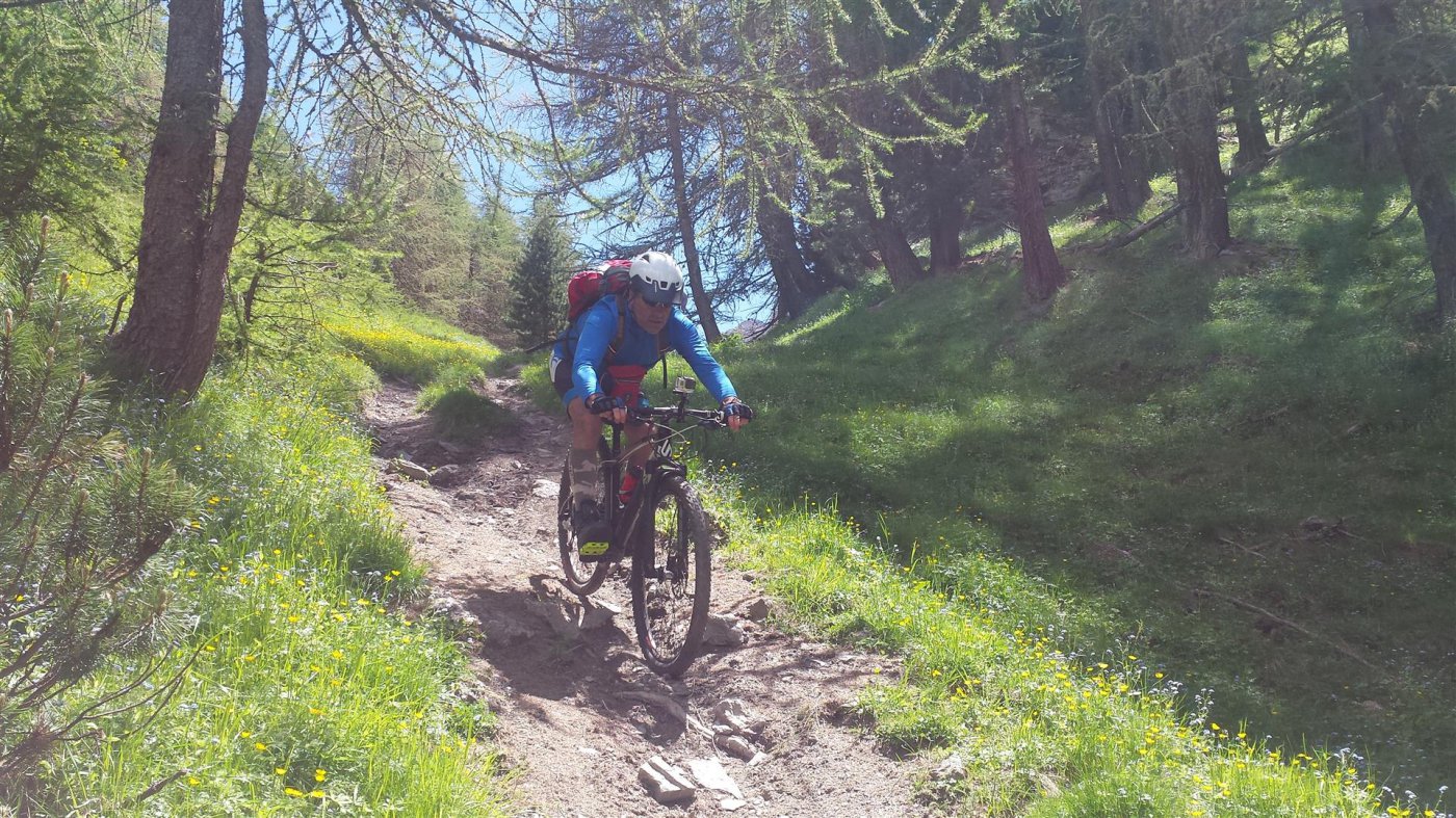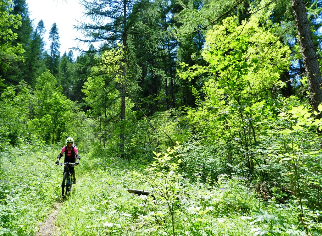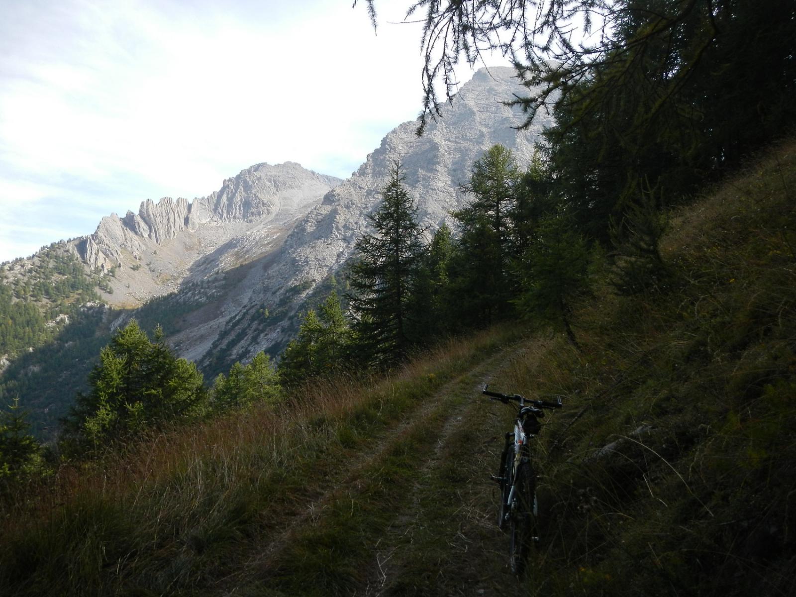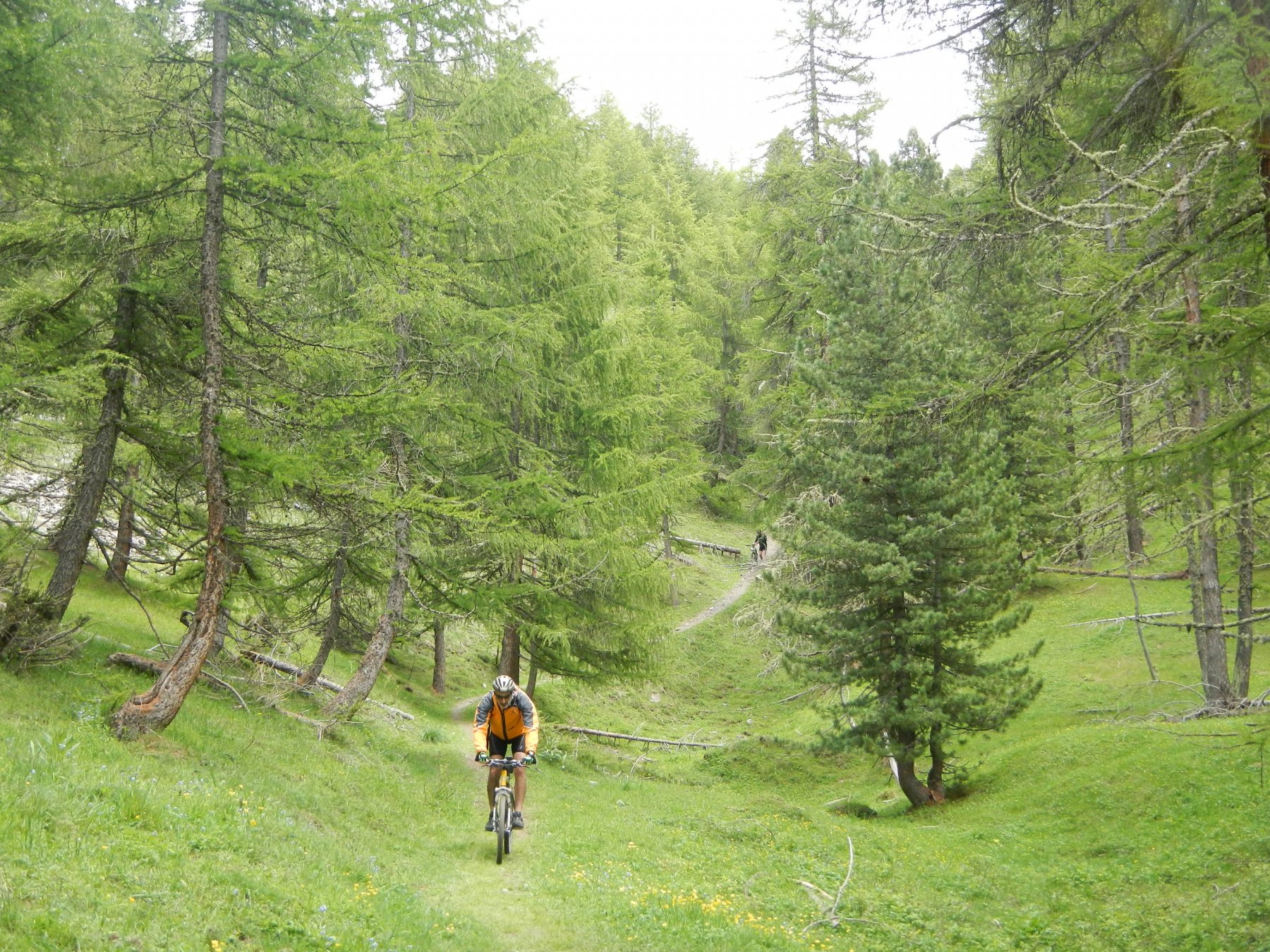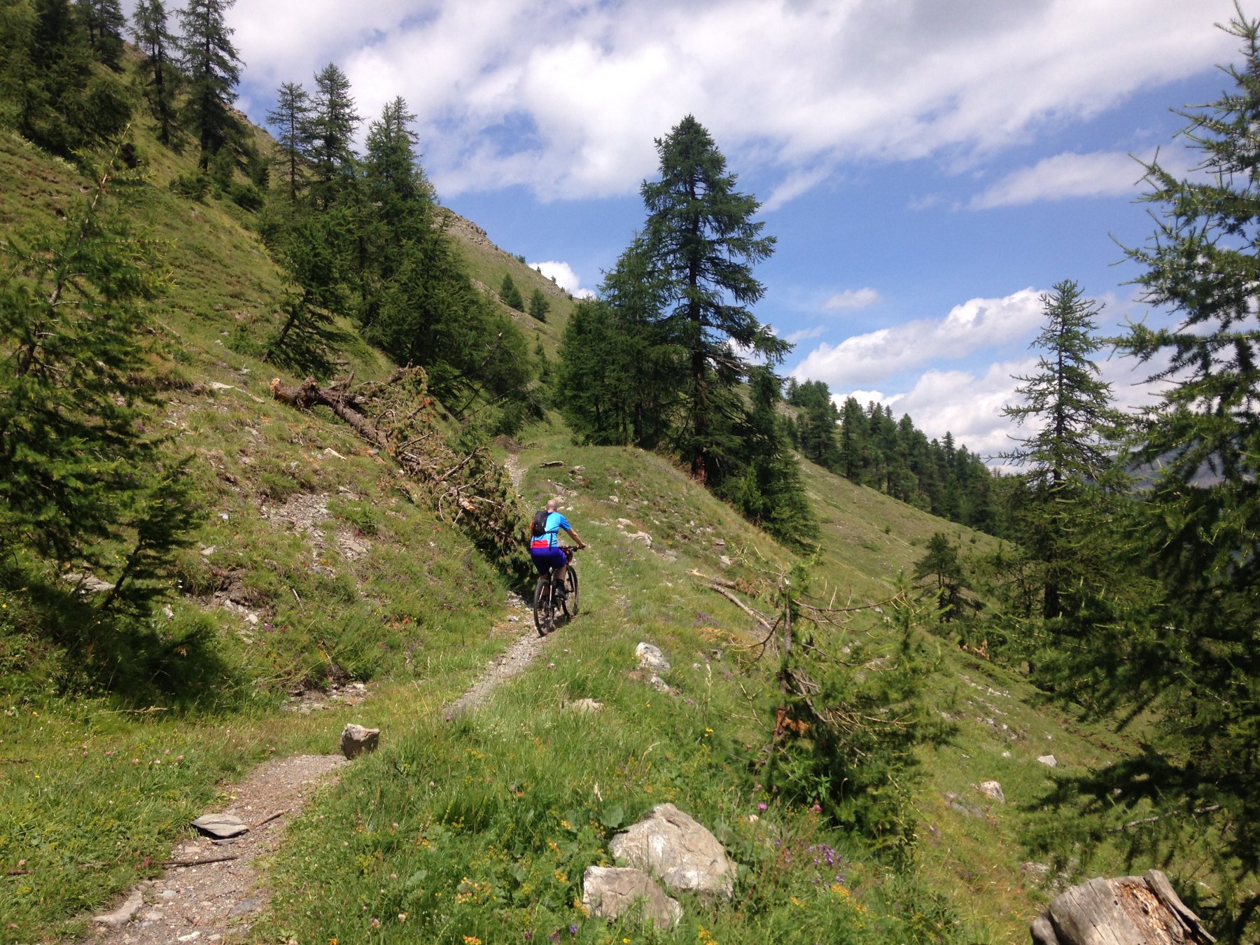 In discesa, una volti giunti a Thures, si scende su asfalto verso Bousson per qualche centinaio di metri, prestando attenzione ad un bivio a destra (indicazioni), dove stacca il sentiero ‘Deveis’; questo nel primo tratto non è ciclabile e obbliga a spingere la bici per qalche minuto, poi spiana e diventa veramente bello e facile, fondo compatto, pendenza quasi nulla inframezzata solo da un’altra risalita con un paio di tornanti, non sempre ciclabili; dopo un altro lungo e piacevole mezzacosta nel bosco il sentiero incrocia una sterrata che si segue a sinistra per breve tratto, sino ad incontrare un bivio a sinistra (è il tratturo dell’inizio della salita); si imbocca questo, e con qualche svolta e percorso facile e veloce (S0/MC) si ritorna al ponte di Rollieres.