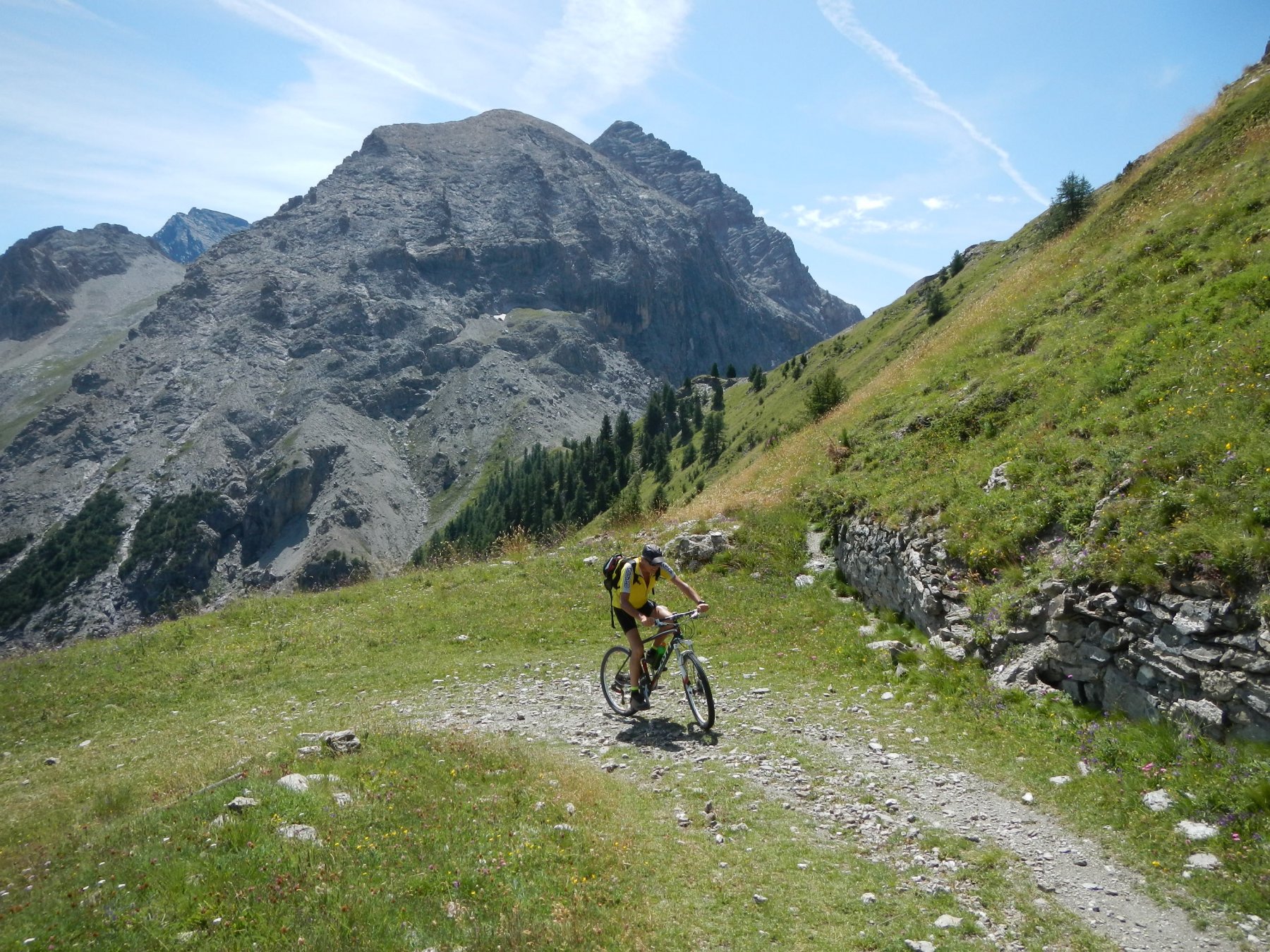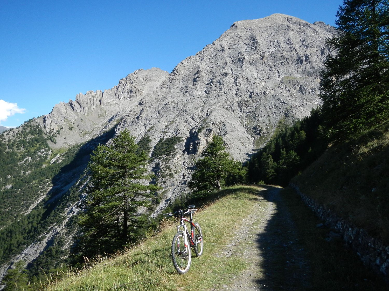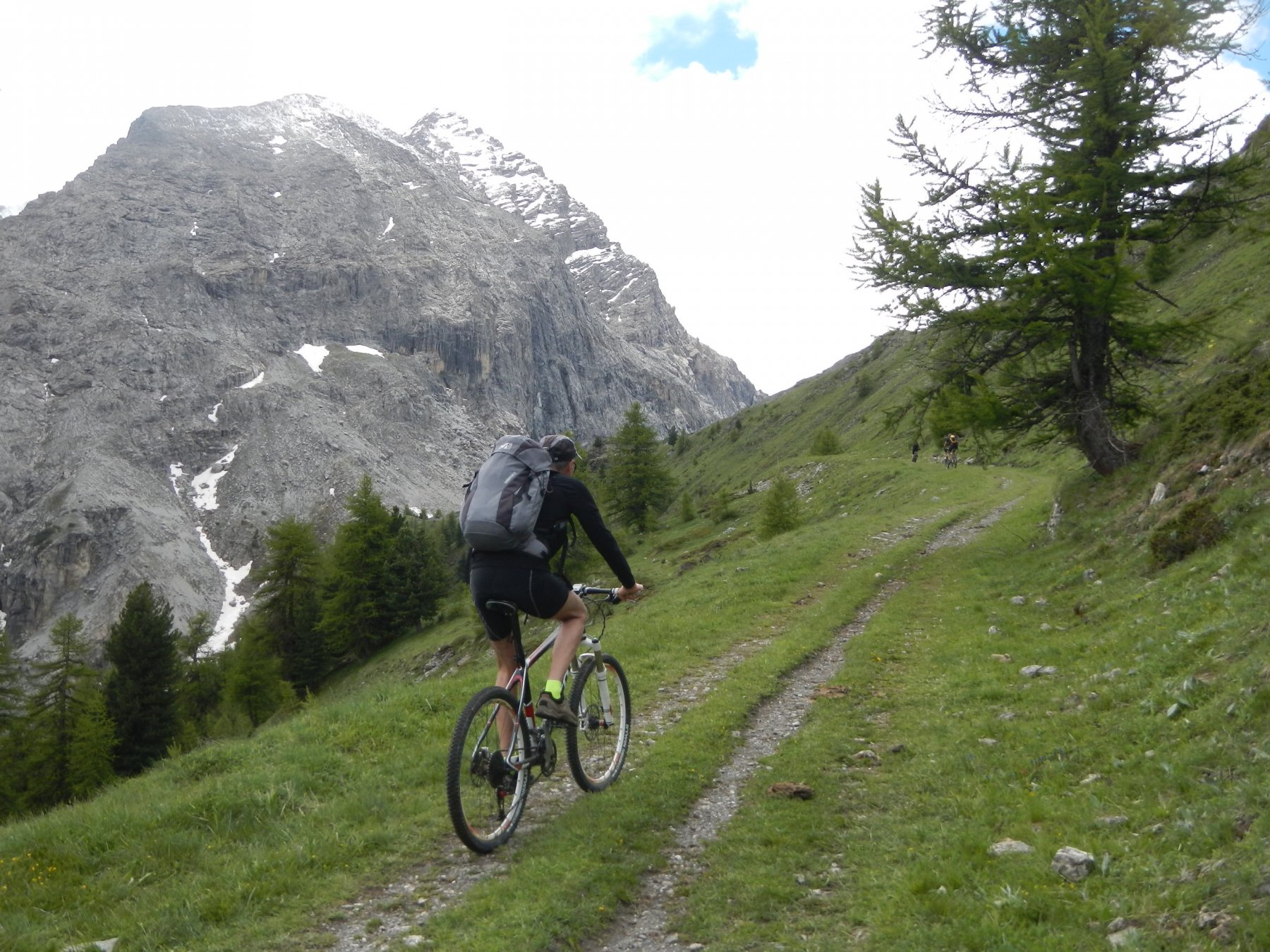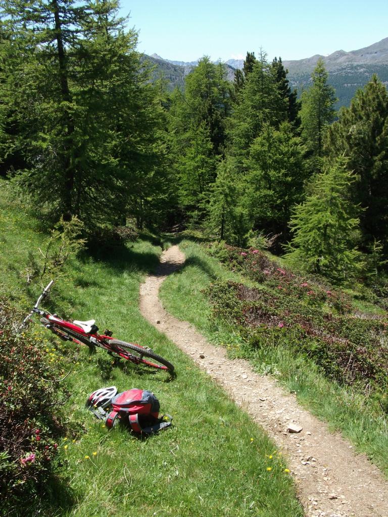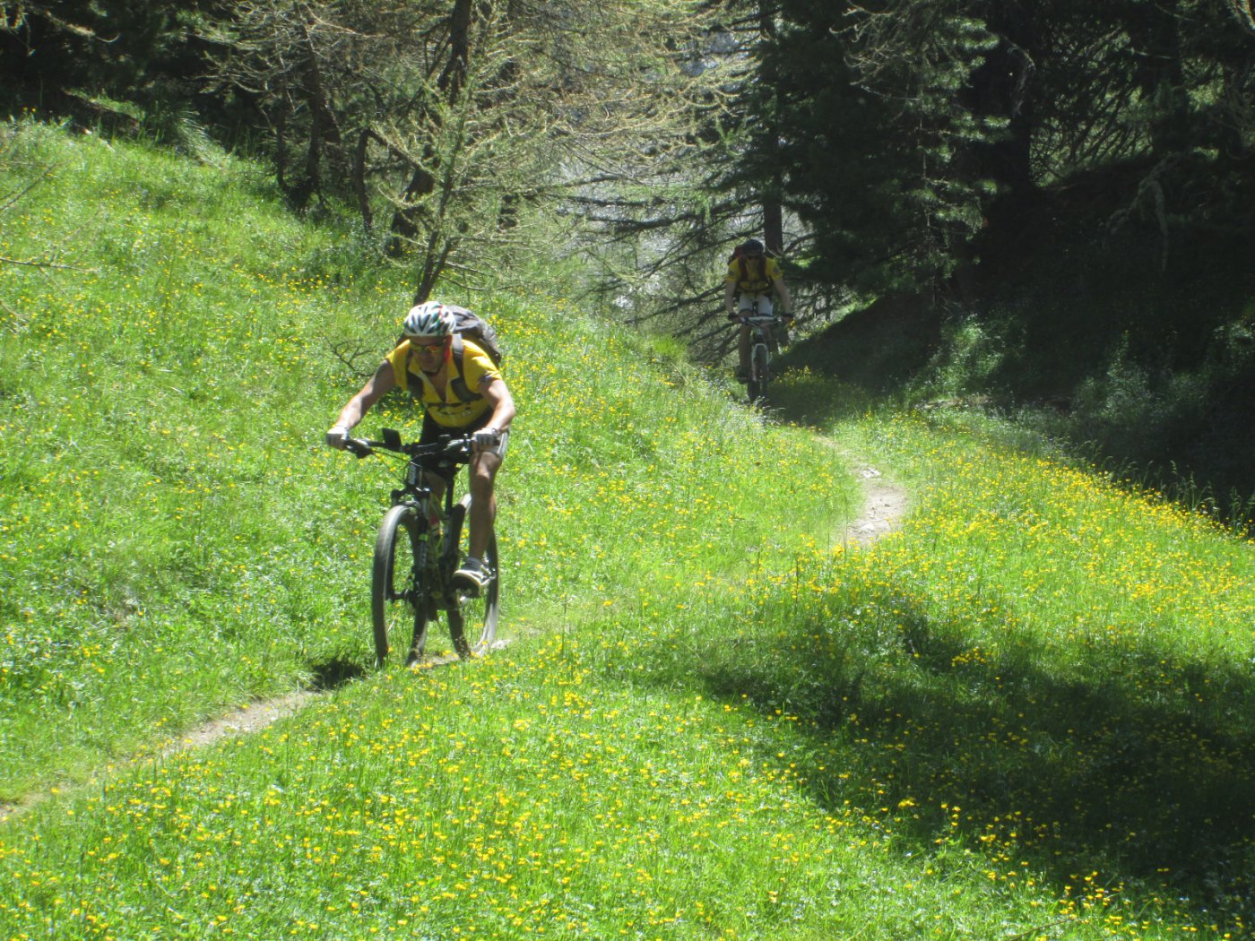 In discesa, una volti giunti a Thures, si scende su asfalto verso Bousson per qualche centinaio di metri, prestando attenzione ad un bivio a destra (indicazioni), dove stacca il sentiero ‘Deveis’; questo nel primo tratto non è ciclabile e obbliga a spingere la bici per qalche minuto, poi spiana e diventa veramente bello e facile, fondo compatto, pendenza quasi nulla inframezzata solo da un’altra risalita con un paio di tornanti, non sempre ciclabili; dopo un altro lungo e piacevole mezzacosta nel bosco il sentiero incrocia una sterrata che si segue a sinistra per breve tratto, sino ad incontrare un bivio a sinistra (è il tratturo dell’inizio della salita); si imbocca questo, e con qualche svolta e percorso facile e veloce (S0/MC) si ritorna al ponte di Rollieres.