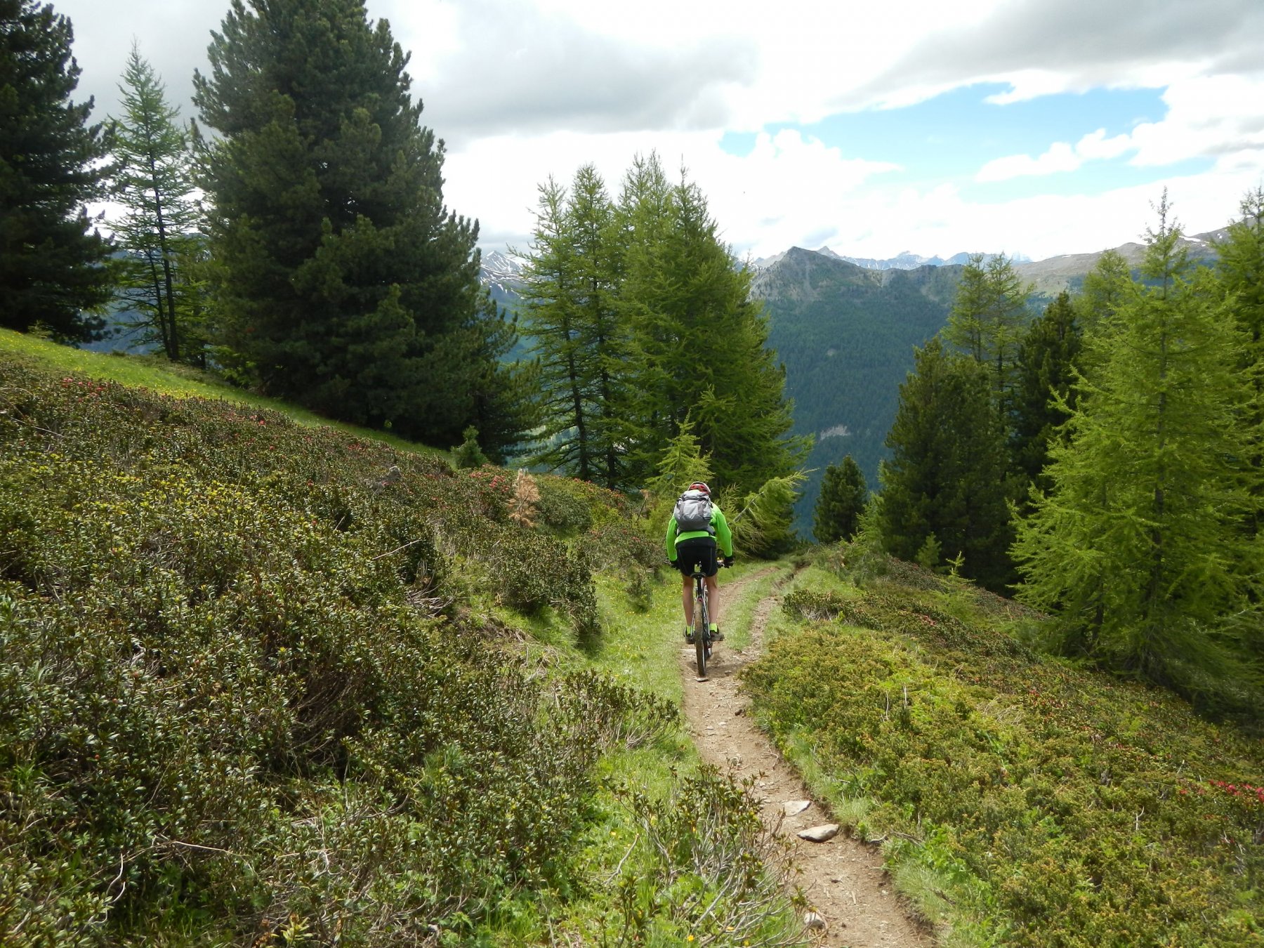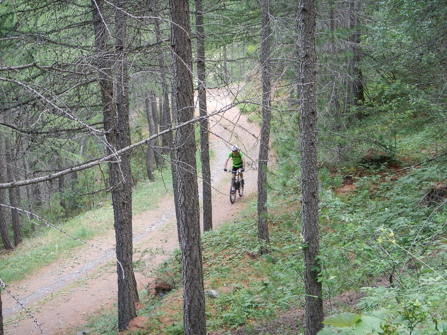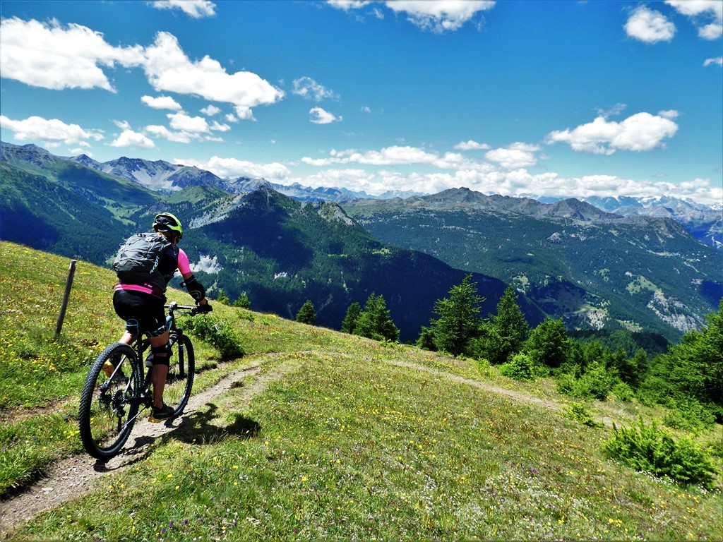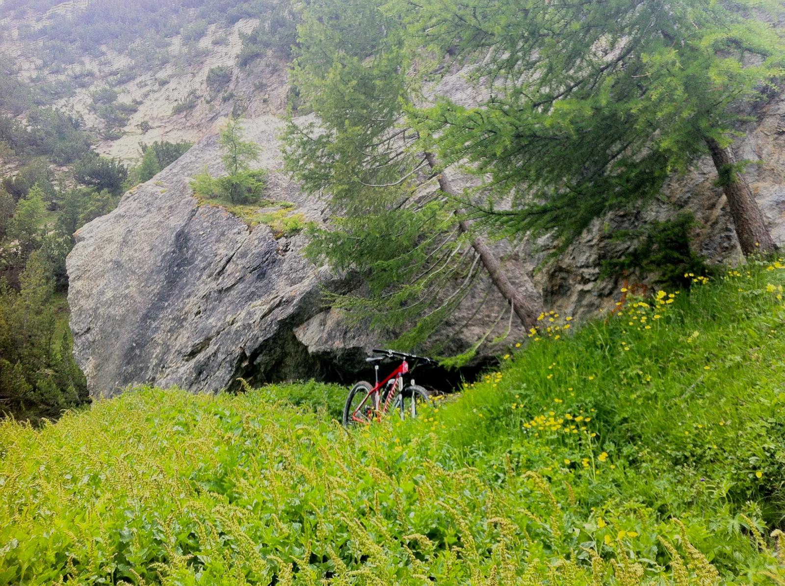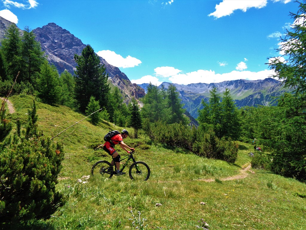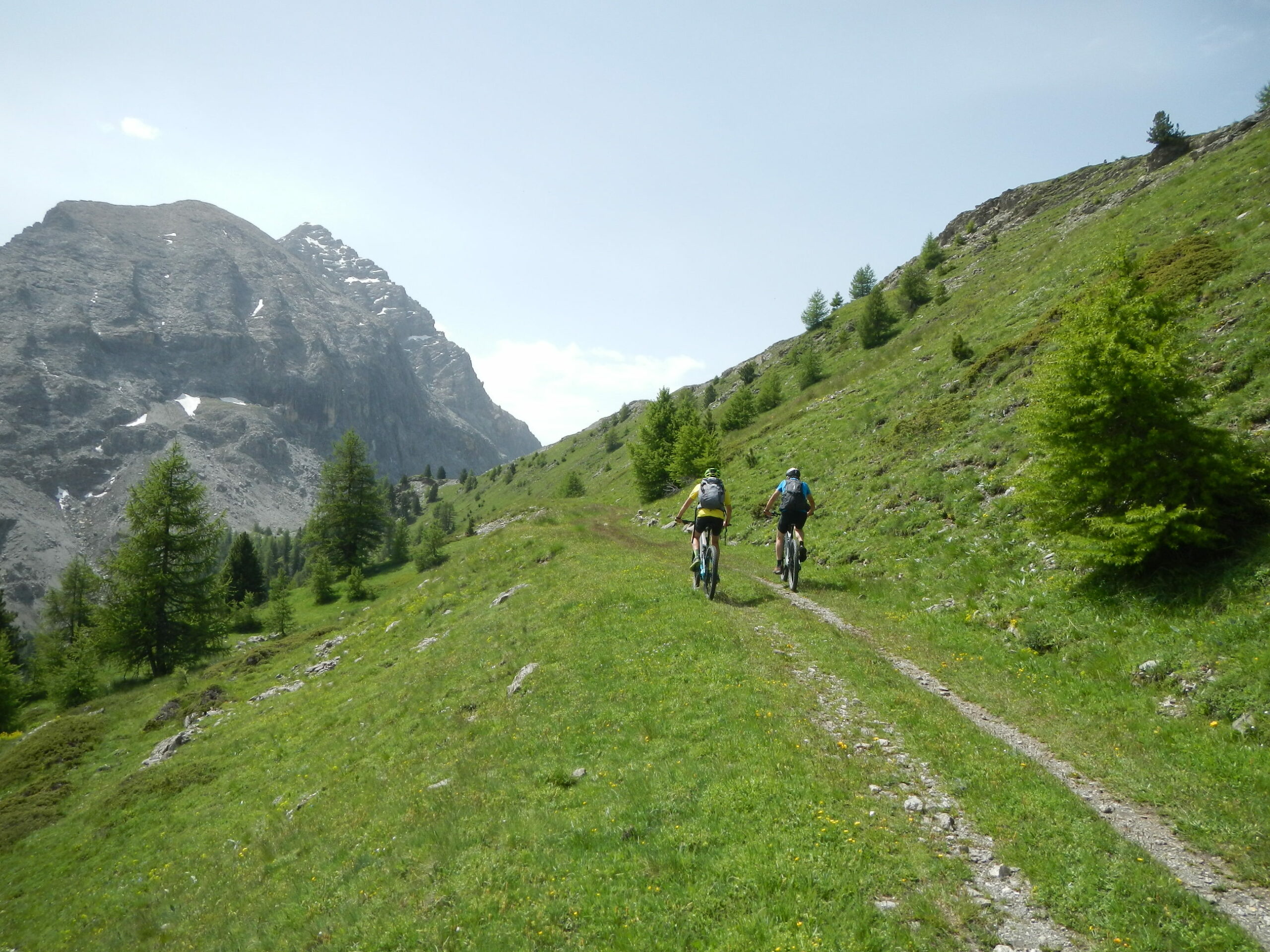In discesa, una volti giunti a Thures, si scende su asfalto verso Bousson per qualche centinaio di metri, prestando attenzione ad un bivio a destra (indicazioni), dove stacca il sentiero ‘Deveis’; questo nel primo tratto non è ciclabile e obbliga a spingere la bici per qalche minuto, poi spiana e diventa veramente bello e facile, fondo compatto, pendenza quasi nulla inframezzata solo da un’altra risalita con un paio di tornanti, non sempre ciclabili; dopo un altro lungo e piacevole mezzacosta nel bosco il sentiero incrocia una sterrata che si segue a sinistra per breve tratto, sino ad incontrare un bivio a sinistra (è il tratturo dell’inizio della salita); si imbocca questo, e con qualche svolta e percorso facile e veloce (S0/MC) si ritorna al ponte di Rollieres.