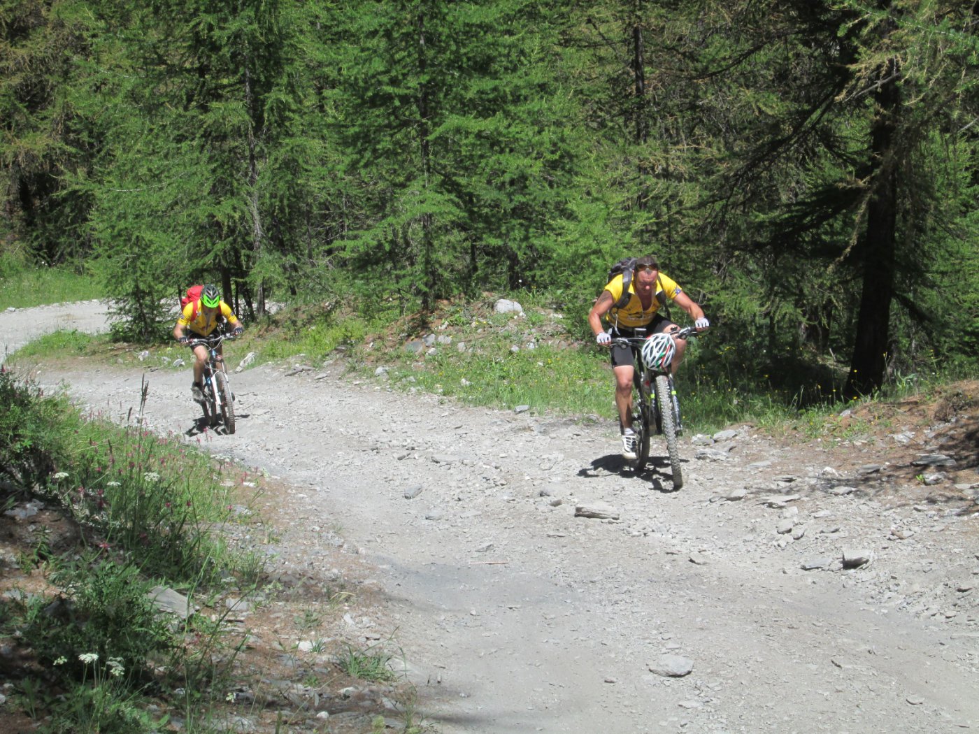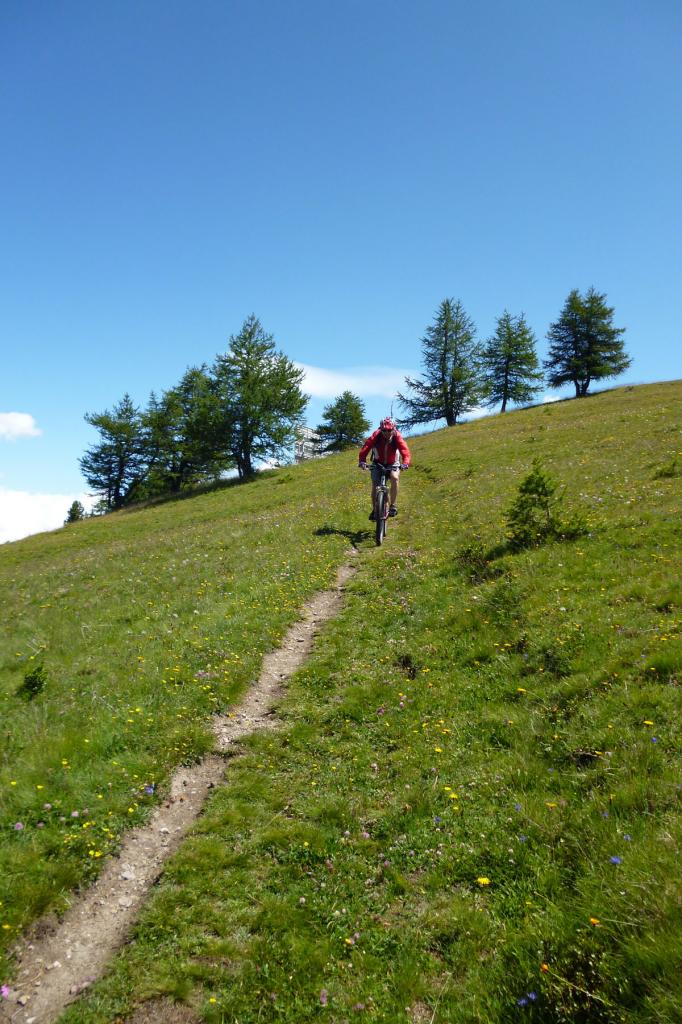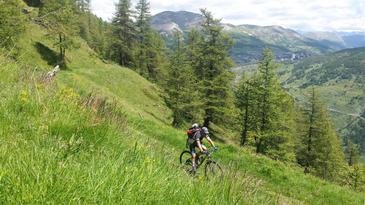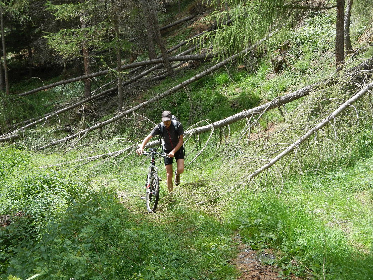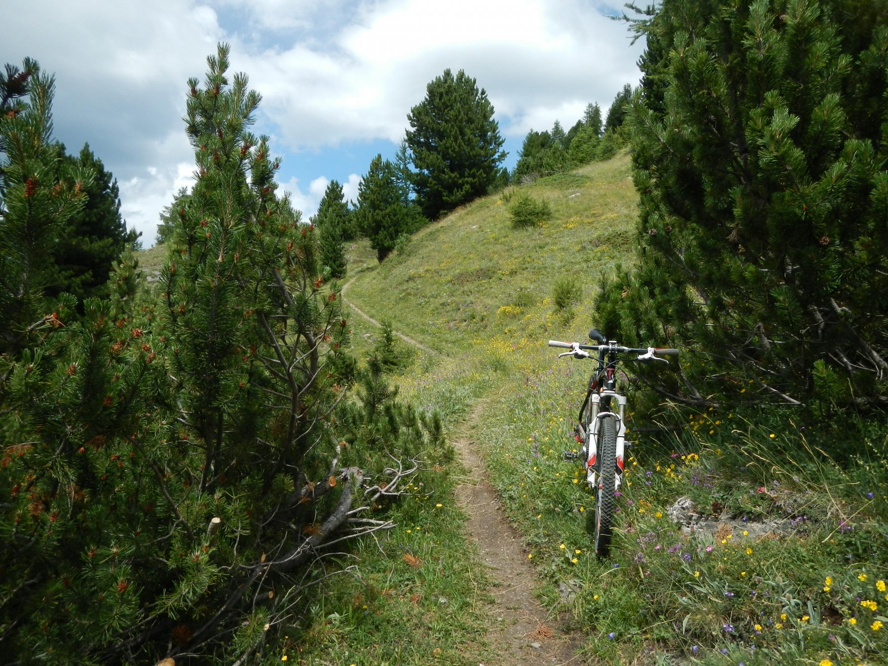 In discesa, una volti giunti a Thures, si scende su asfalto verso Bousson per qualche centinaio di metri, prestando attenzione ad un bivio a destra (indicazioni), dove stacca il sentiero ‘Deveis’; questo nel primo tratto non è ciclabile e obbliga a spingere la bici per qalche minuto, poi spiana e diventa veramente bello e facile, fondo compatto, pendenza quasi nulla inframezzata solo da un’altra risalita con un paio di tornanti, non sempre ciclabili; dopo un altro lungo e piacevole mezzacosta nel bosco il sentiero incrocia una sterrata che si segue a sinistra per breve tratto, sino ad incontrare un bivio a sinistra (è il tratturo dell’inizio della salita); si imbocca questo, e con qualche svolta e percorso facile e veloce (S0/MC) si ritorna al ponte di Rollieres.