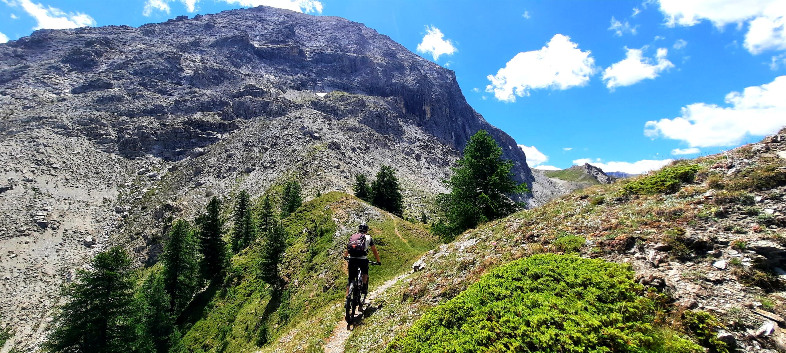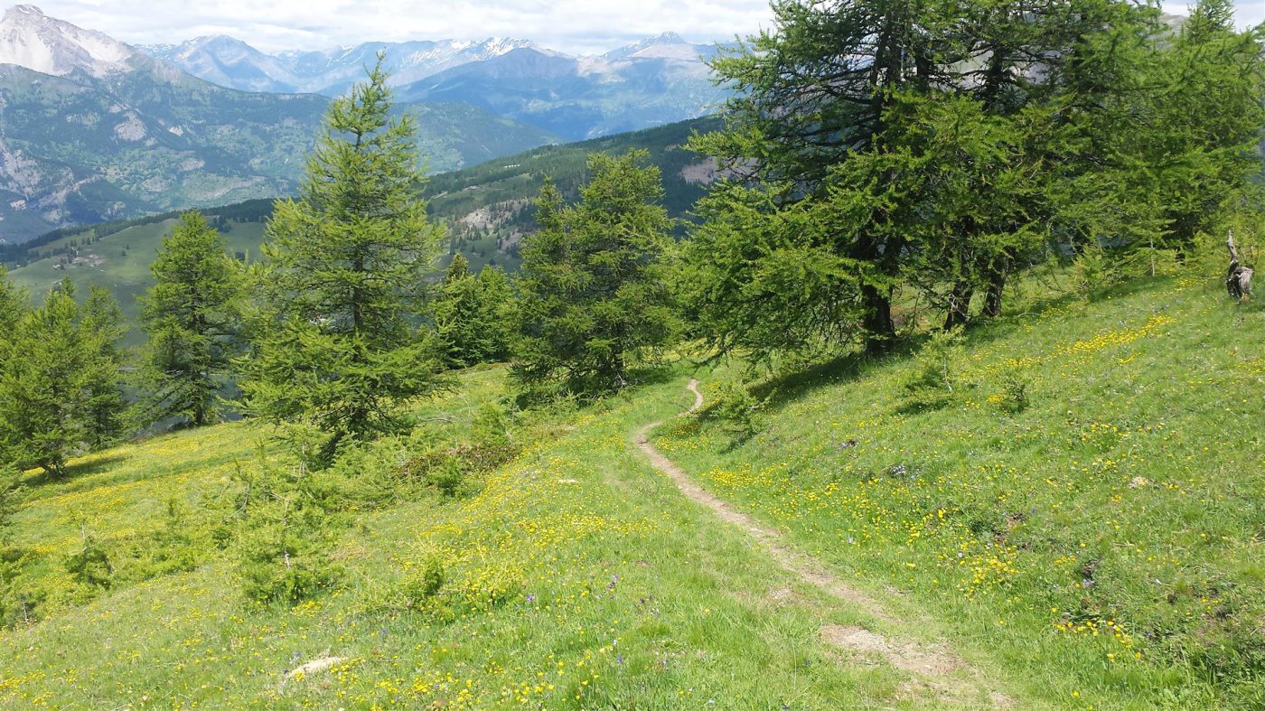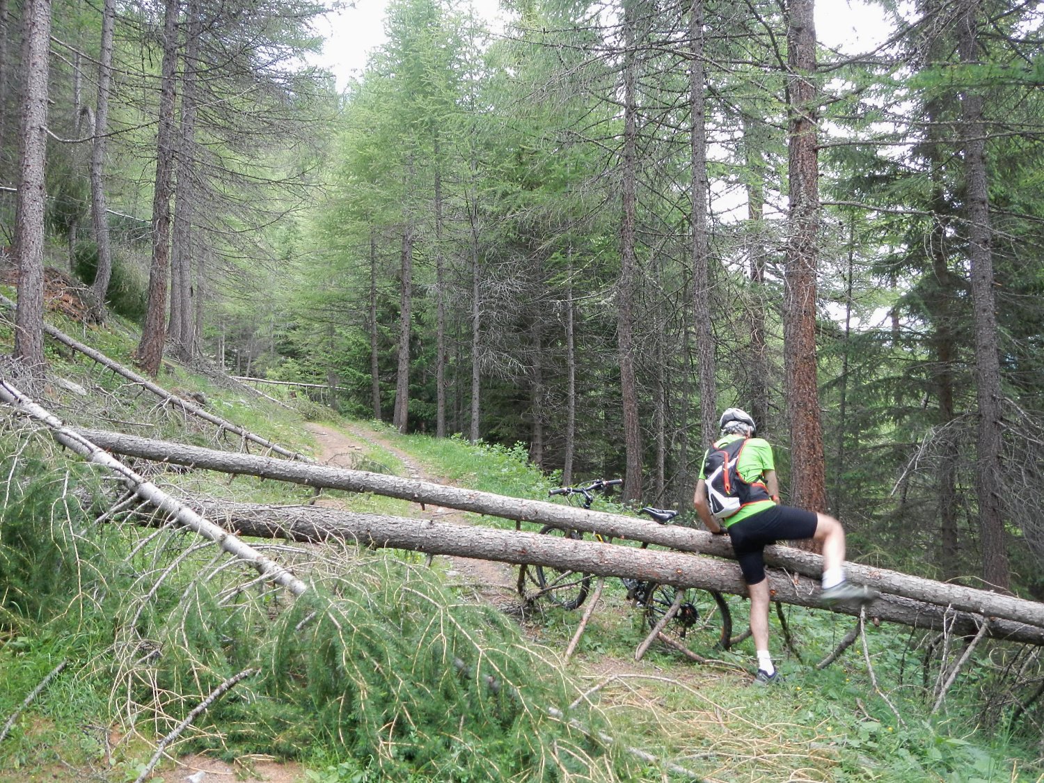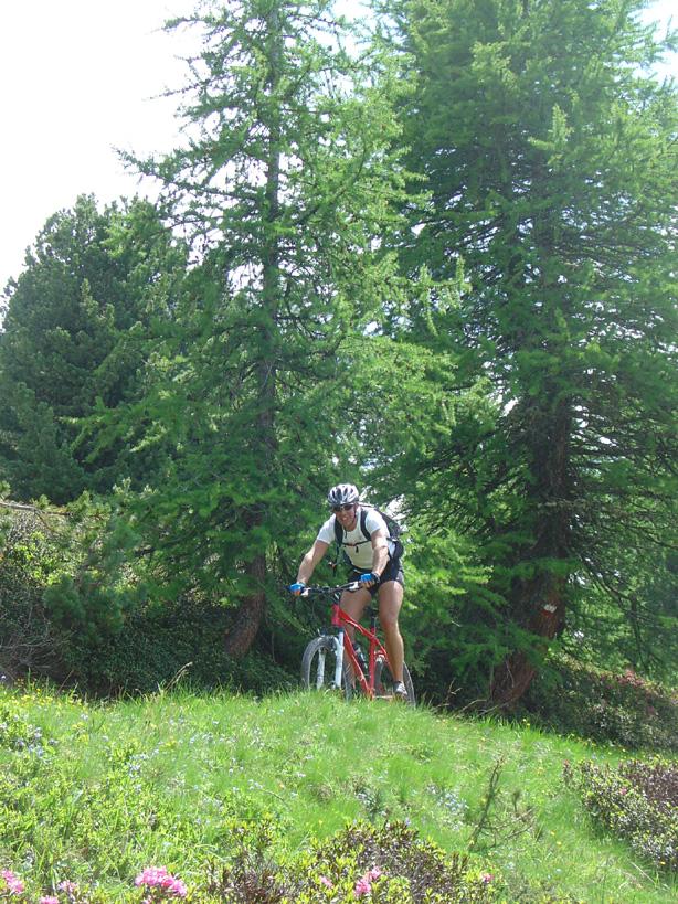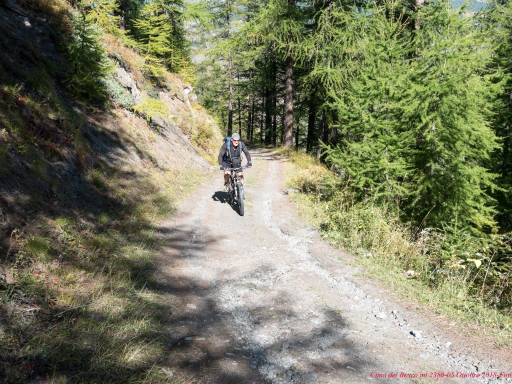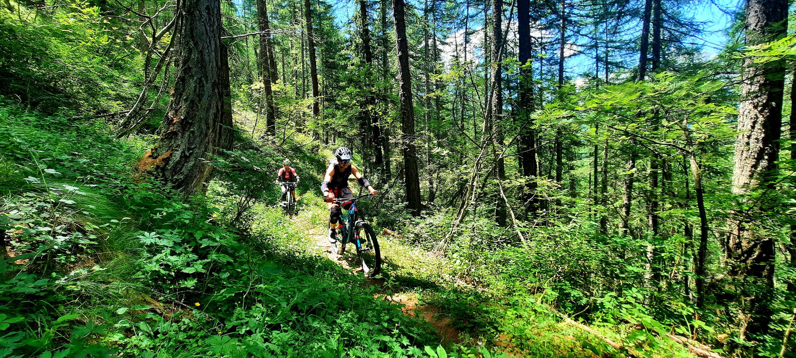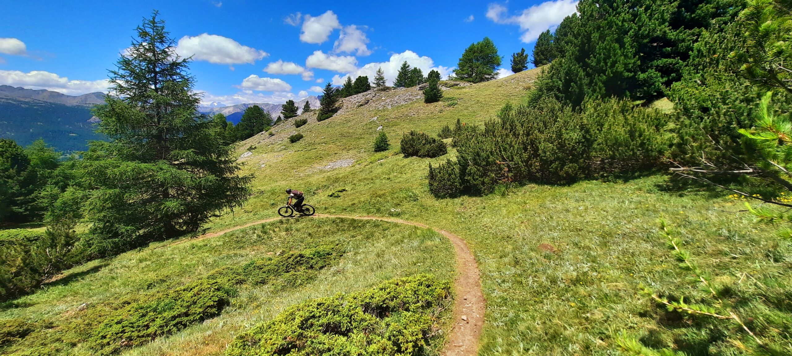 In discesa, una volti giunti a Thures, si scende su asfalto verso Bousson per qualche centinaio di metri, prestando attenzione ad un bivio a destra (indicazioni), dove stacca il sentiero ‘Deveis’; questo nel primo tratto non è ciclabile e obbliga a spingere la bici per qalche minuto, poi spiana e diventa veramente bello e facile, fondo compatto, pendenza quasi nulla inframezzata solo da un’altra risalita con un paio di tornanti, non sempre ciclabili; dopo un altro lungo e piacevole mezzacosta nel bosco il sentiero incrocia una sterrata che si segue a sinistra per breve tratto, sino ad incontrare un bivio a sinistra (è il tratturo dell’inizio della salita); si imbocca questo, e con qualche svolta e percorso facile e veloce (S0/MC) si ritorna al ponte di Rollieres.
