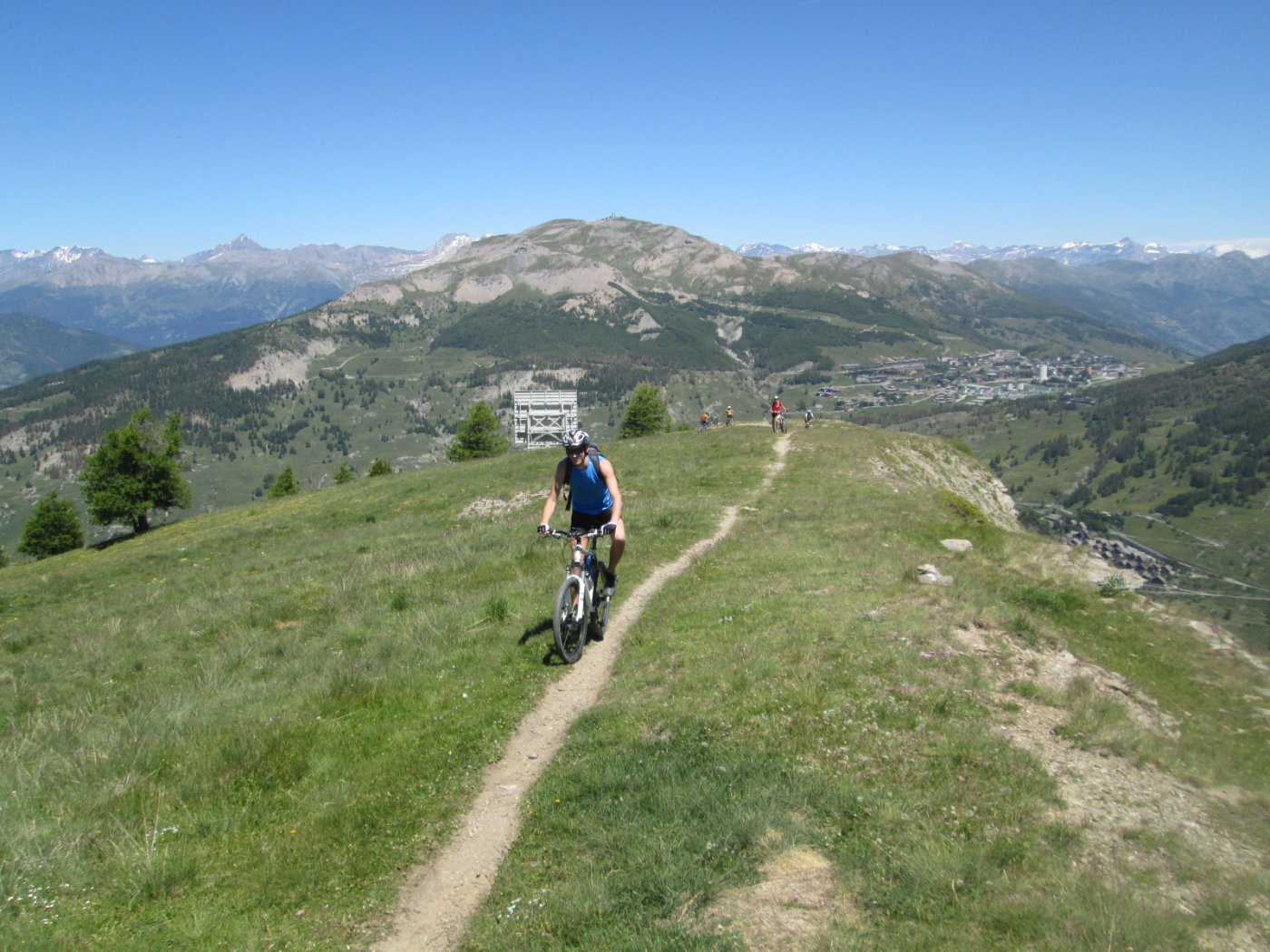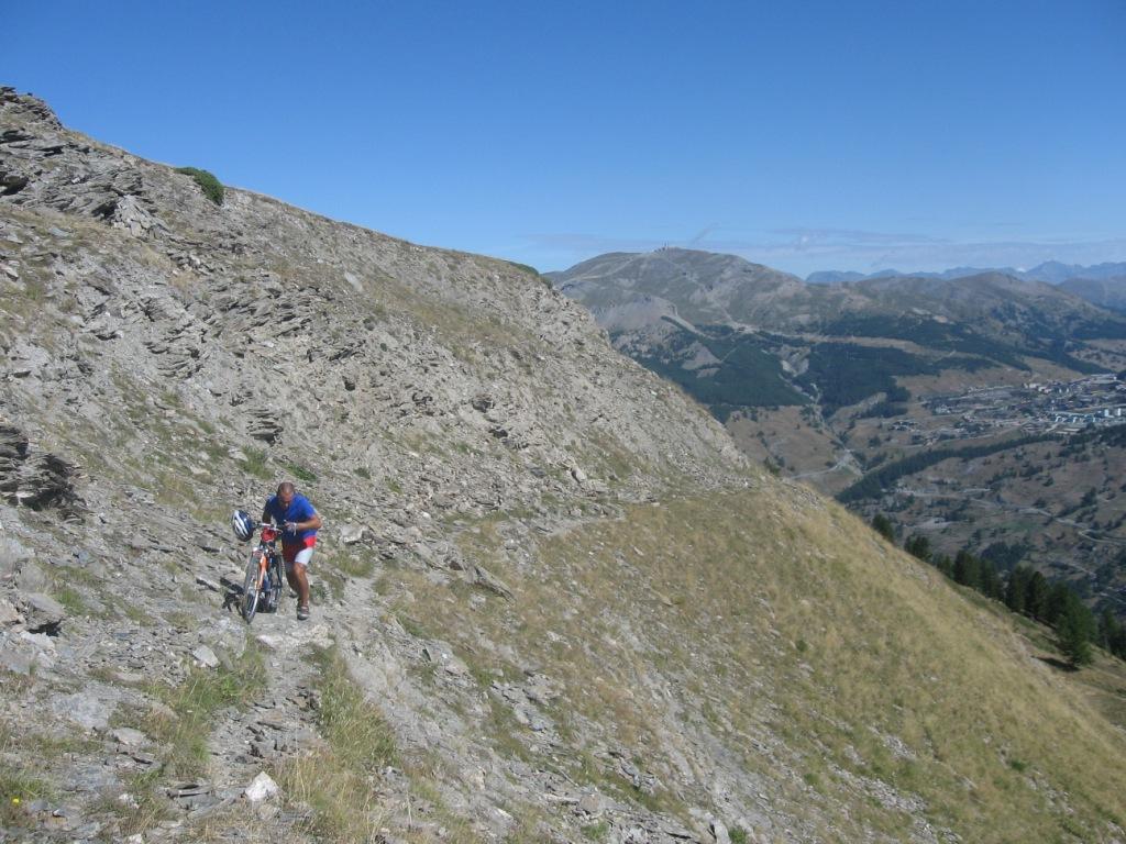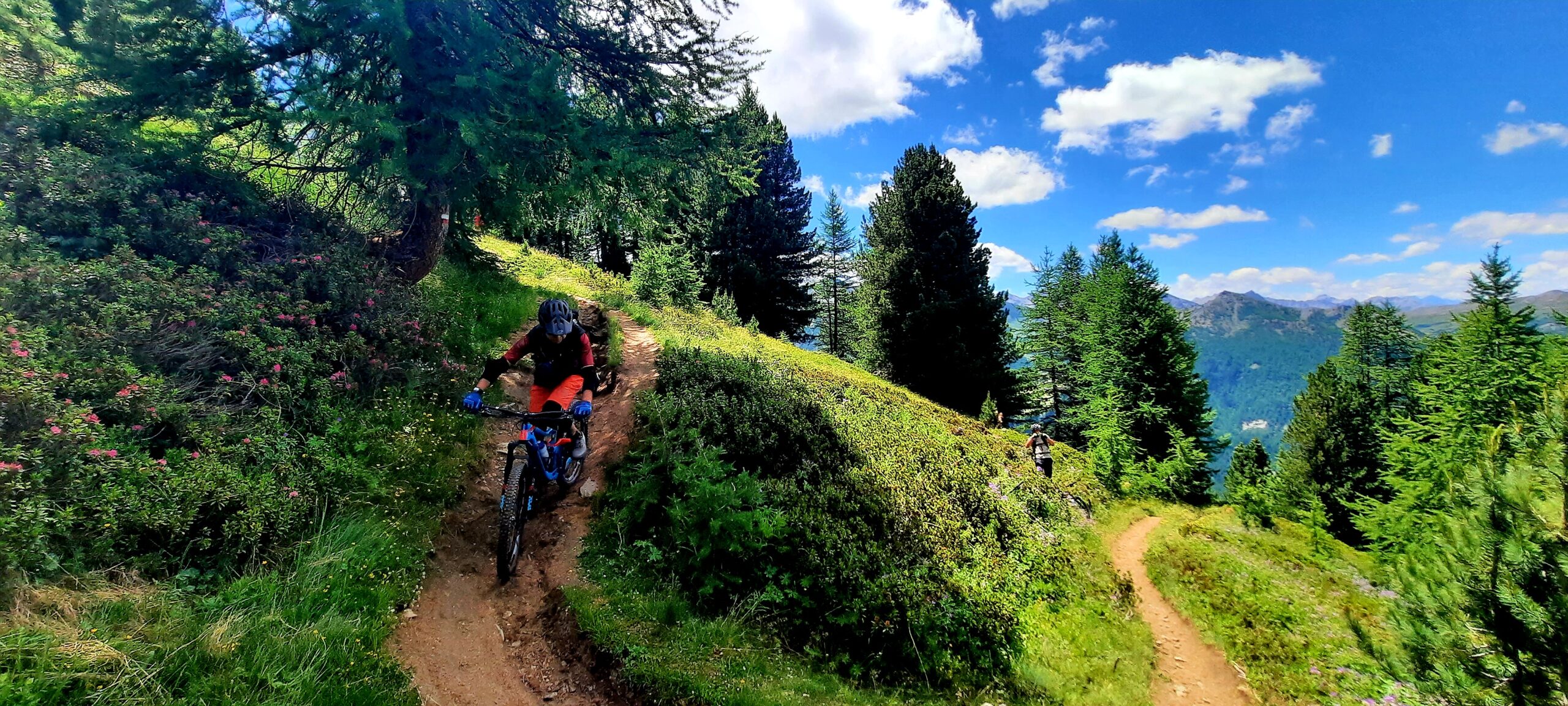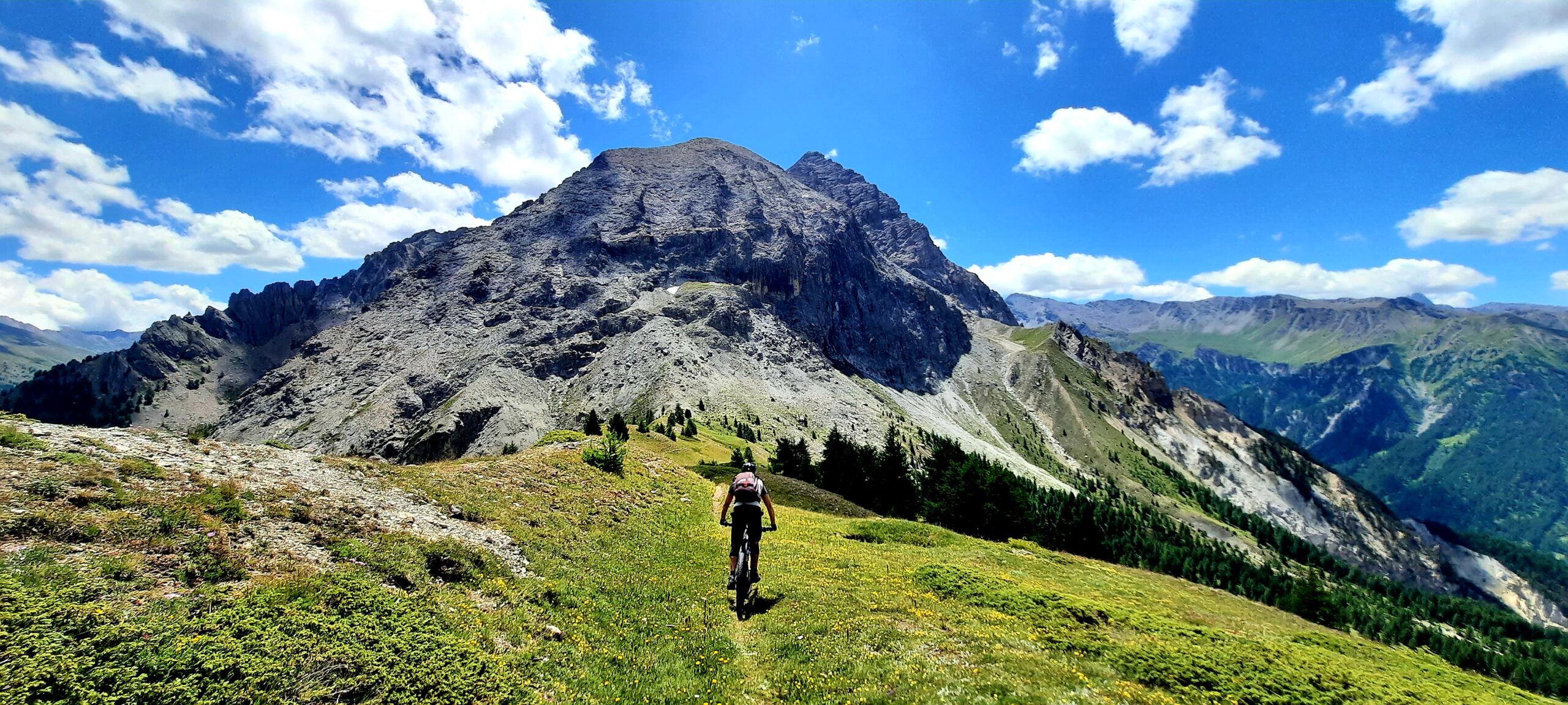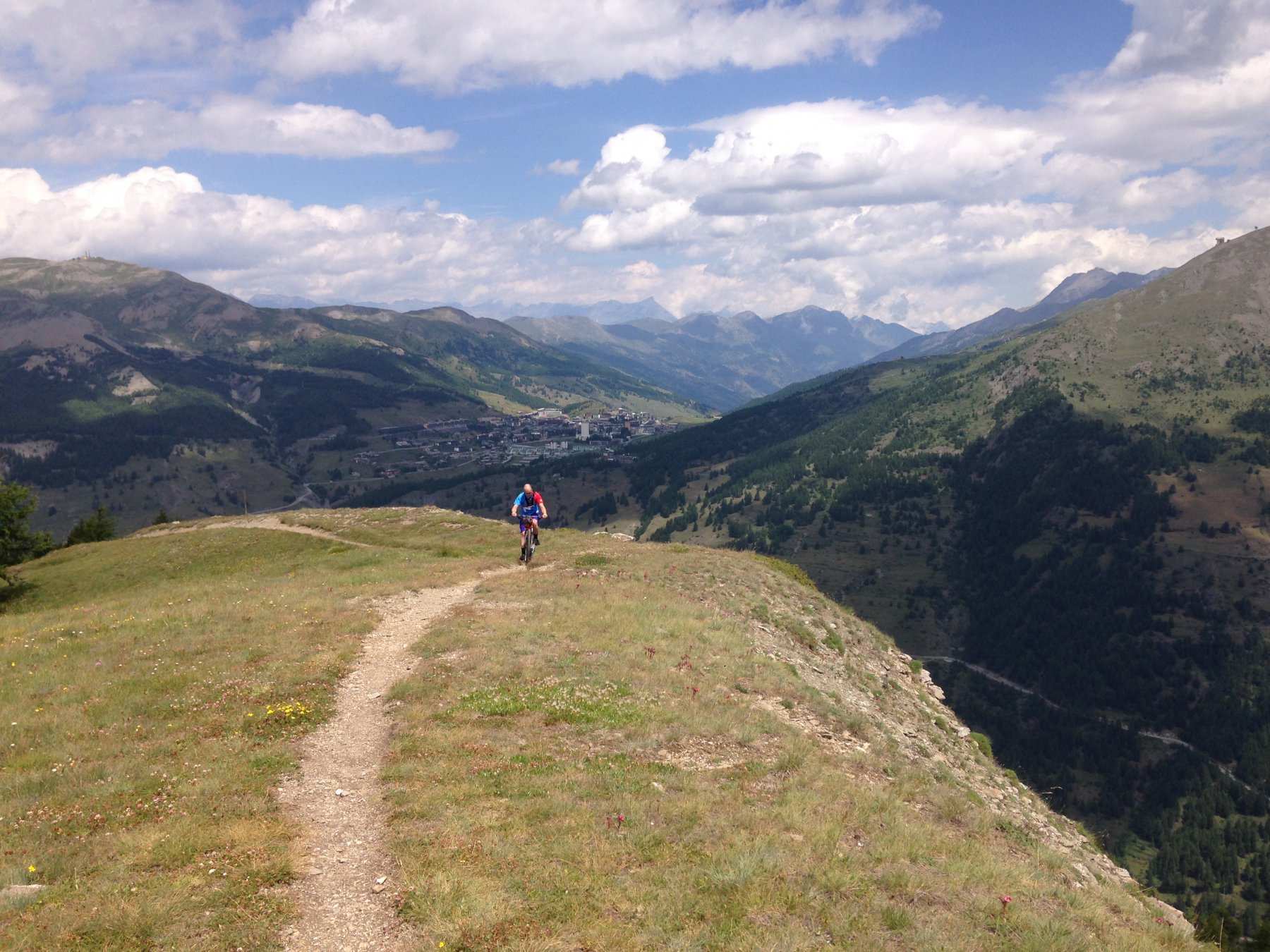 In discesa, una volti giunti a Thures, si scende su asfalto verso Bousson per qualche centinaio di metri, prestando attenzione ad un bivio a destra (indicazioni), dove stacca il sentiero ‘Deveis’; questo nel primo tratto non è ciclabile e obbliga a spingere la bici per qalche minuto, poi spiana e diventa veramente bello e facile, fondo compatto, pendenza quasi nulla inframezzata solo da un’altra risalita con un paio di tornanti, non sempre ciclabili; dopo un altro lungo e piacevole mezzacosta nel bosco il sentiero incrocia una sterrata che si segue a sinistra per breve tratto, sino ad incontrare un bivio a sinistra (è il tratturo dell’inizio della salita); si imbocca questo, e con qualche svolta e percorso facile e veloce (S0/MC) si ritorna al ponte di Rollieres.