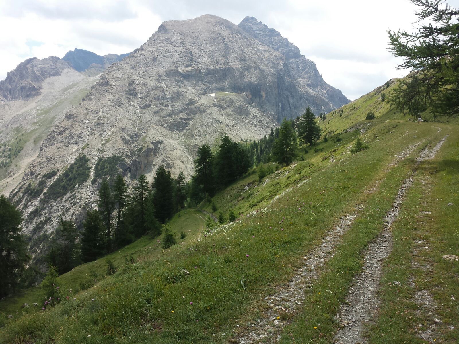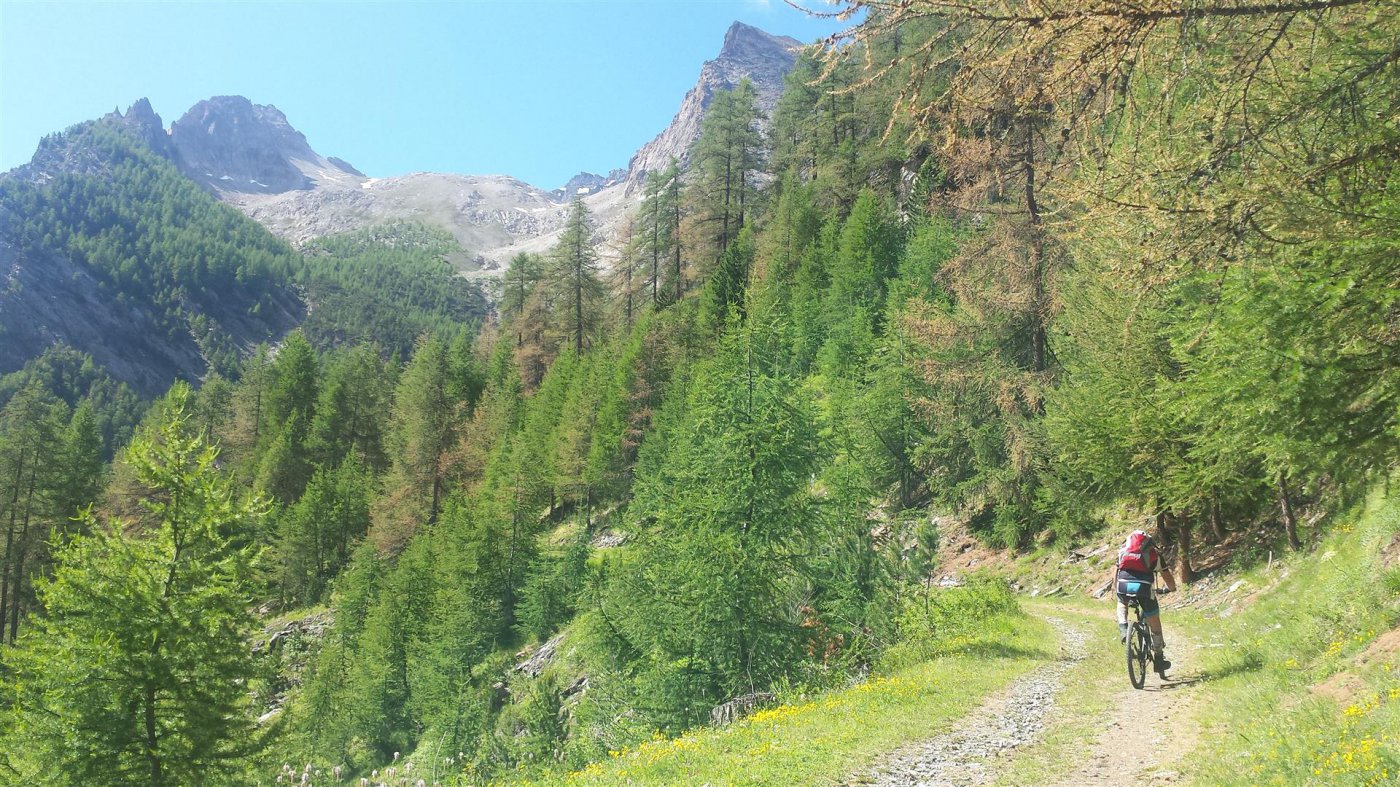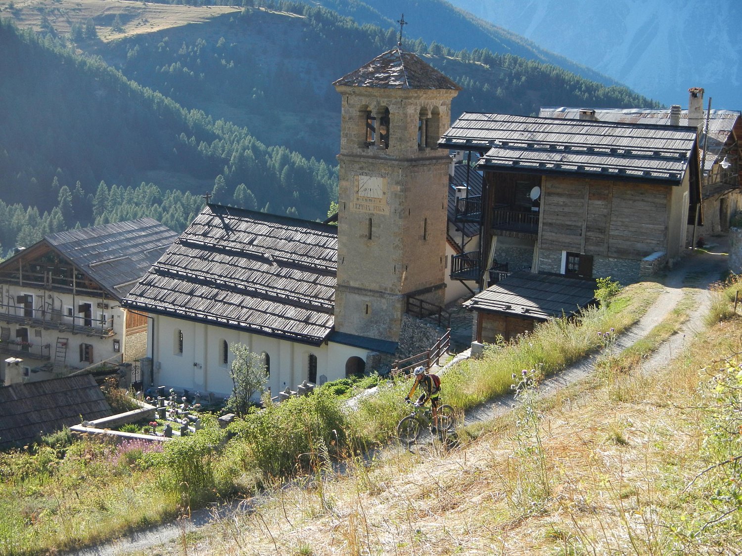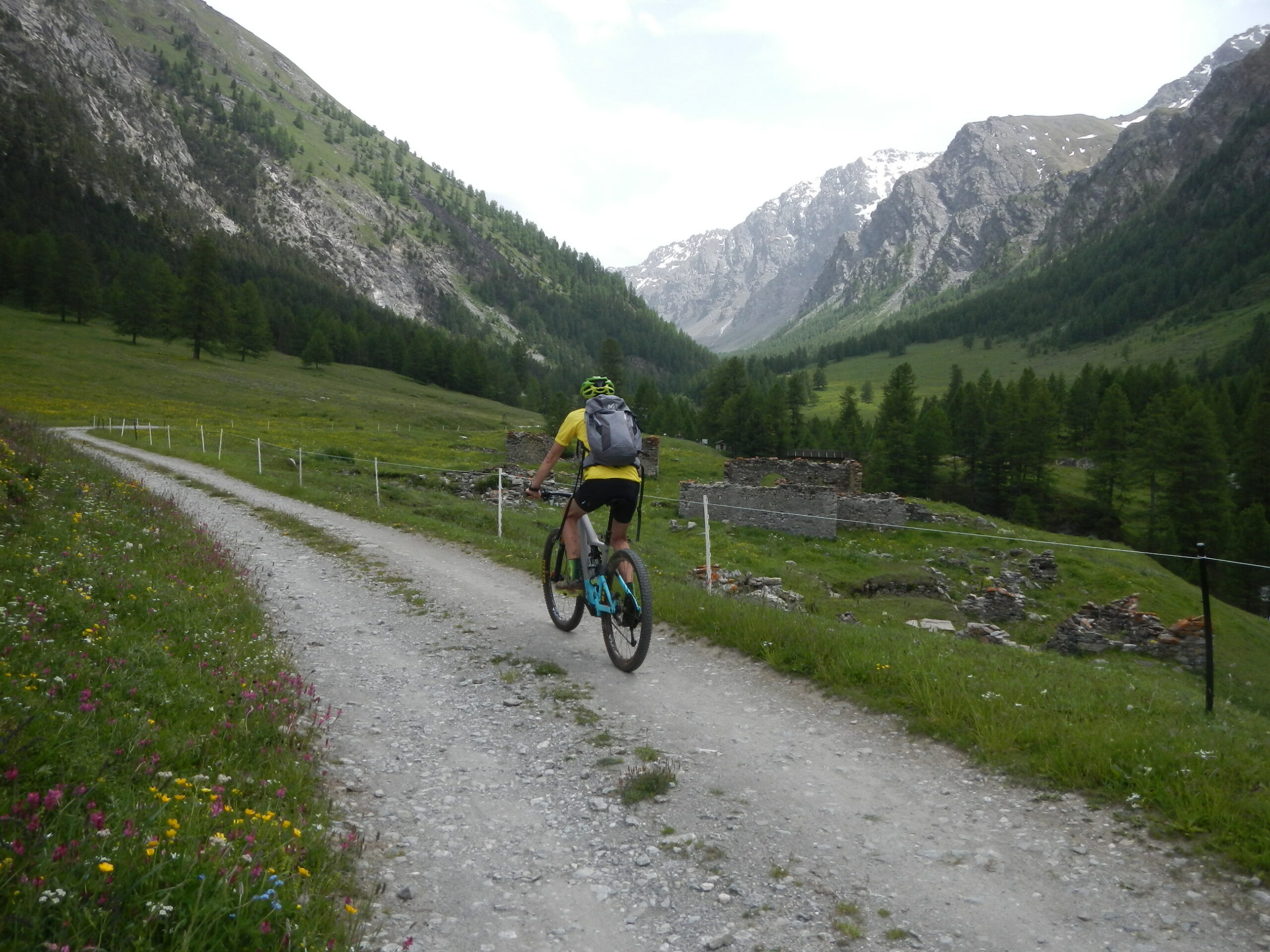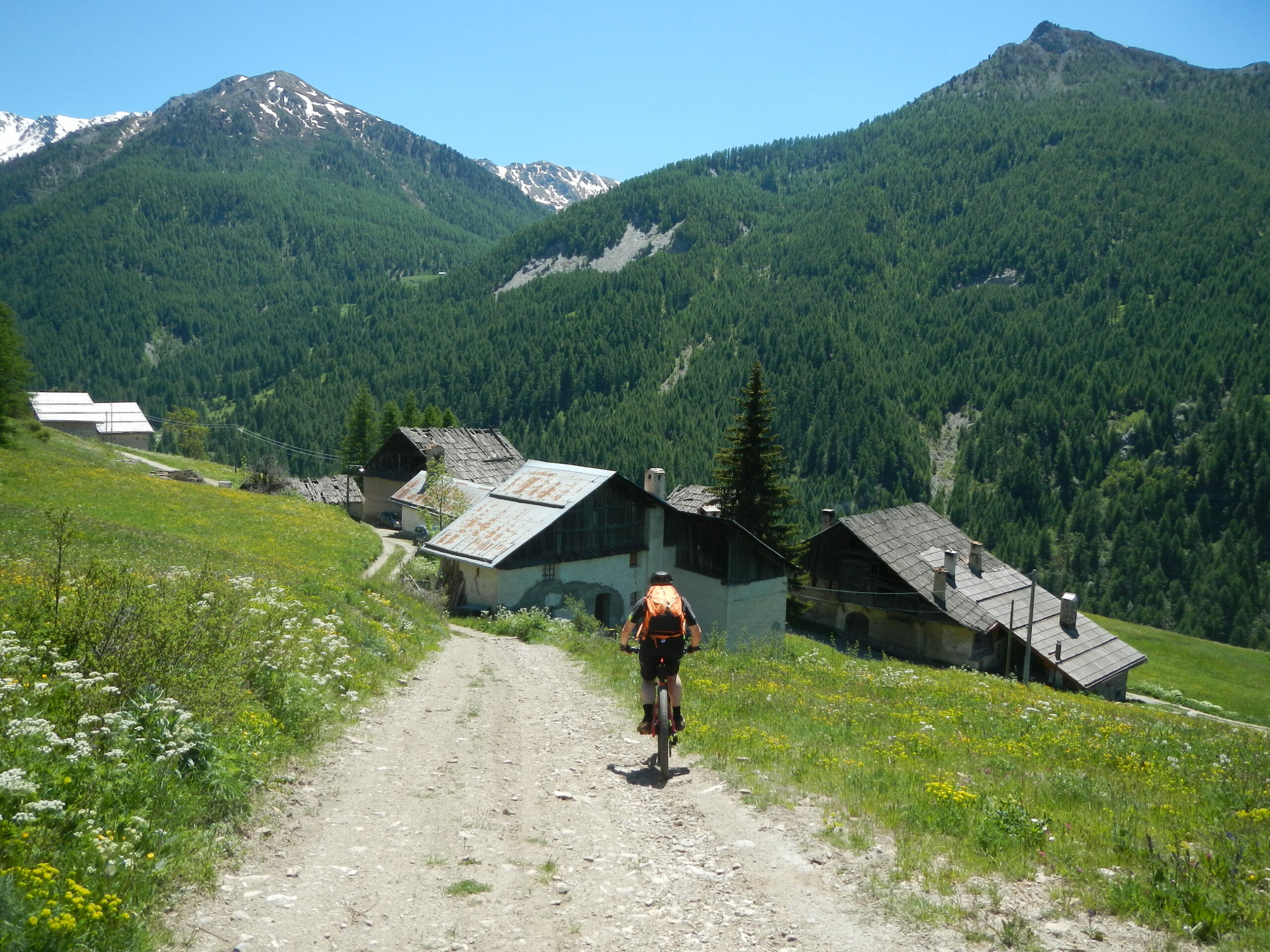 Ora si ritorna da dove si è arrivati per pochi metri e si comincia a scendere su un sentiero a sinistra che, sempre ciclabile e mai difficile, porta alla borgata di Thures a metri 1615, raggiunta la sterrata poco sopra Thures, si va a sinistra (est) e si segue la strada fino alla borgata di Ruilles, si attraversa il Torrente Thuras e si procede alla volta di Bousson sempre su sterrata.