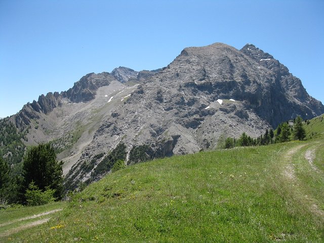 Da Bousson si sale a Sauze di Cesana 1560 m circa, si attraversa il ponte delle Albere e si va a destra (ovest) su una strada con pendenza sempre regolare e splendida che si inoltra nel lariceto e sale sul versante nord della nostra montagna e, in circa 9 km e con un ultimissimo strappetto a spinta, porta in cima alla nostra meta a quota 2376 m ove sorge una cappella/ricovero utile riparo in caso di maltempo.