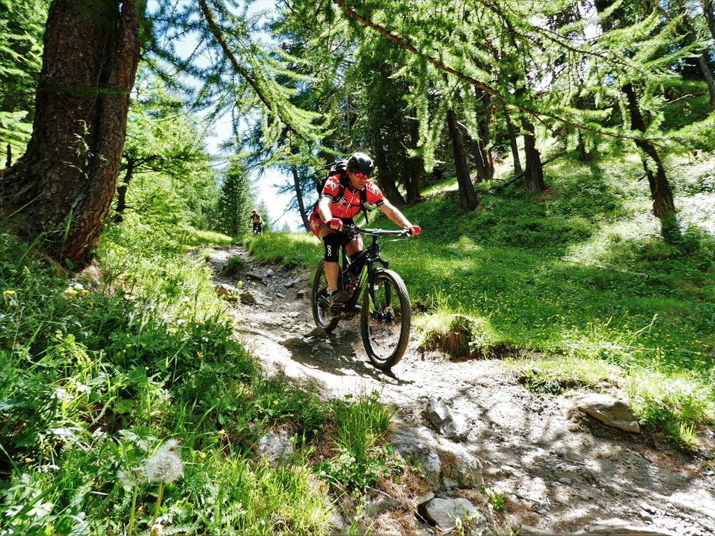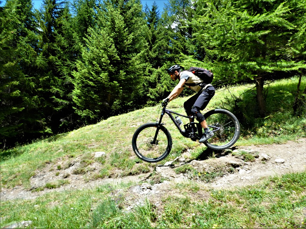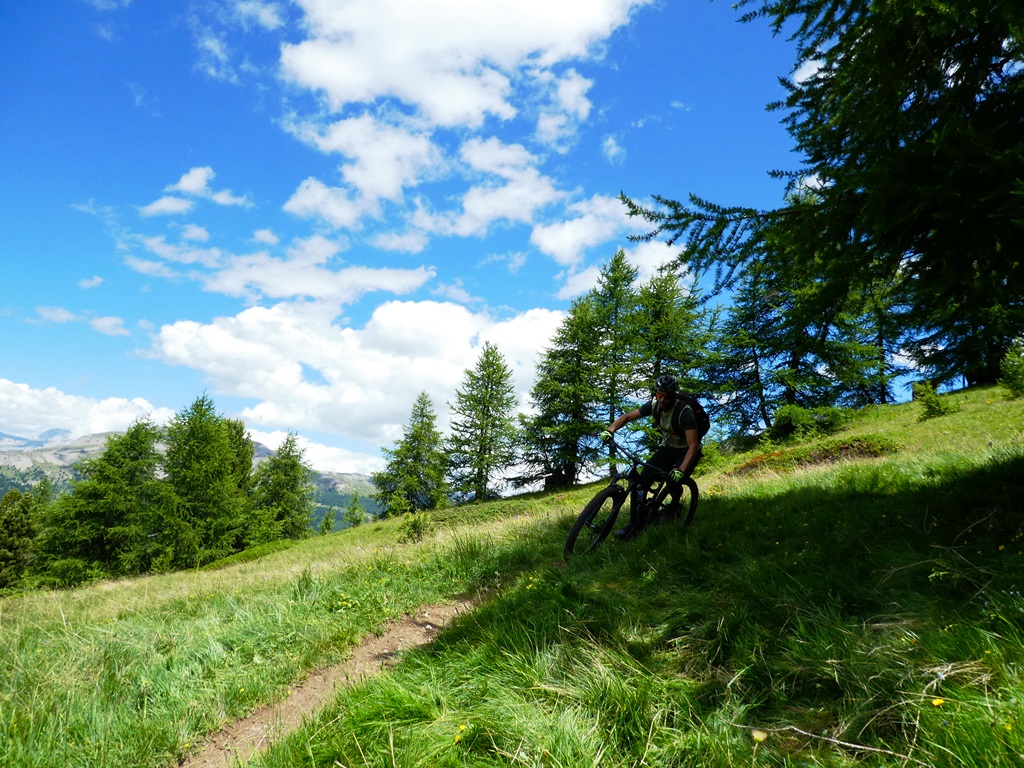Partenza da Rollieres, salita alla cima per la sterrata nel bosco, con l’ultimo tratto veramente panoramico. Dalla cappella discesa su Thures su sentiero molto bello e dal fondo compatto che alterna tratti nel bosco a passaggi in splendide radure. Da Thures scesi sino ad imboccare il sentiero Deveis che, dopo il ripido tratto a spinta iniziale, si snoda su un mezzacosta divertente, sino alla discesa finale sul ponte di Rollieres.