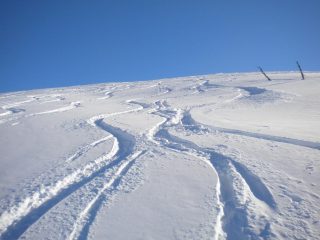 Farina bellissima, clima ottimo, qualche linea ancora da tritare. Molti ronzii di frullini in mattinata, eliskif già all’opera con rischio marcato?! Parte alta con neve leggera, polverosa e neanche troppo tracciata sulla dx del bosco, valeva un giusto bis. Lenta e umida dalla baitella in giù. Salut