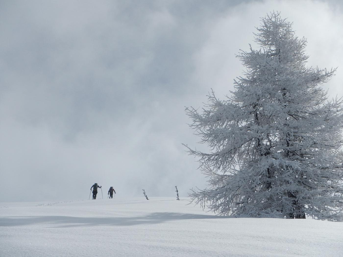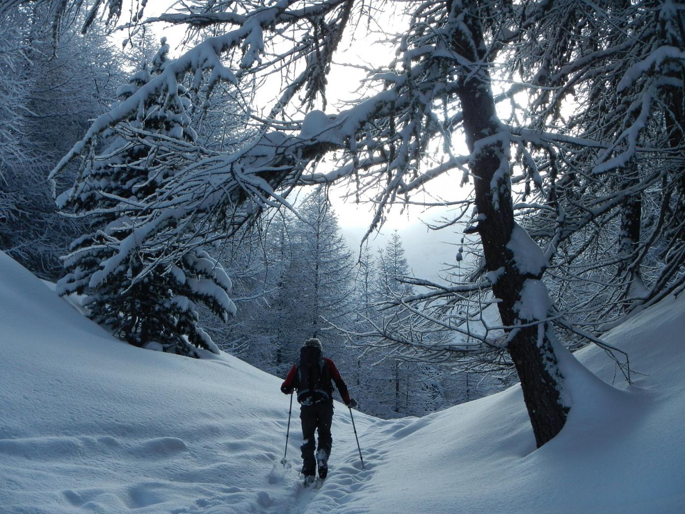 Facile itinerario invernale che si sviluppa su pendii di moderata pendenza e privi di pericoli; oggi salita e discesa si sono svolte in un ambiente molto bello per la recente e copiosa nevicata.