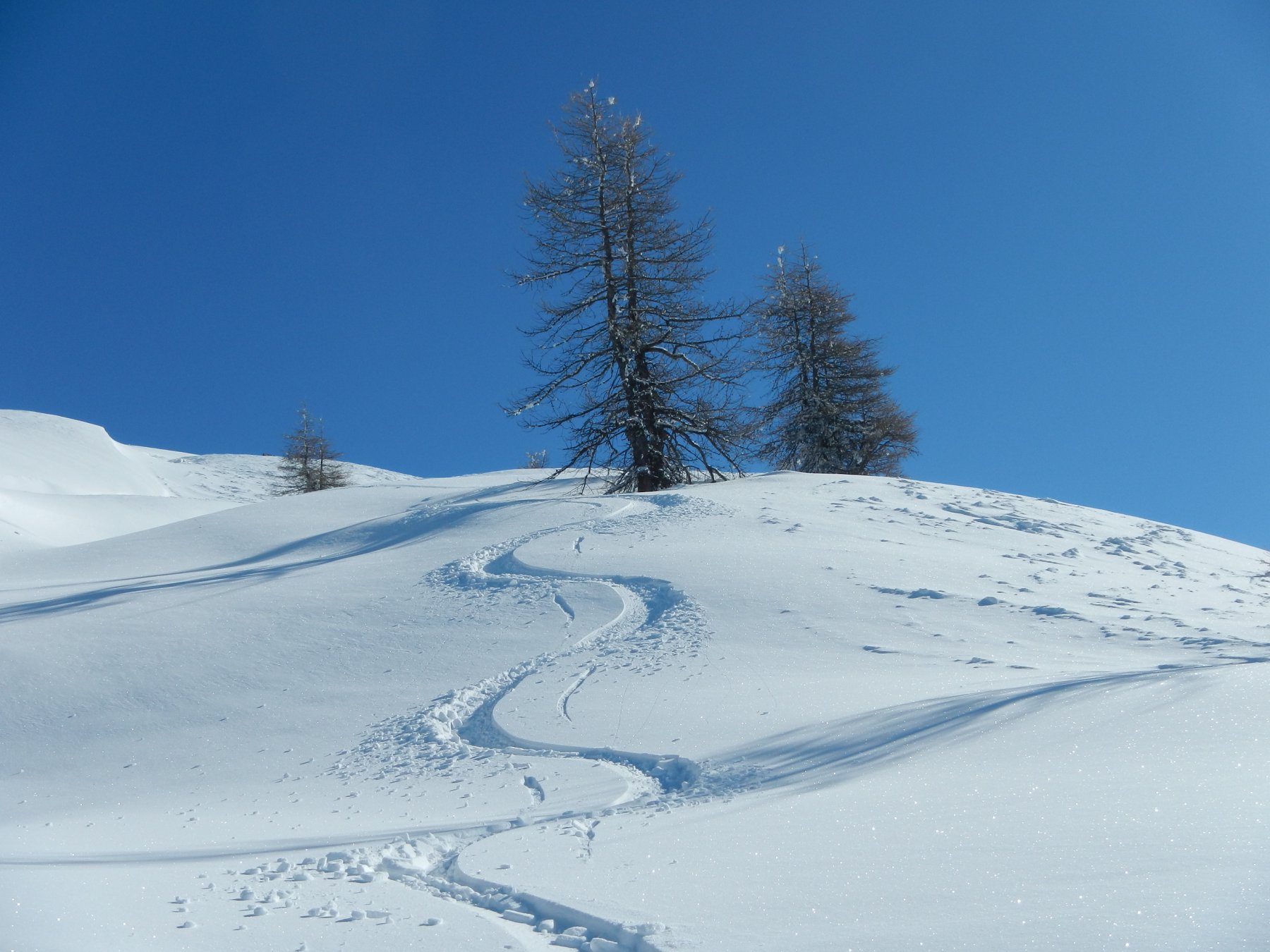 Neve in veloce fase di umidificazione….ancora bella nella parte medio alta, avendo cura di scendere nei valloncelli meno esposti all’azione del sole.