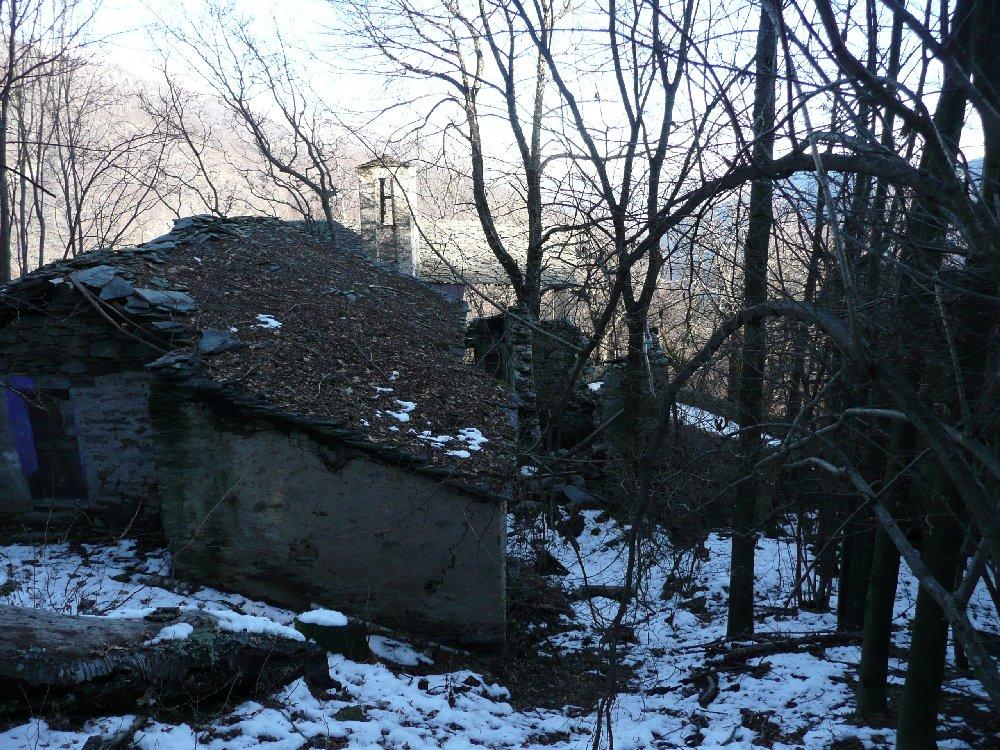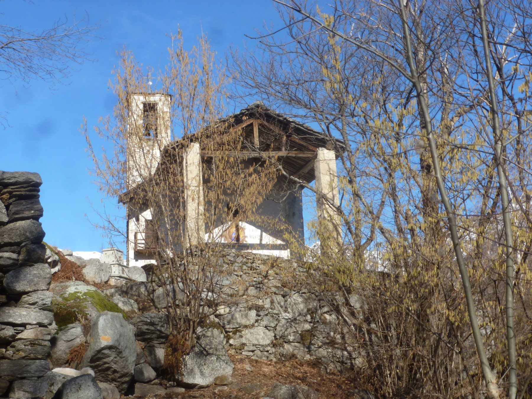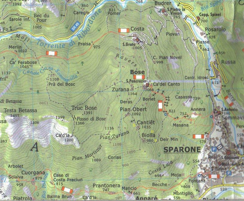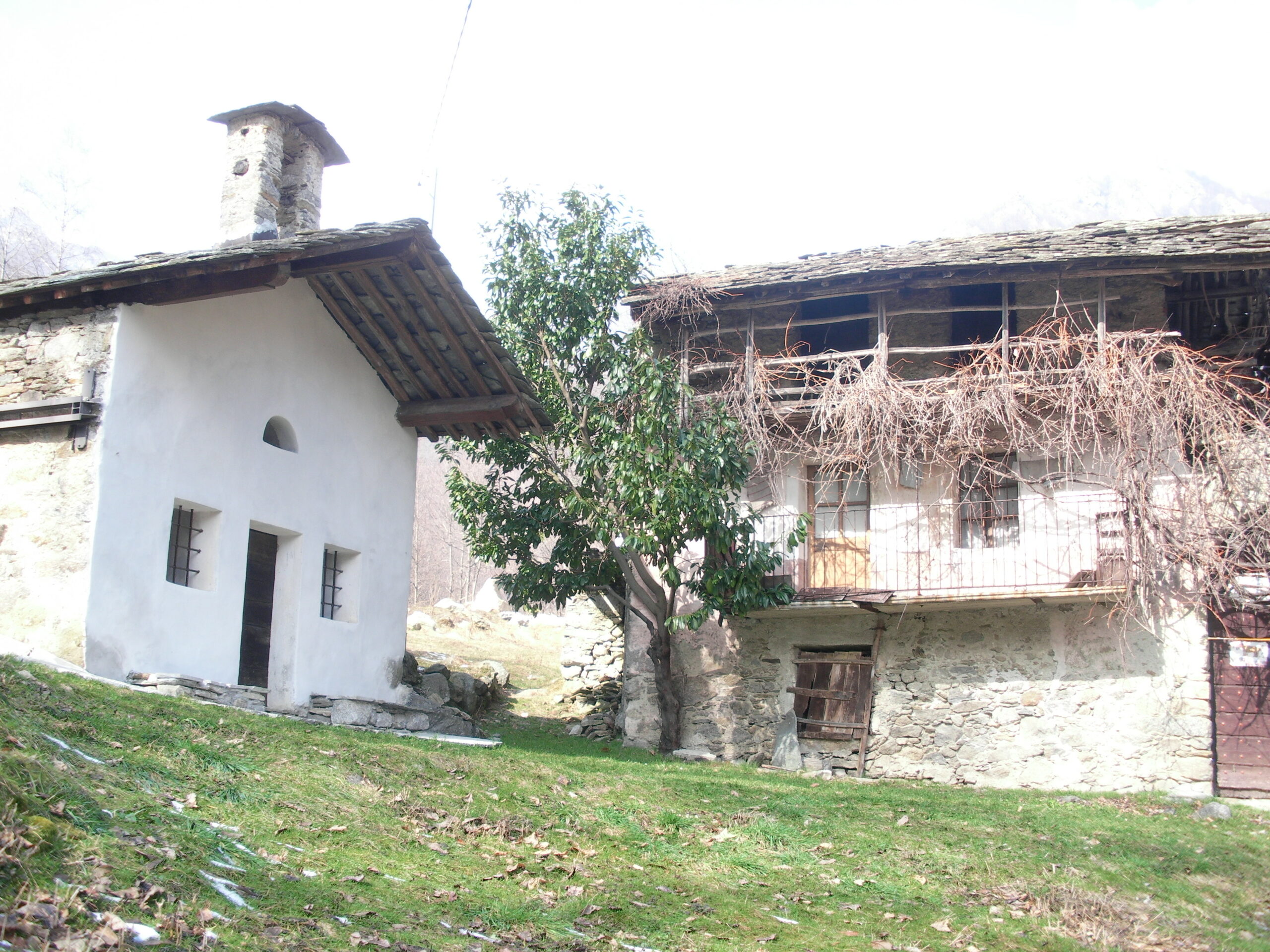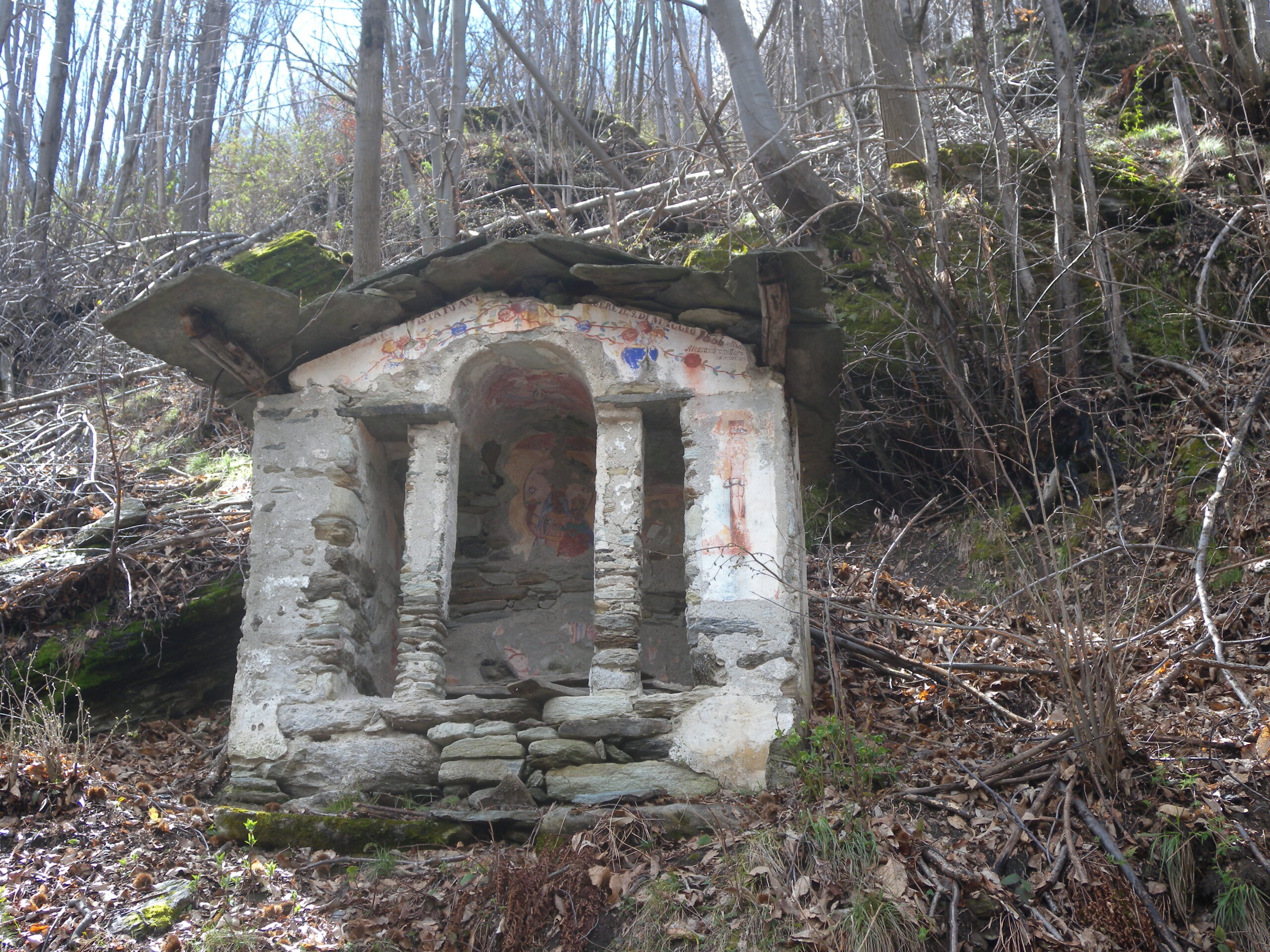 Ora all’altezza dei resti dell’invaso arriva una recente poderale di servizio per gli impianti di ricaduta delle acque per la sottostante centrale, il percorso prosegue sulla nuova poderale (il sentiero è praticamente scomparso per un lungo tratto siano a giungere ad un tornate a dx e superandolo di poco a dx si trova il sentiero che entra di li a poco nel borgo, ormai del tutto abbandonato di Costa 1005 m con al chiesetta di San Grato, piccola e spartana (risalente a prima del 1700) di qui per il sentiero che attraversa verso valle le case si ritorna a brevissimo sulla poderale che si segue fino al secondo tornante verso sx dove si trova di nuovo il sentiero (tacche gialle) che consente di tagliare per 2 volte la strada pressochè nello stesso punto (cartina MU perfetta) sino alla sbarra di divieto di accesso alla borgata Budrer 770 m che si compone un caratteristico gruppo di piccole case che si affacciano su un unico cortile chiuso da un antico portone, all’esterno delle case si trova la più piccola chiesetta di Sparone dedicata a di S. Pietro in Vincoli (notizie dal 1729). dopo 300 m altro taglio della poderale per evitare un tornante –