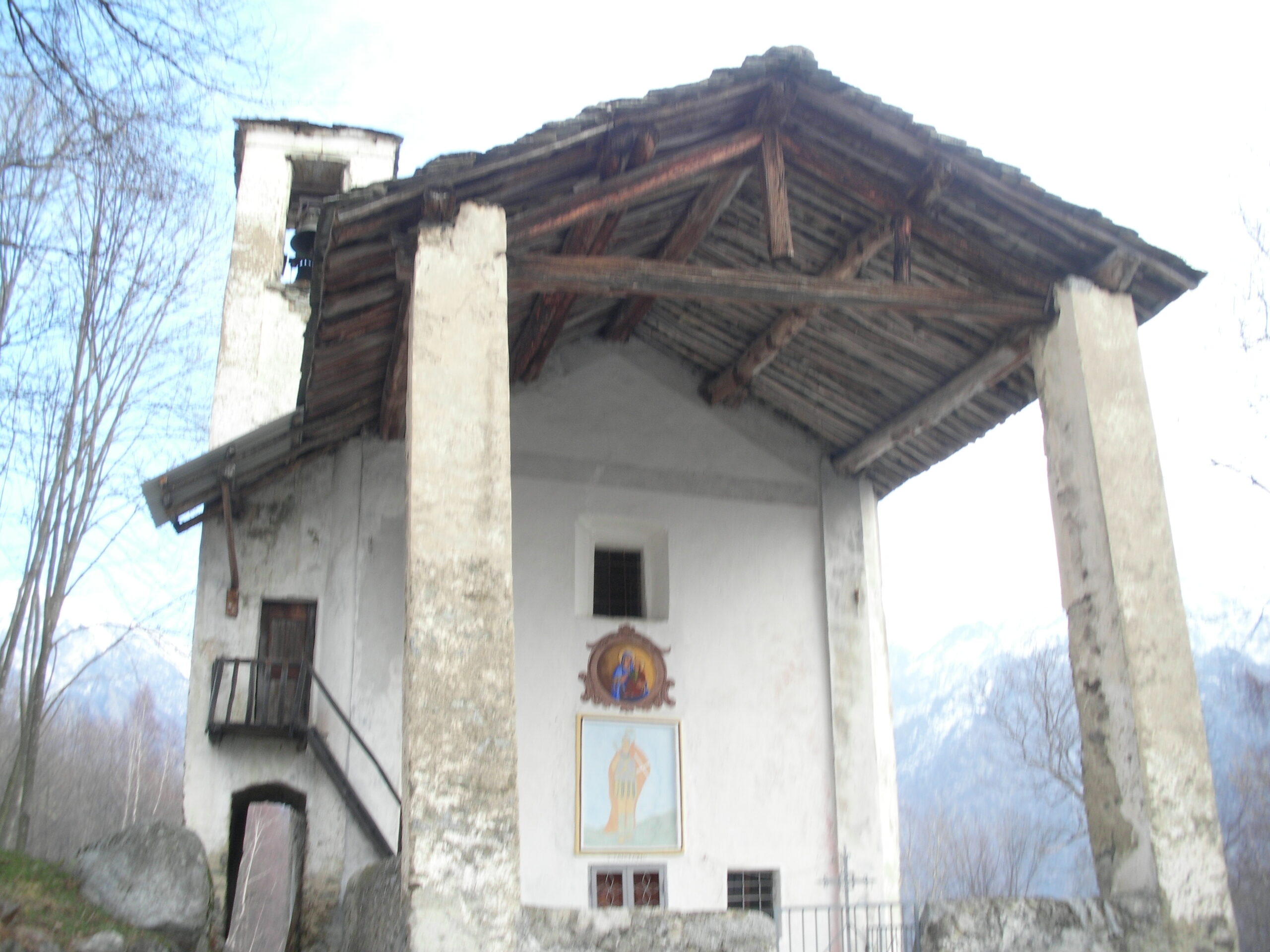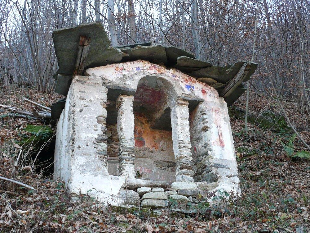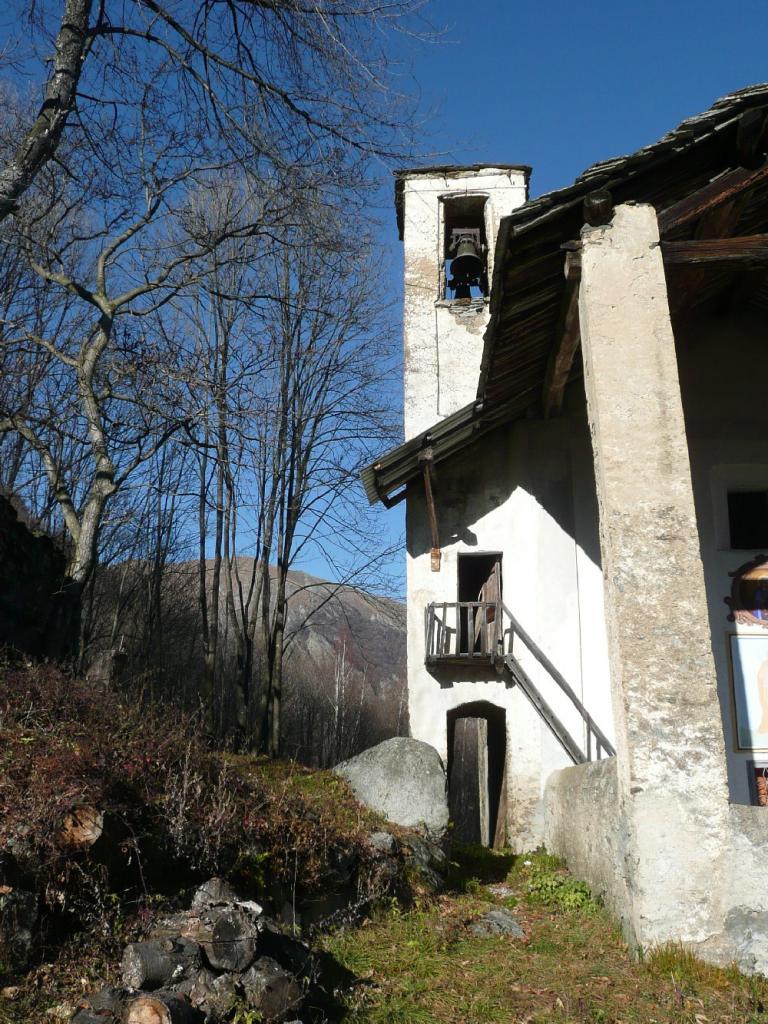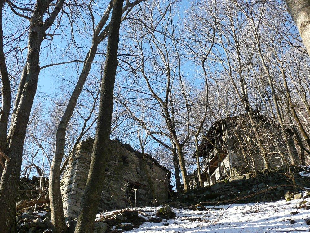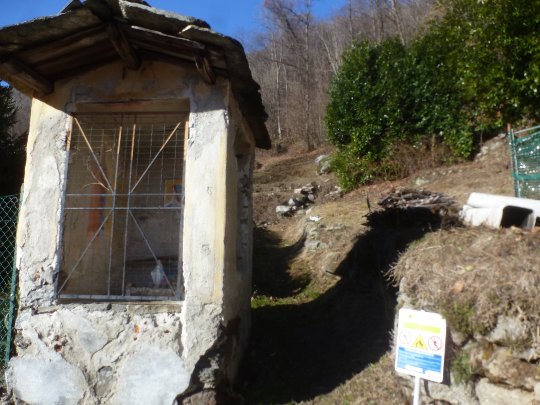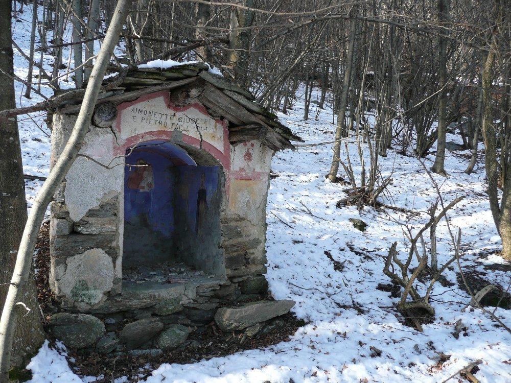 Ora all’altezza dei resti dell’invaso arriva una recente poderale di servizio per gli impianti di ricaduta delle acque per la sottostante centrale, il percorso prosegue sulla nuova poderale (il sentiero è praticamente scomparso per un lungo tratto siano a giungere ad un tornate a dx e superandolo di poco a dx si trova il sentiero che entra di li a poco nel borgo, ormai del tutto abbandonato di Costa 1005 m con al chiesetta di San Grato, piccola e spartana (risalente a prima del 1700) di qui per il sentiero che attraversa verso valle le case si ritorna a brevissimo sulla poderale che si segue fino al secondo tornante verso sx dove si trova di nuovo il sentiero (tacche gialle) che consente di tagliare per 2 volte la strada pressochè nello stesso punto (cartina MU perfetta) sino alla sbarra di divieto di accesso alla borgata Budrer 770 m che si compone un caratteristico gruppo di piccole case che si affacciano su un unico cortile chiuso da un antico portone, all’esterno delle case si trova la più piccola chiesetta di Sparone dedicata a di S. Pietro in Vincoli (notizie dal 1729). dopo 300 m altro taglio della poderale per evitare un tornante –
