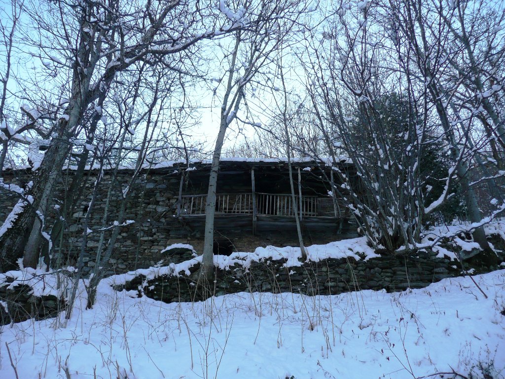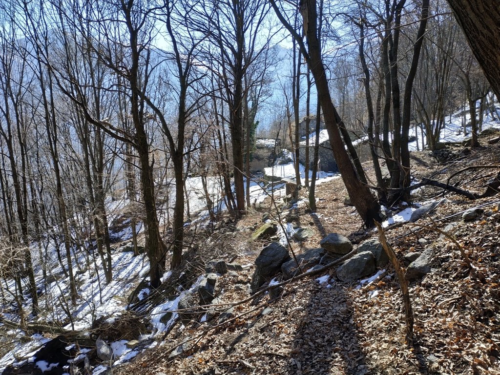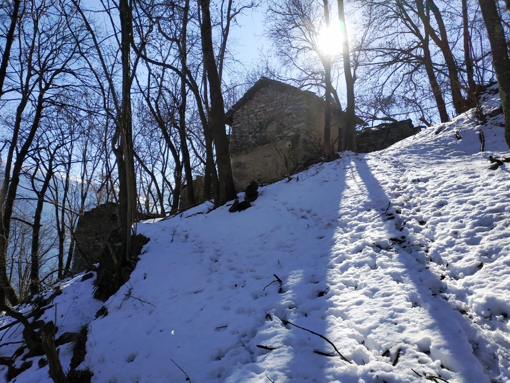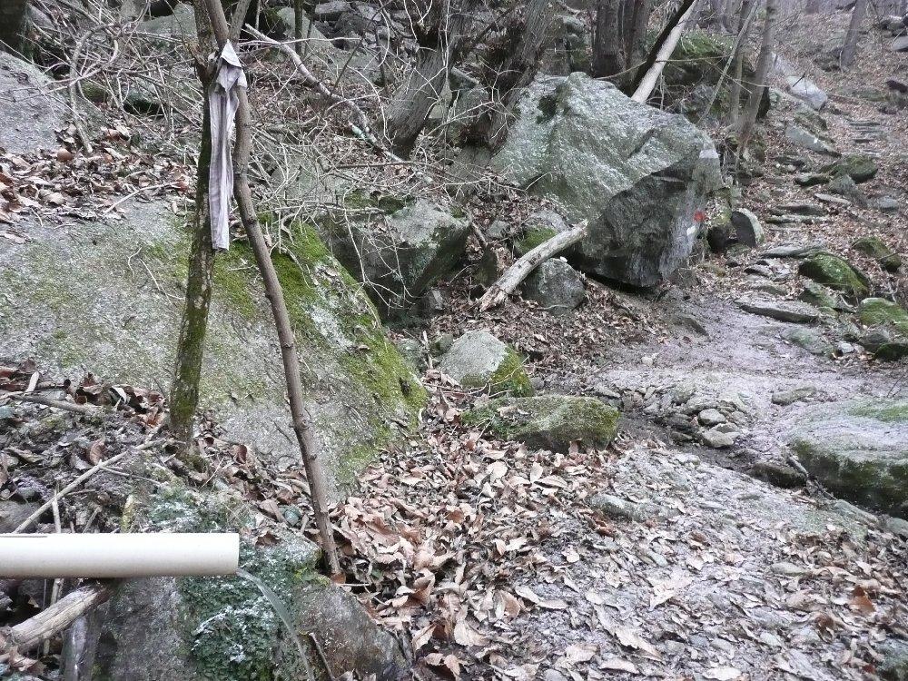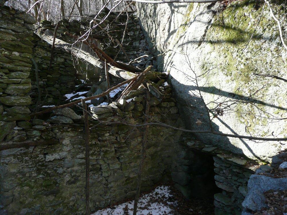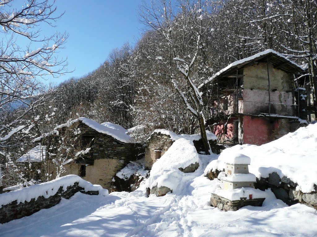 Ora all’altezza dei resti dell’invaso arriva una recente poderale di servizio per gli impianti di ricaduta delle acque per la sottostante centrale, il percorso prosegue sulla nuova poderale (il sentiero è praticamente scomparso per un lungo tratto siano a giungere ad un tornate a dx e superandolo di poco a dx si trova il sentiero che entra di li a poco nel borgo, ormai del tutto abbandonato di Costa 1005 m con al chiesetta di San Grato, piccola e spartana (risalente a prima del 1700) di qui per il sentiero che attraversa verso valle le case si ritorna a brevissimo sulla poderale che si segue fino al secondo tornante verso sx dove si trova di nuovo il sentiero (tacche gialle) che consente di tagliare per 2 volte la strada pressochè nello stesso punto (cartina MU perfetta) sino alla sbarra di divieto di accesso alla borgata Budrer 770 m che si compone un caratteristico gruppo di piccole case che si affacciano su un unico cortile chiuso da un antico portone, all’esterno delle case si trova la più piccola chiesetta di Sparone dedicata a di S. Pietro in Vincoli (notizie dal 1729). dopo 300 m altro taglio della poderale per evitare un tornante –