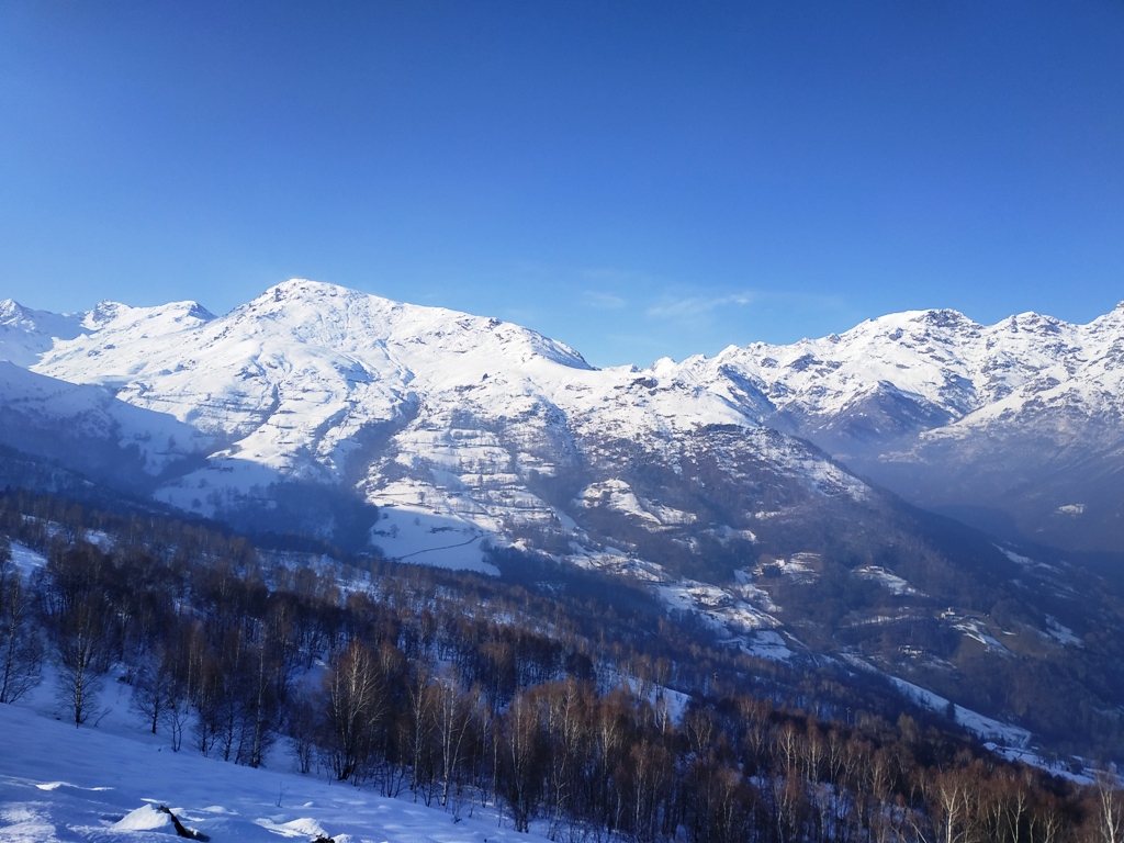 Partito da Inverso quota 750 circa, salito prima parte con gli scarponi, poi calzato le racchette intorno a quota 1000. Tagliato un paio di volte i tornanti della strada e passato da un parcheggio pieno. Molti ciaspolatori in giro, molte famiglie con bimbi, pochi con sci o tavola. Raggiunta la dorsale su ottimo pistone, ho percorso il tratto in piano fino alle ultime baite. Strappo finale di 200 m in mezzo alla bufera totale: altri annaspando salivano vicino a me, ma giunto in cima, dopo non poche difficoltà, mi sono guardato intorno e non c’era più nessuno. Pochi istanti accovacciato nei pressi della croce per fare una foto e poi giù di corsa: lì non si poteva stare. Percorsa tutta la dorsale fino alla statua intitolata “Nostra signora di Palestina” e poi da lì chiuso il simpatico, anche se pur breve, giro a “8”. Nonostante la quota molto bassa, il vento si è fatto sentire anche qui.