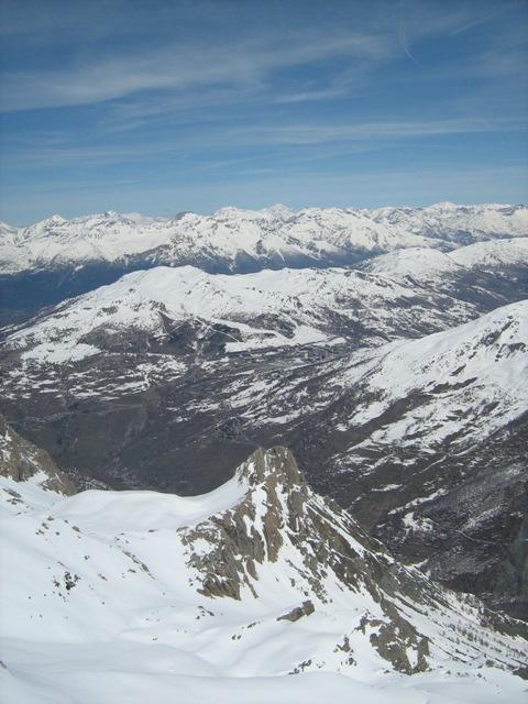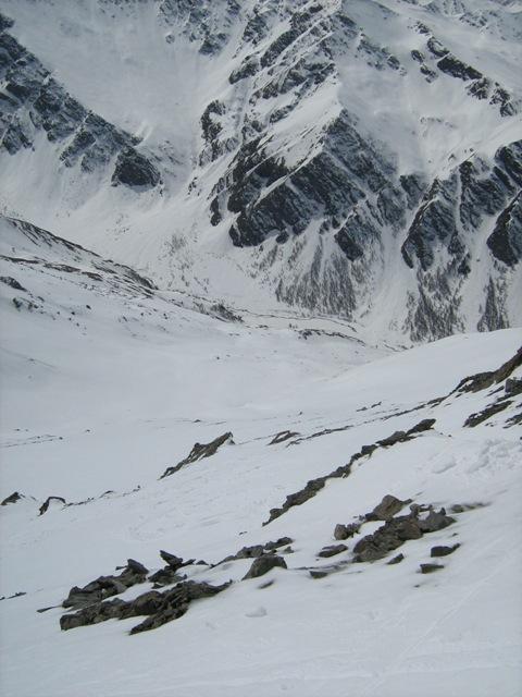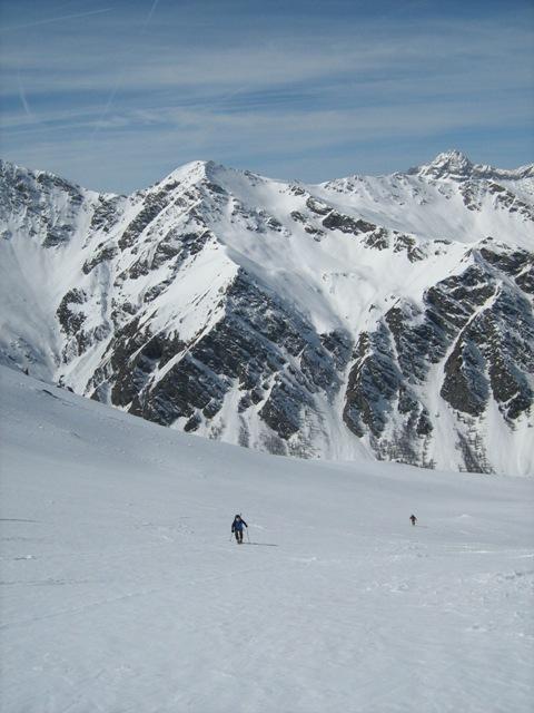 Lunga sosta per riposarci e per ammirare lo splendido panorama e discesa iniziata alle 12.45…un po’ di crosta nei primi 50 metri poi firn splendido fin quasi al fondo…in particolare perfetta la parte centrale dove la neve aveva mollato al punto giusto…solo negli ultimi 100 metri in qualche punto si sfondava un po’. Poi dal ponte in giù un lungo ed estenuante trasferimento…nella parte alta si spinge abbastanza, mentre in basso, essendoci meno neve, la strada risulta più scorrevole e veloce.