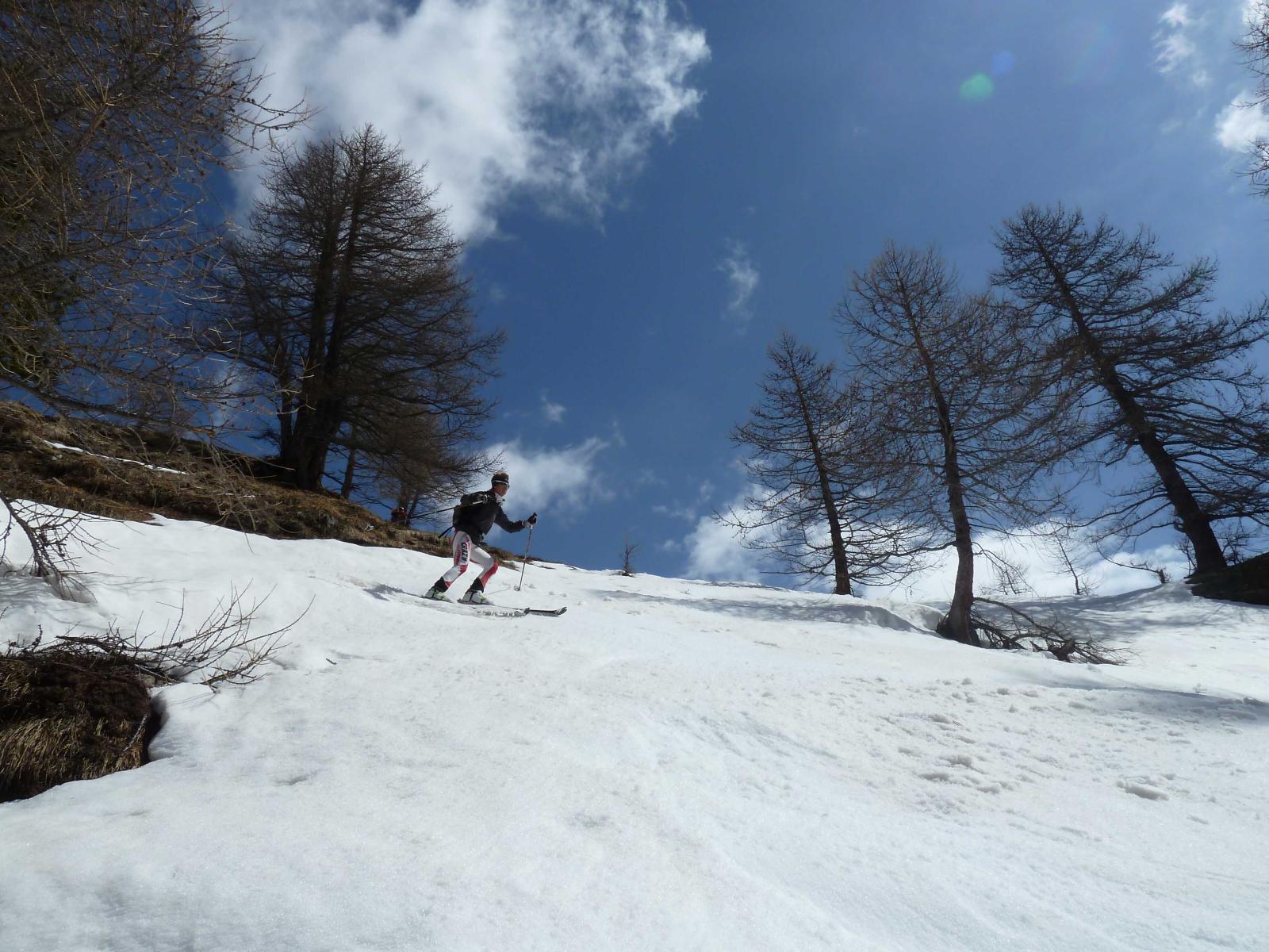 Strada aperta fino a Ruilles ma noi abbiamo rispettato il divieto e siamo partiti da Thures. Ringraziamo vivamente Maciste156 e Chichin per l’imbeccata perchè oggi la neve è stata veramente superlativa. Il buon rigelo notturno e la neve recente già ben trasformata ci hanno regalato una magnifica discesa. Oggi si sciava sul velluto e gli sci giravano da soli. Neve un pò al limite sui ripidi pendii sopra il ponte di Ciatagnera ma sfruttando le lingue di neve si passa per ora ancora agevolmente. Scorrevole anche la strada fino a Ruilles.