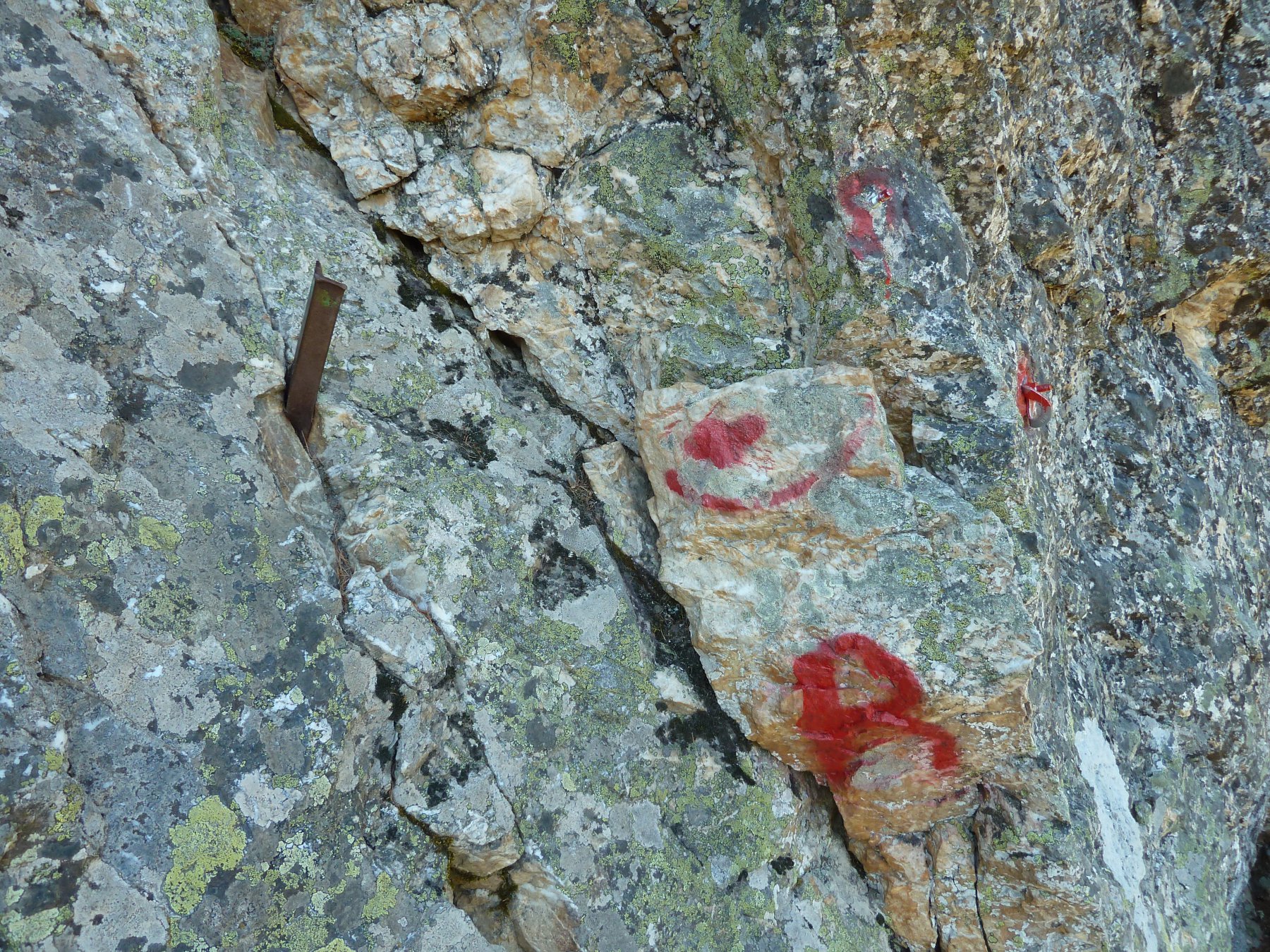 Terreno d’avventura o quasi, sono presenti molti bolli rossi lungo tutta la via (non ci si può perdere, sono addirittura segnati i massi dove posizionare le fettucce..direi un po’ eccessivo) attrezzatura della via: al momento direi un mix tra vecchio e nuovo: chiodi, barre di varia natura e utilizzo e qualche spit – n.b.gli spit sono stati in parte asportati in parte ribattuti non ne sono sopravvissuti molti. Si può integrare con frend medi.