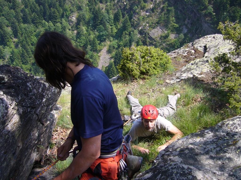 Oggi con Silvio che voleva fare una via rilassante (ieri era il suo compleanno ed e’ la prima volta che scala quest’anno) e che al secondo tiro sognava gia’ la birra… e con Diego che non ha letto bene la relazione di Fiorenzo in cui si dice che il camino va superato con “bella” arrampicata 🙂
