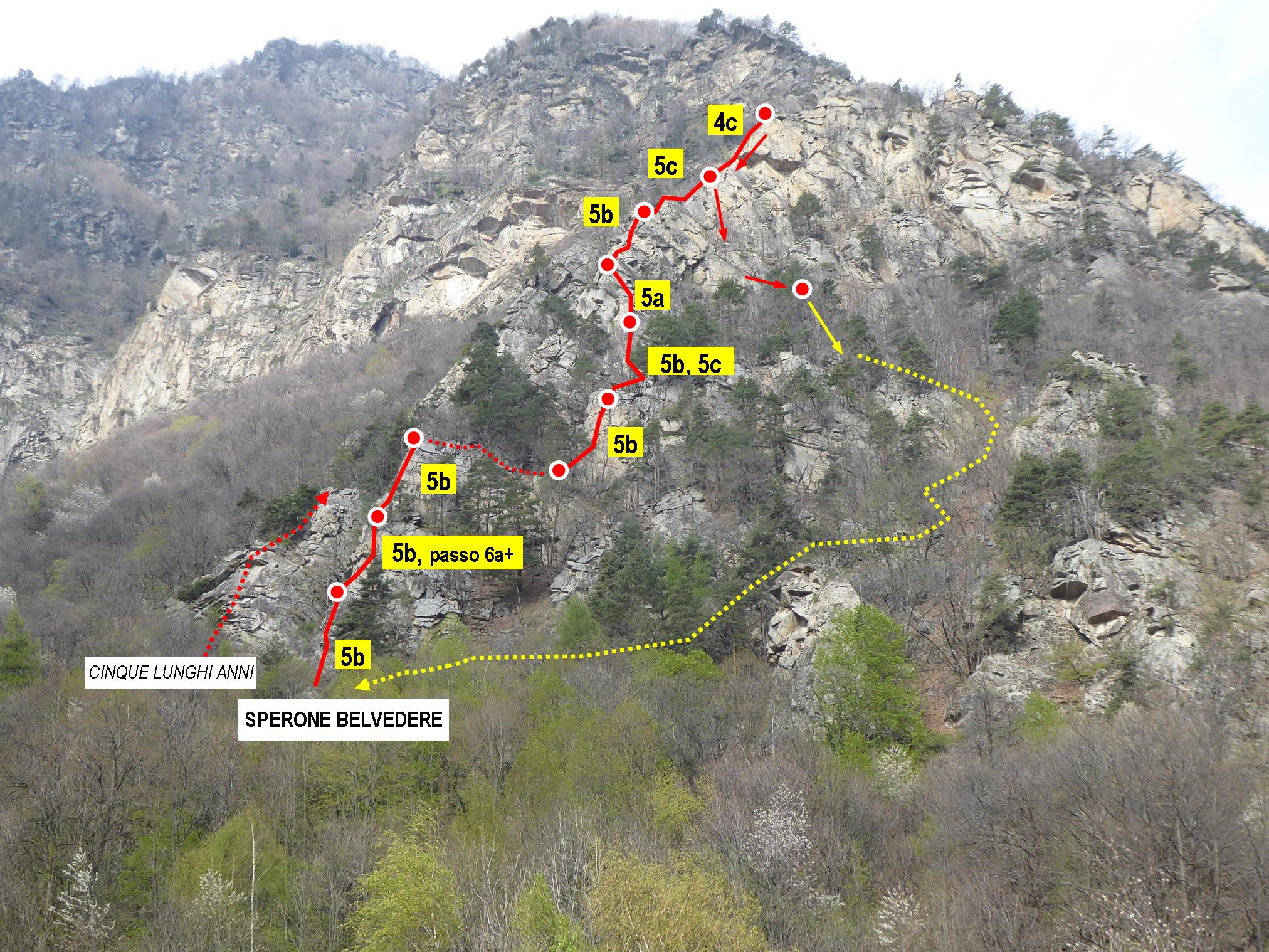 Abbandonare lo sperone principale e spostarsi in leggera discesa verso dx (bolli blu), fino alla base di uno speroncinoL4: salire in diagonale verso dx in una specie di diedro-camino con passo leggermente strapiombante; 5b
