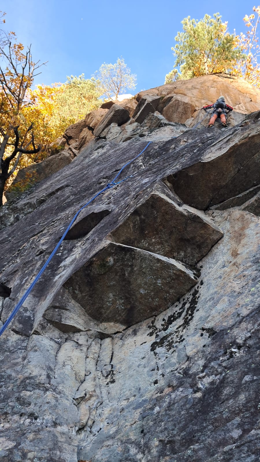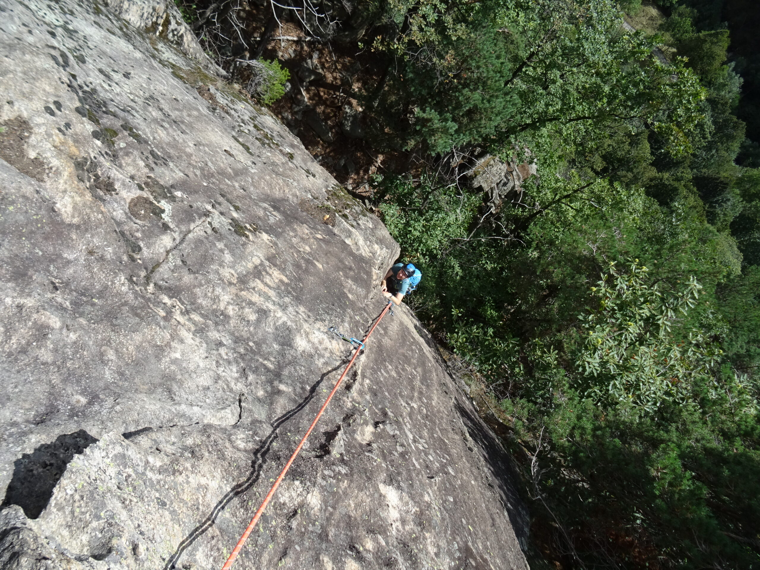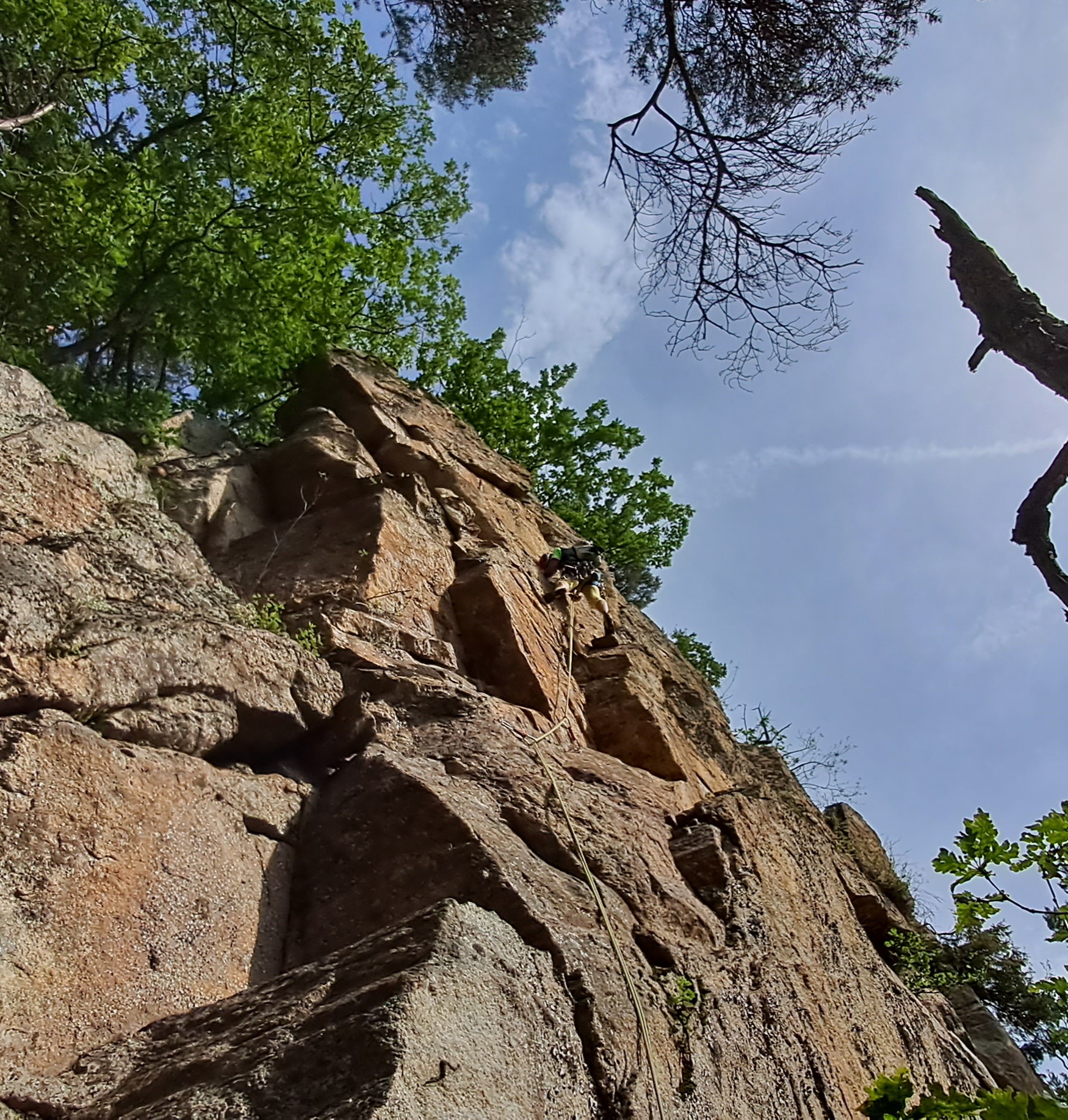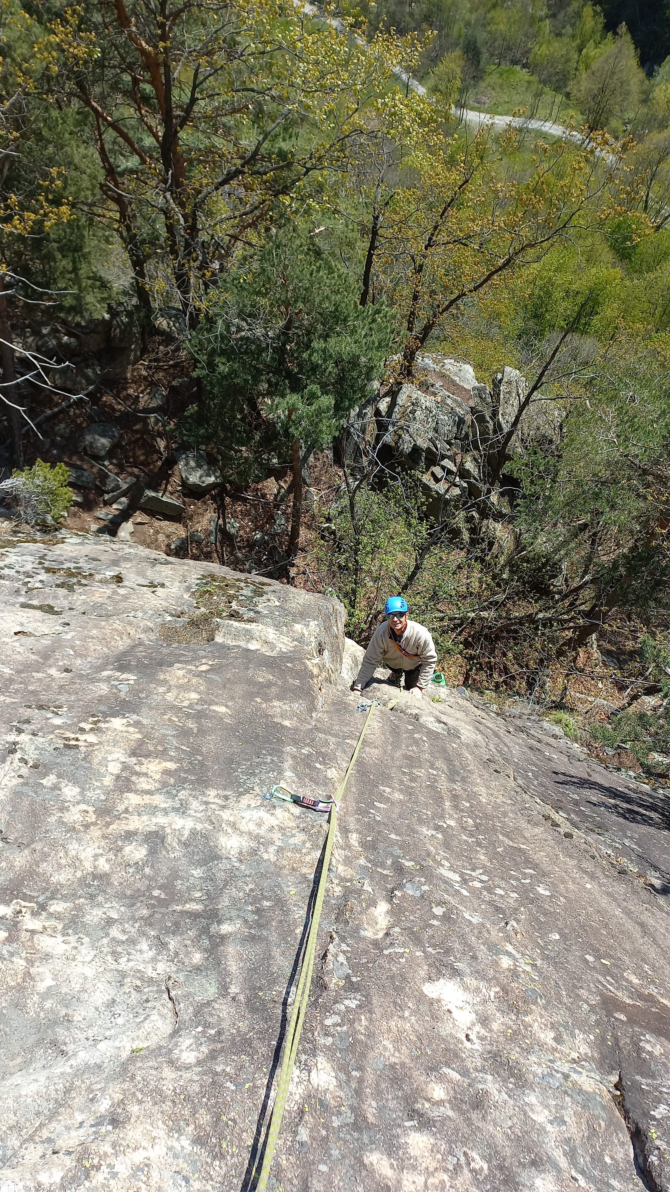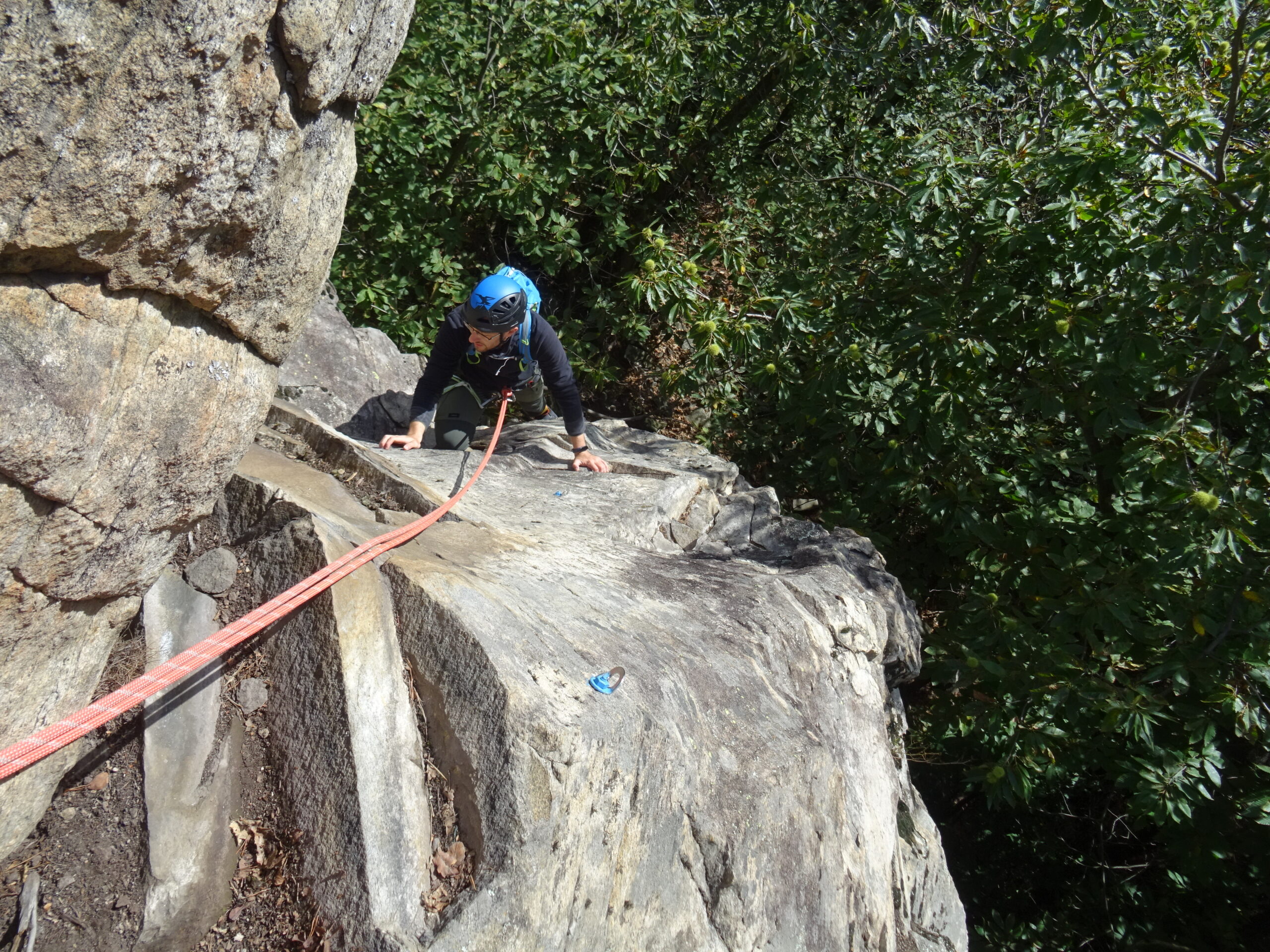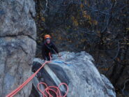 - L2: superare una placca sulla sx della sosta, quindi salire uno spigolino, un risalto più ripido (passo di 6a+) e quindi un muro arancione a grosse prese; 5b